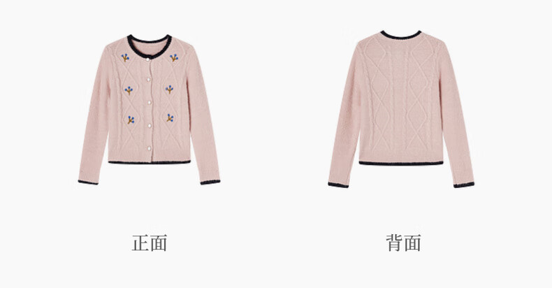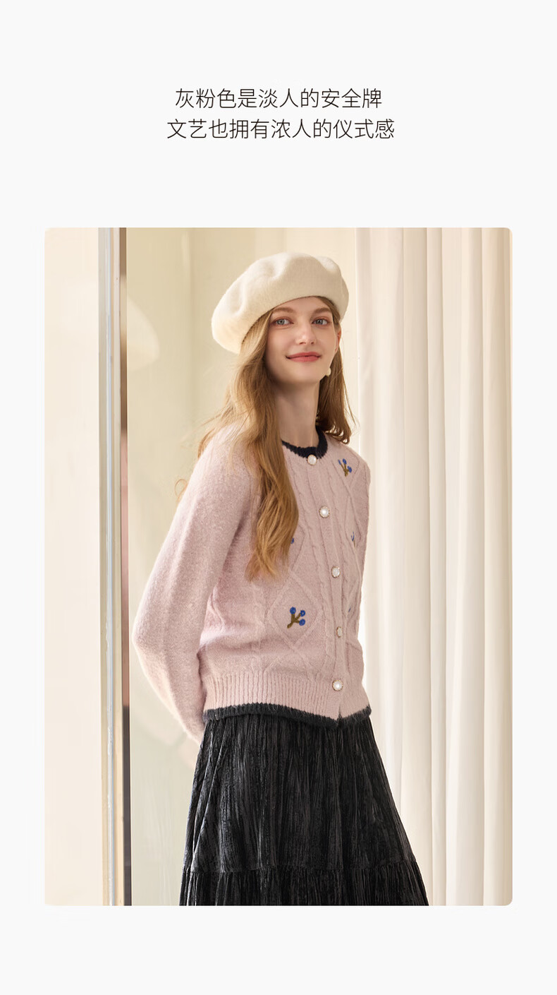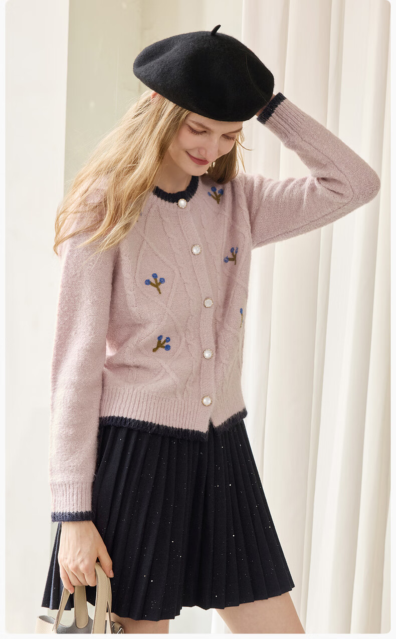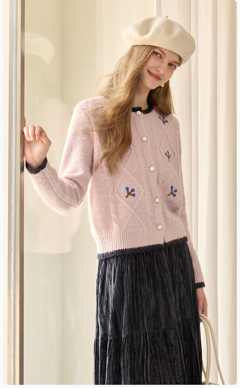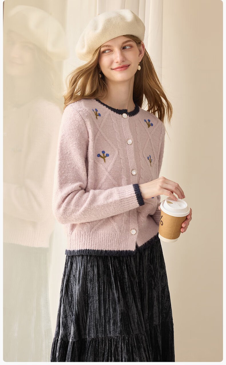 Xiangying Pink Cable Sweater Cardigan Women's 2025 Winter New Round Neck Wool Flower Short Knitted Jacket Gray Pink S 155/80A/85-95Jin Jin equals 0.5 kg