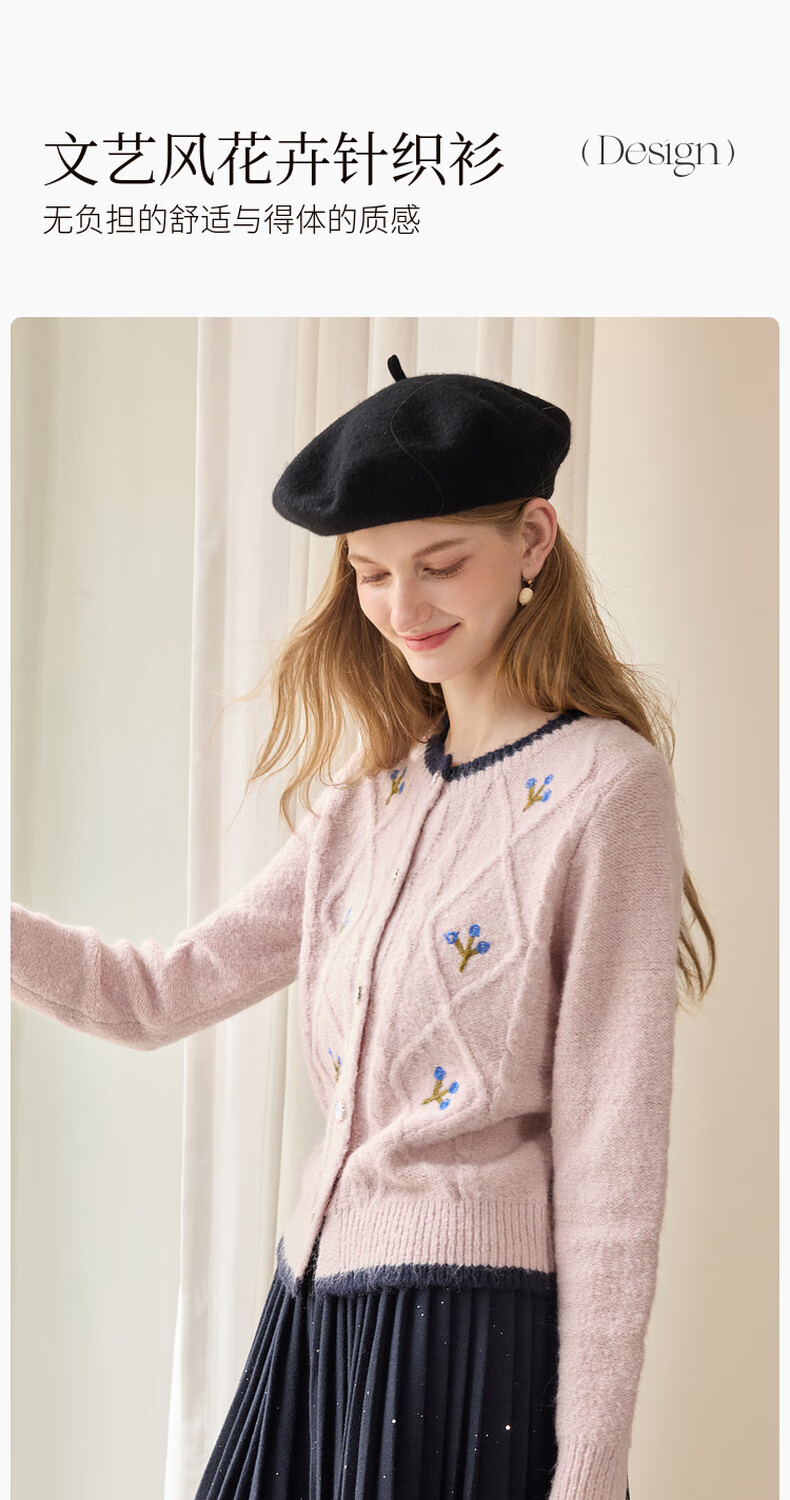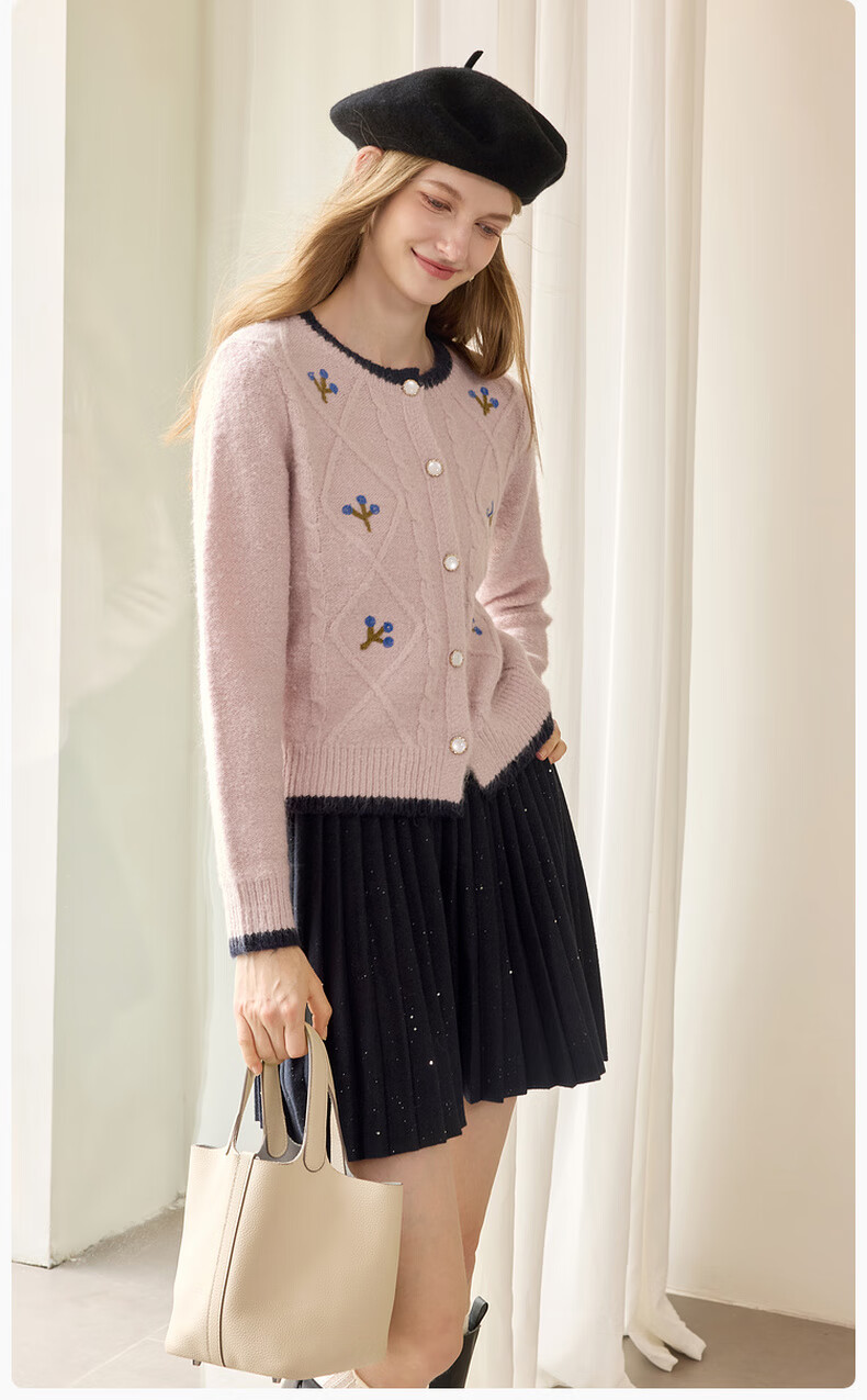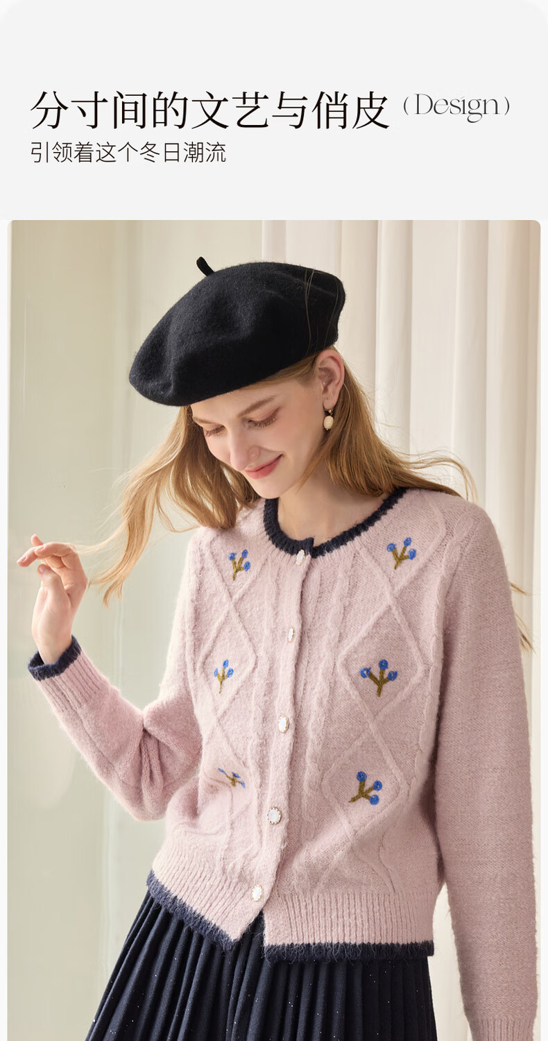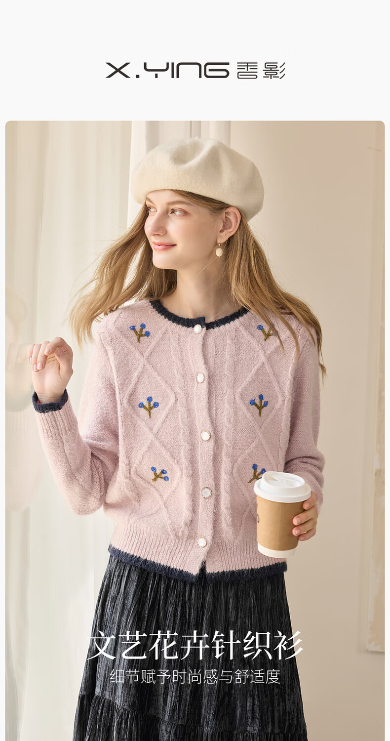 Xiangying Pink Cable Sweater Cardigan Women's 2025 Winter New Round Neck Wool Flower Short Knitted Jacket Gray Pink S 155/80A/85-95Jin Jin equals 0.5 kg