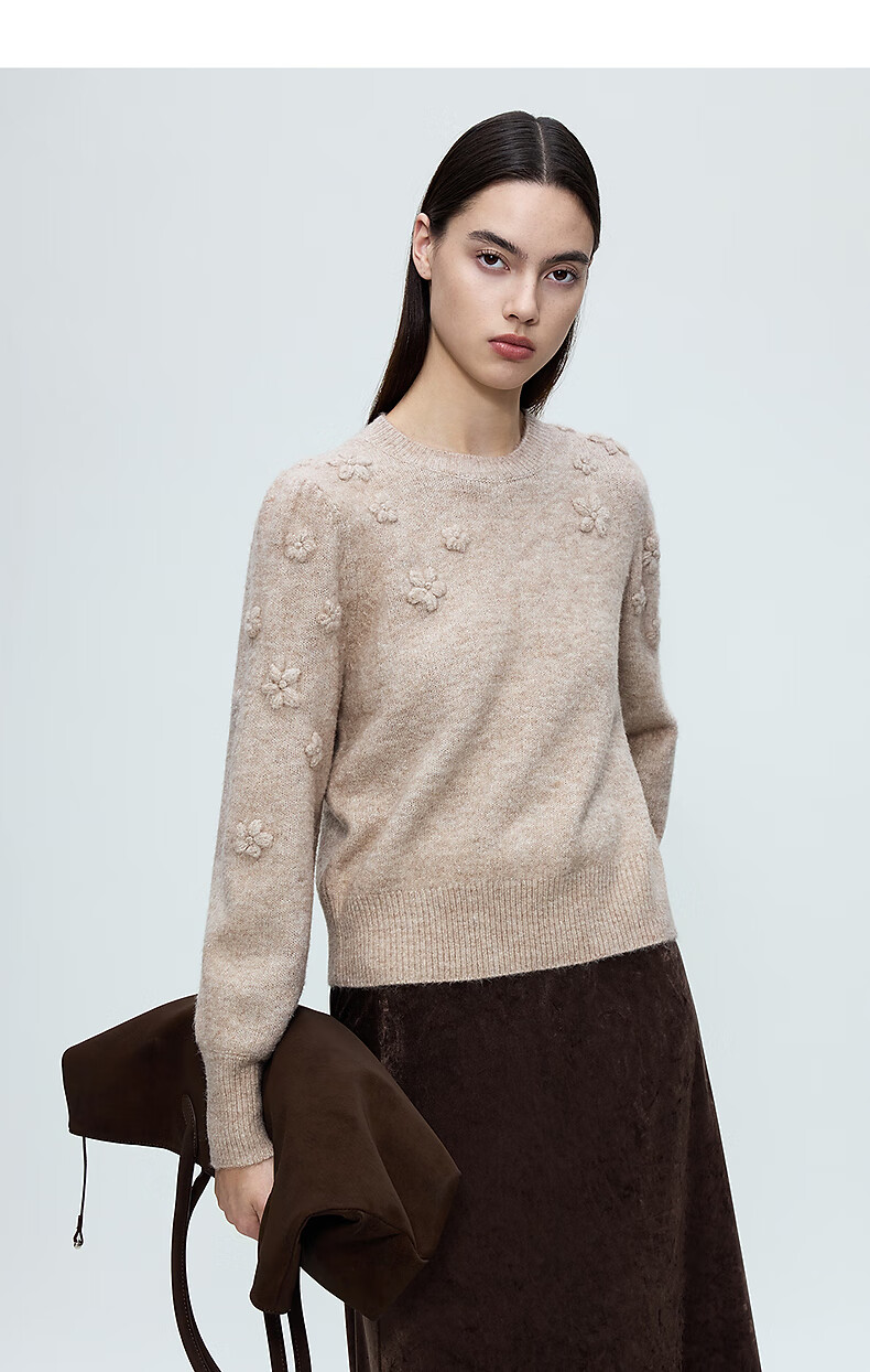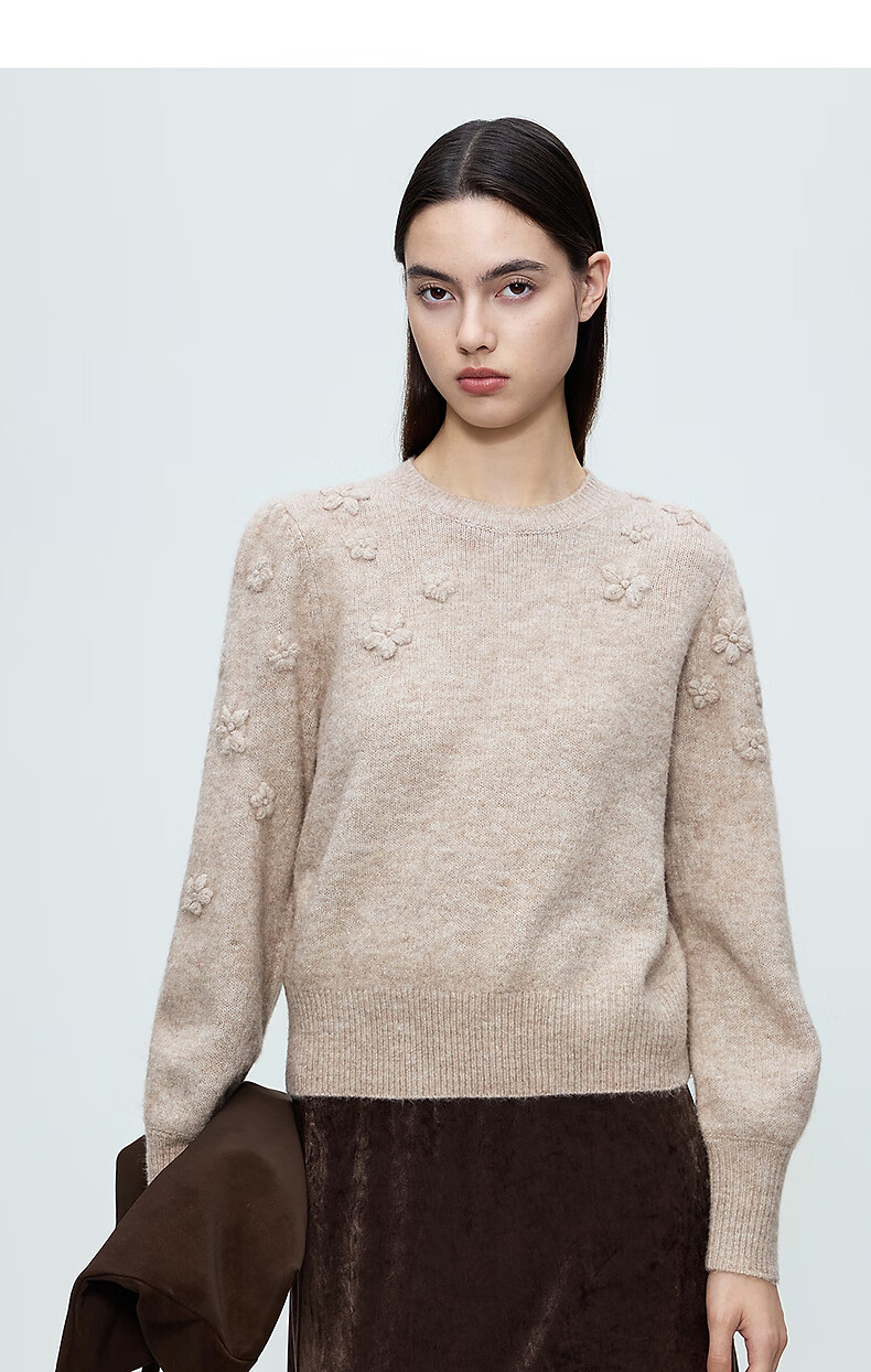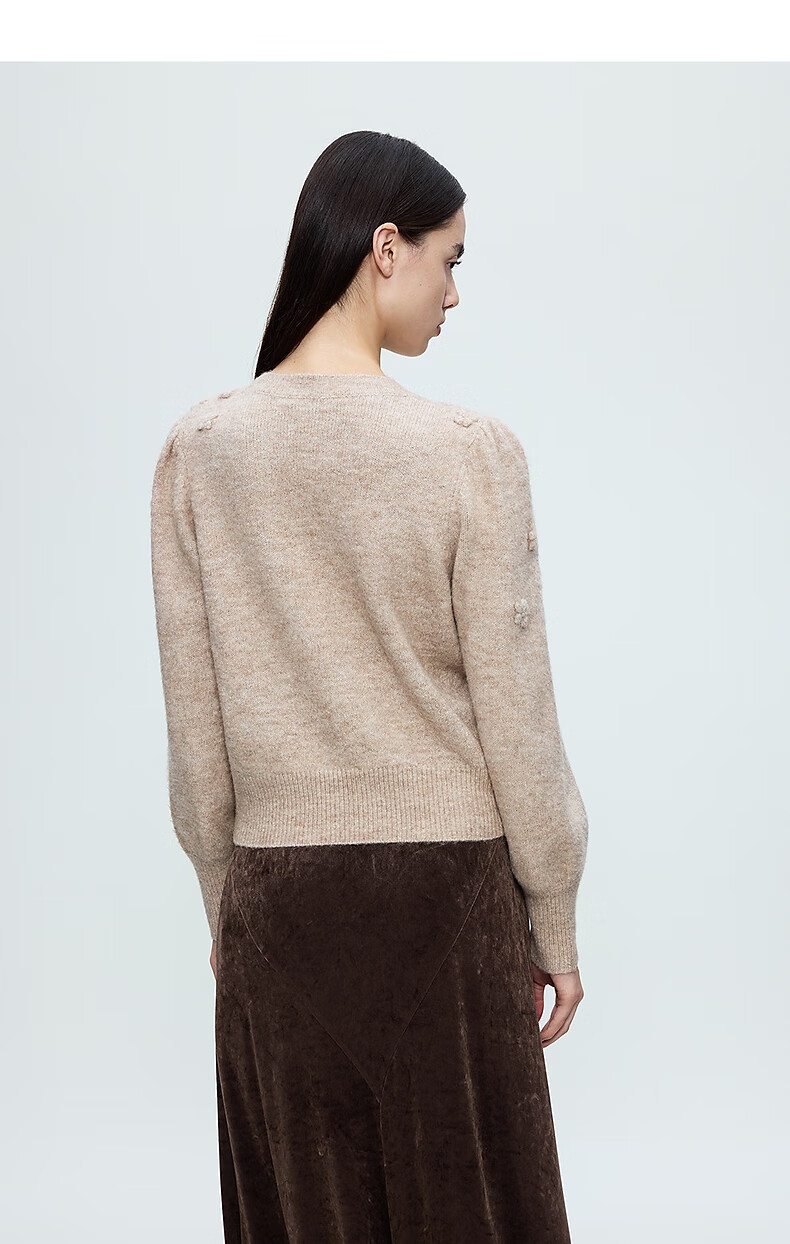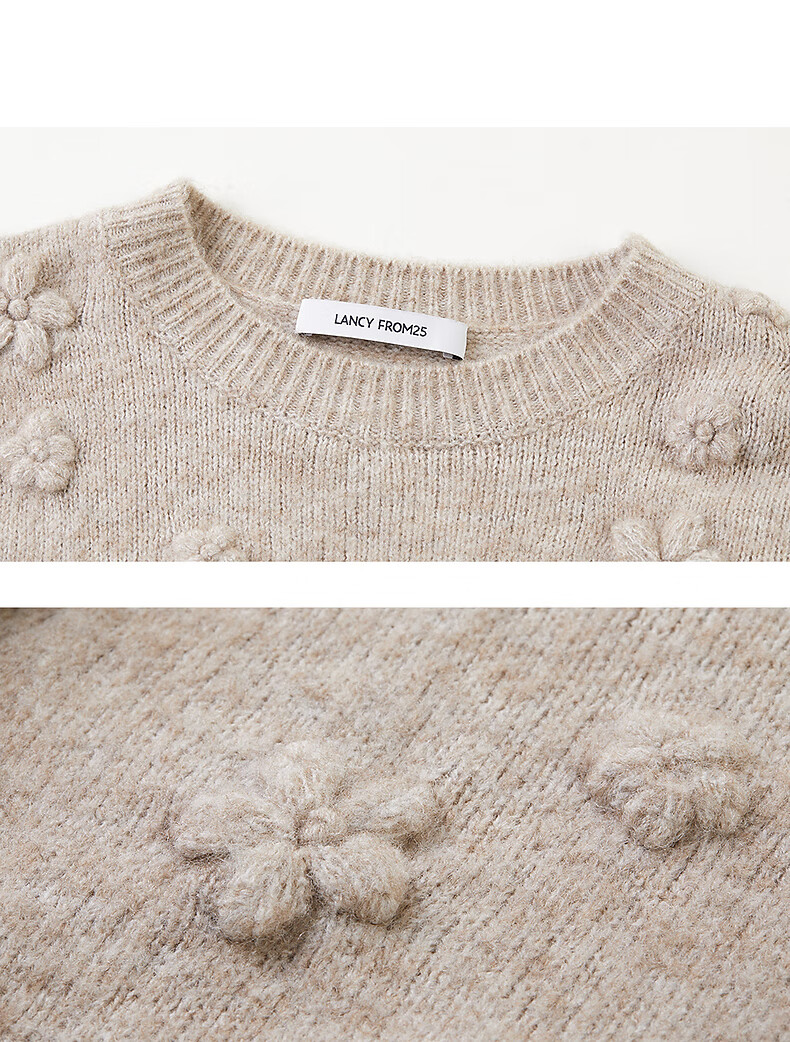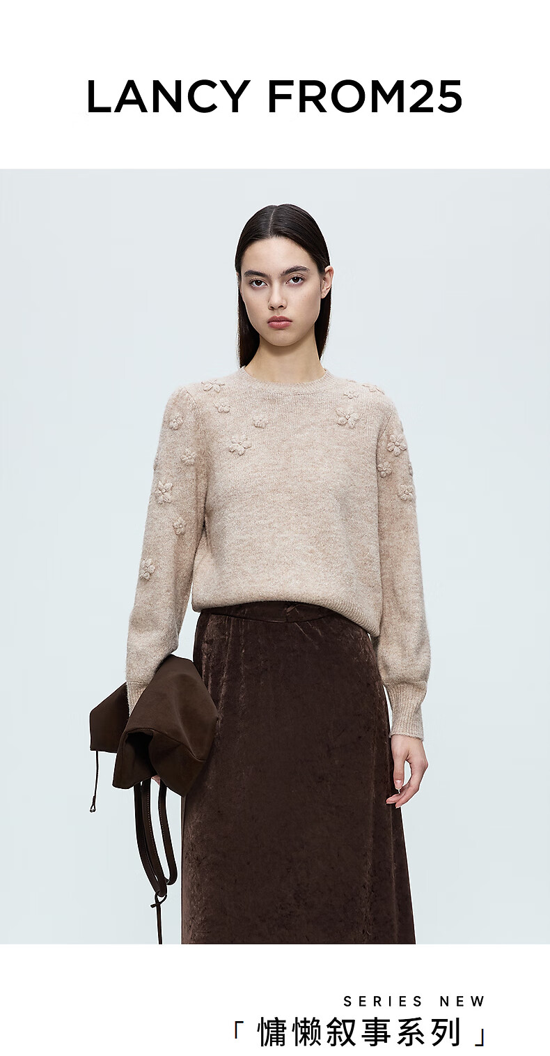 Langzi round neck French retro pullover sweater fashionable temperament commuter style sweater for women 2025 winter new style champagne beige S