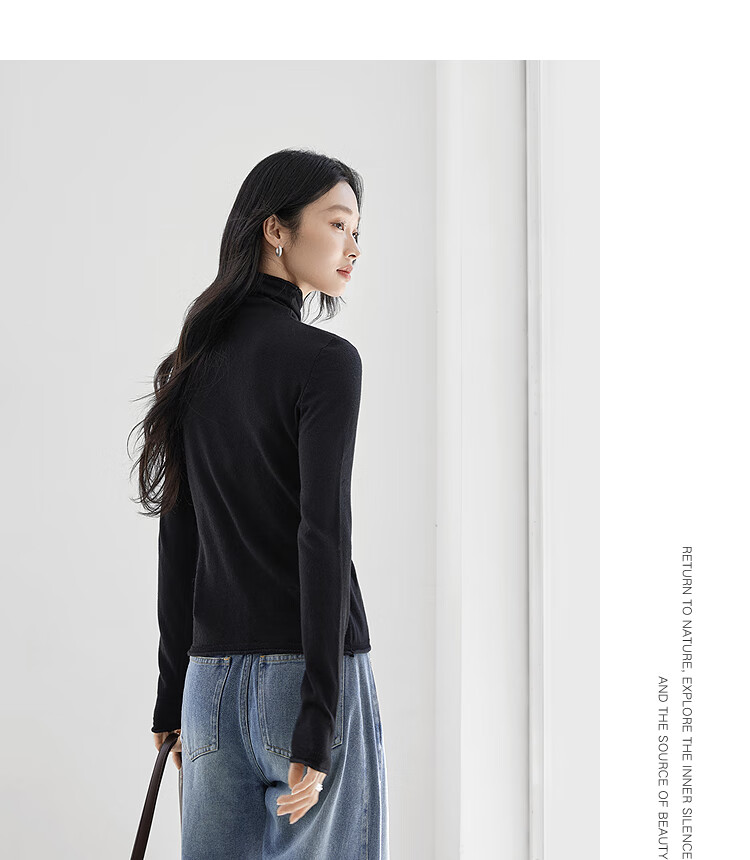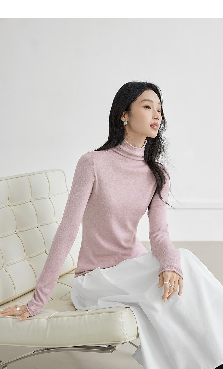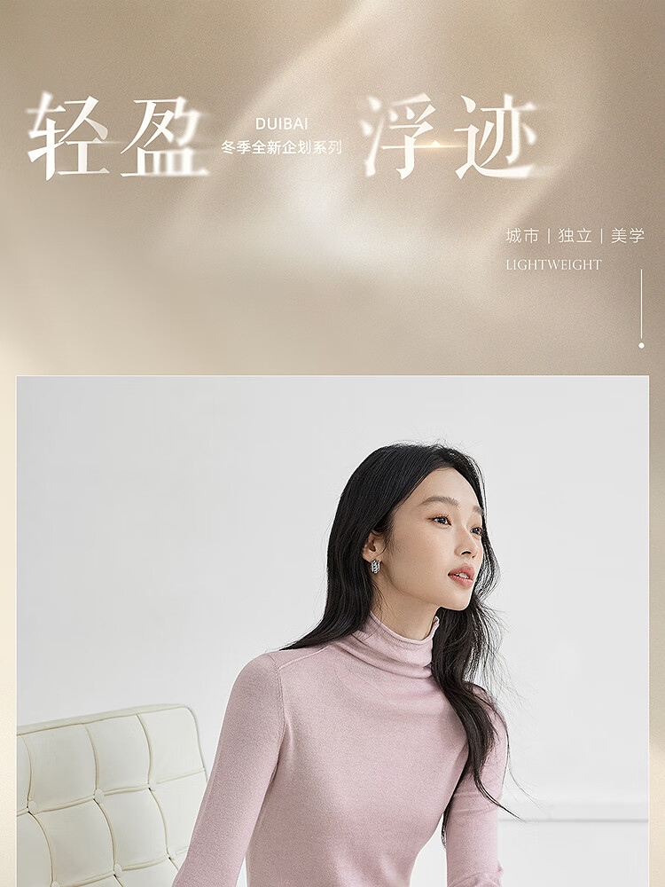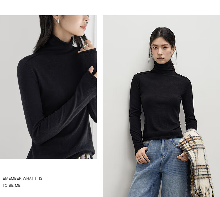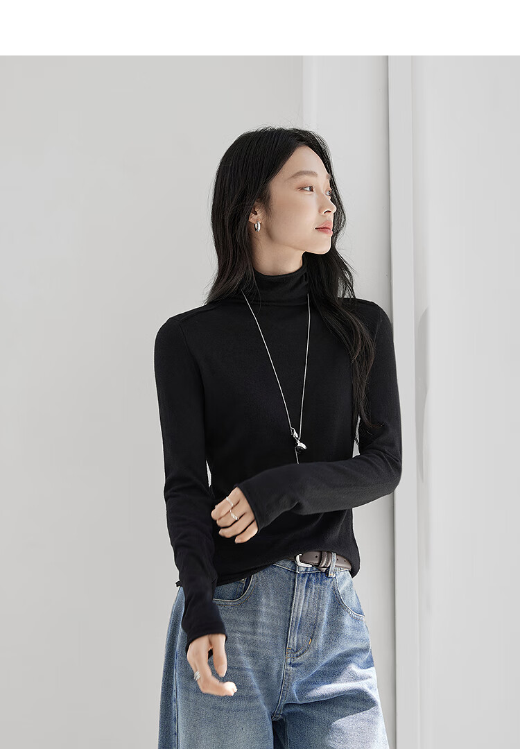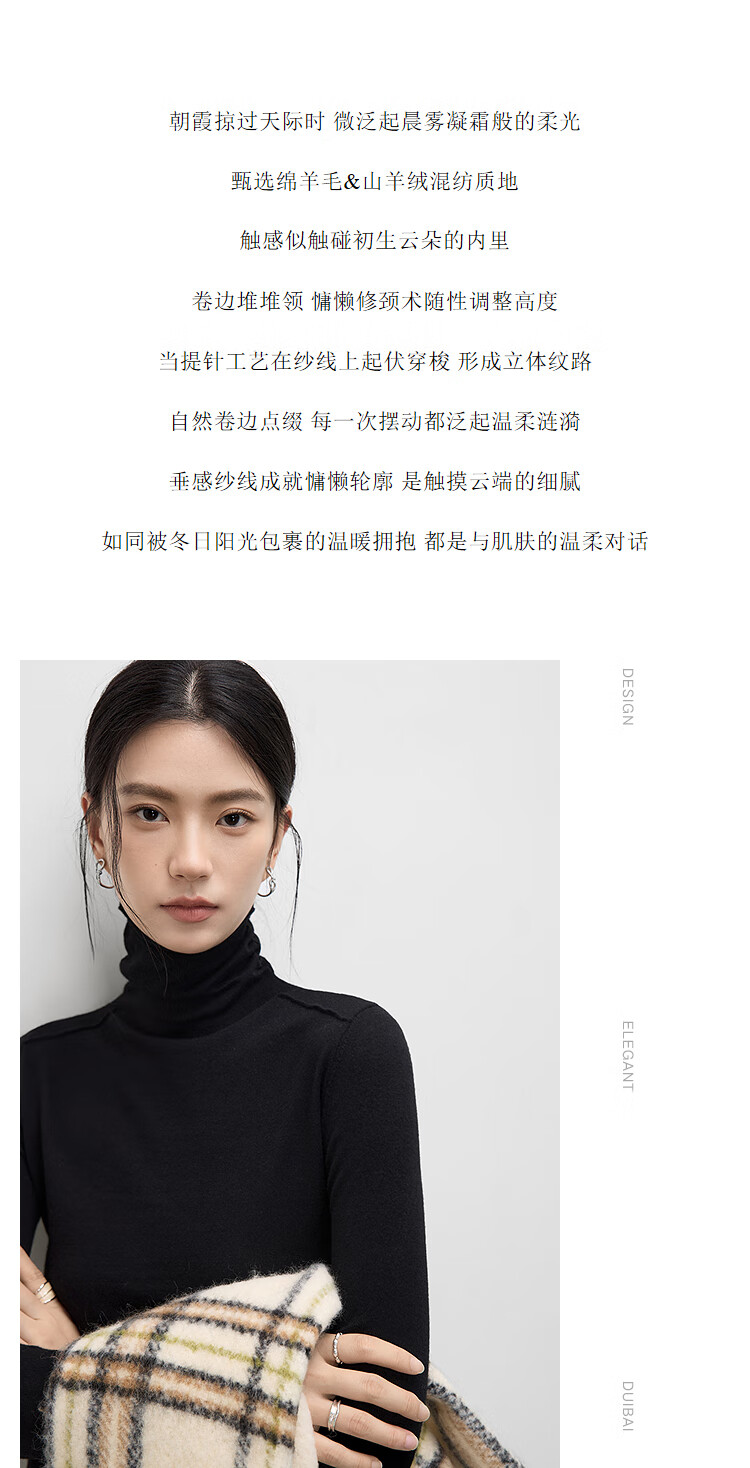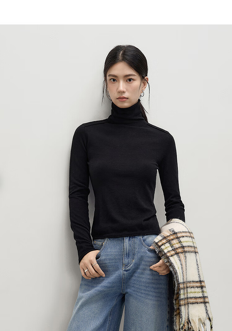 Dialogue (DUIBAI) cashmere + sheep wool solid color curled turtleneck sweater for women 2025 winter new knitted bottoming shirt, quiet black S
