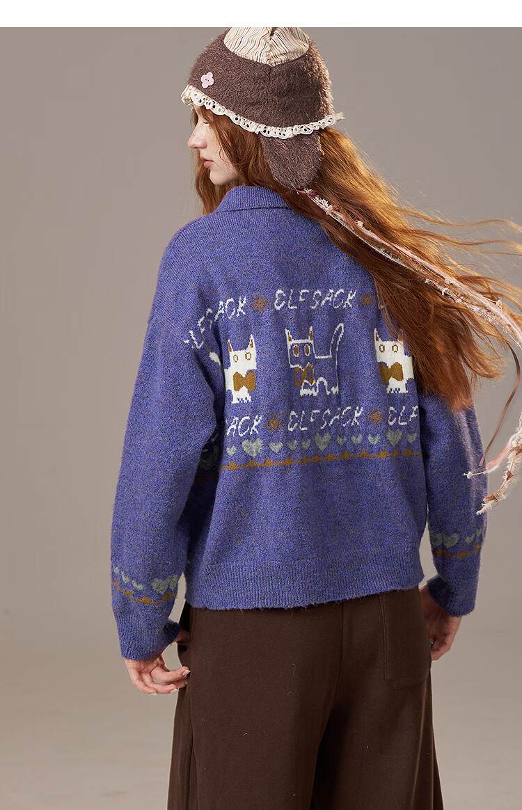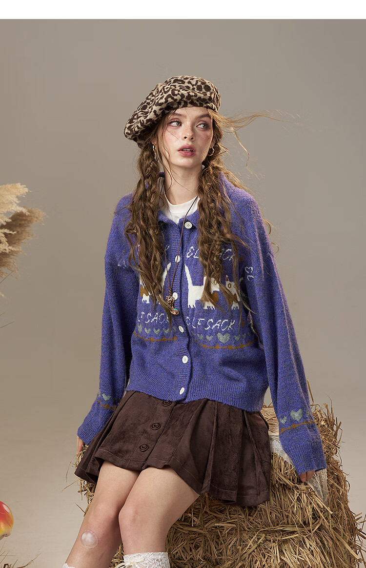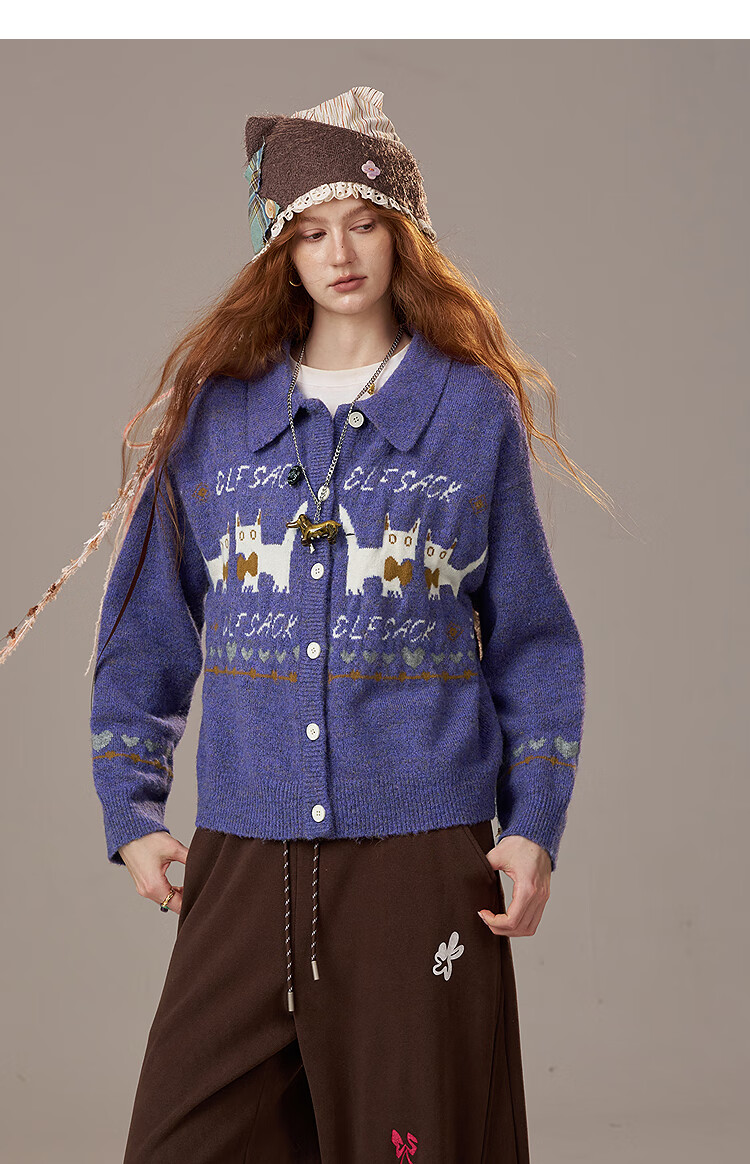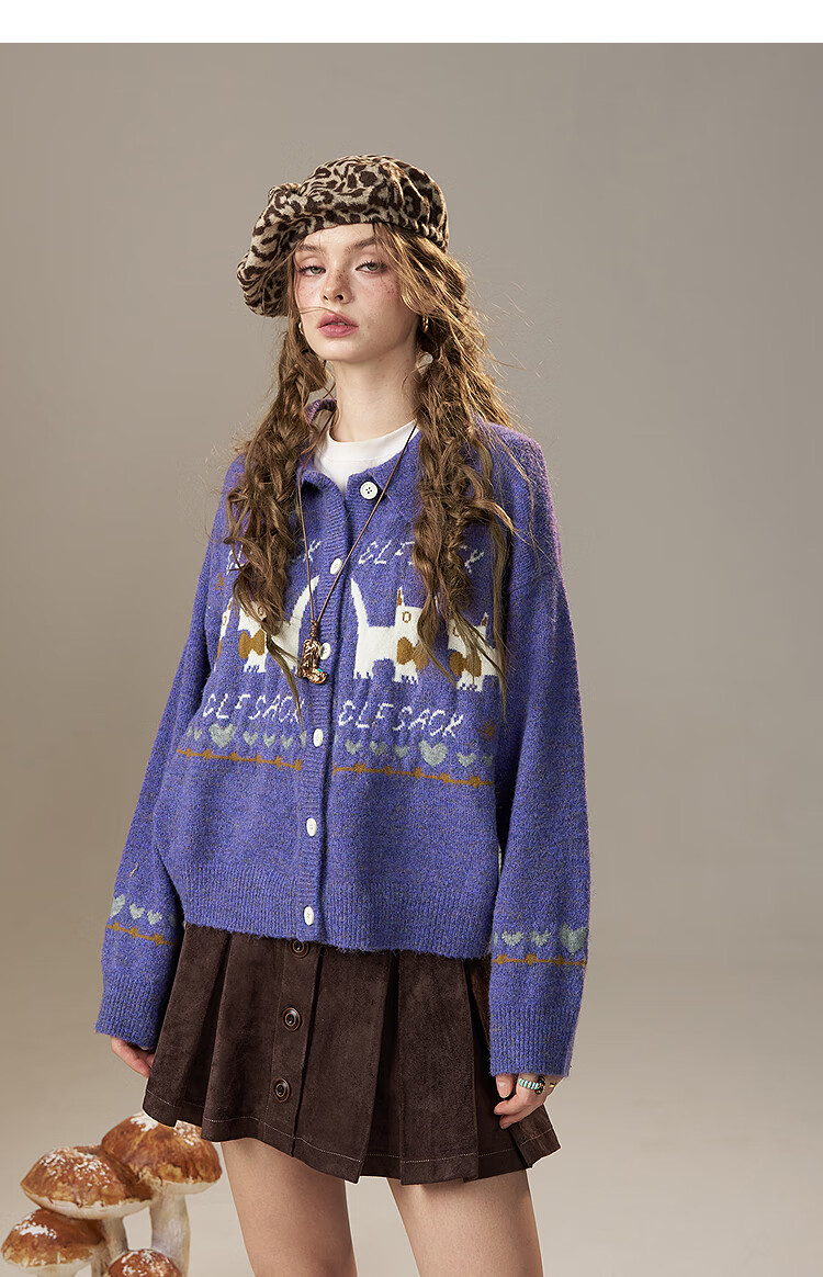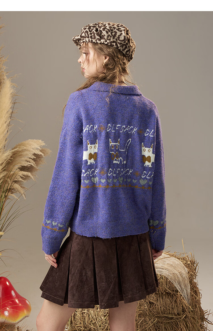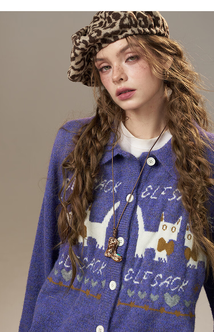 Leprechaun's Pocket Kitty Fair Isle Jacquard Cardigan Sweater Women's 2025 Autumn and Winter New Retro Lapel Mohair Retro Purple L