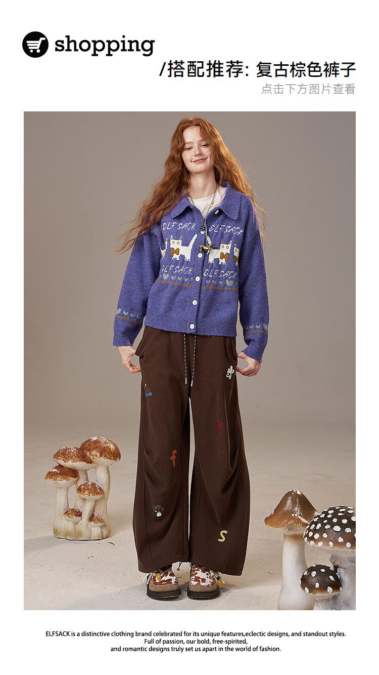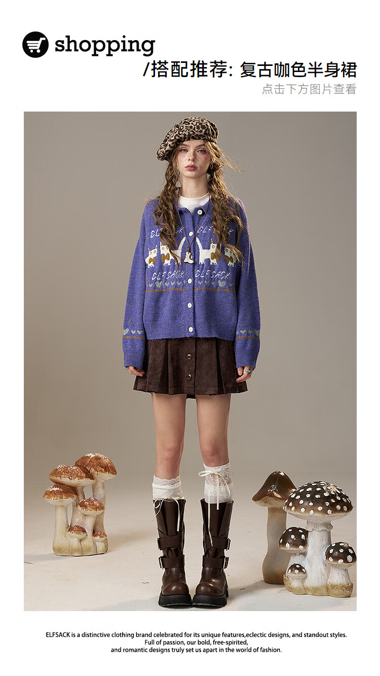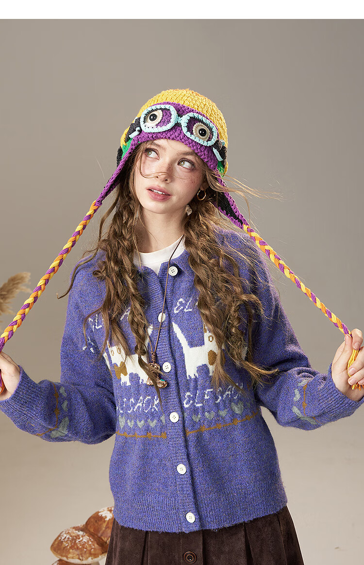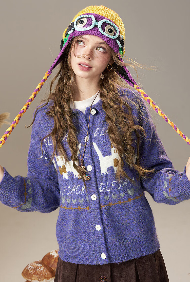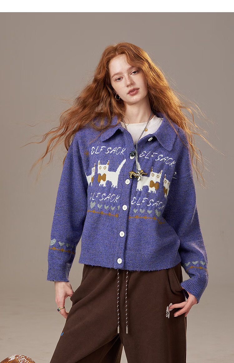 Leprechaun's Pocket Kitty Fair Isle Jacquard Cardigan Sweater Women's 2025 Autumn and Winter New Retro Lapel Mohair Retro Purple L