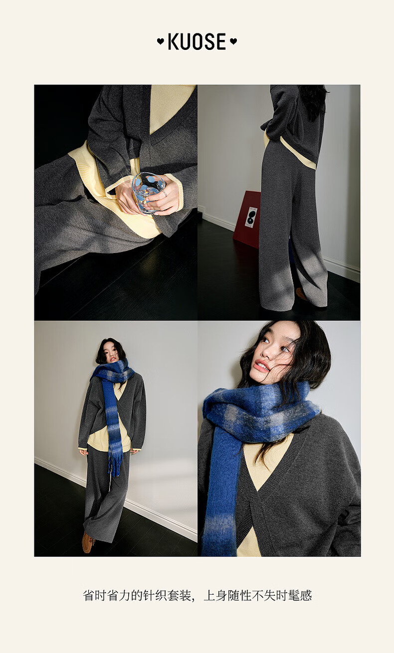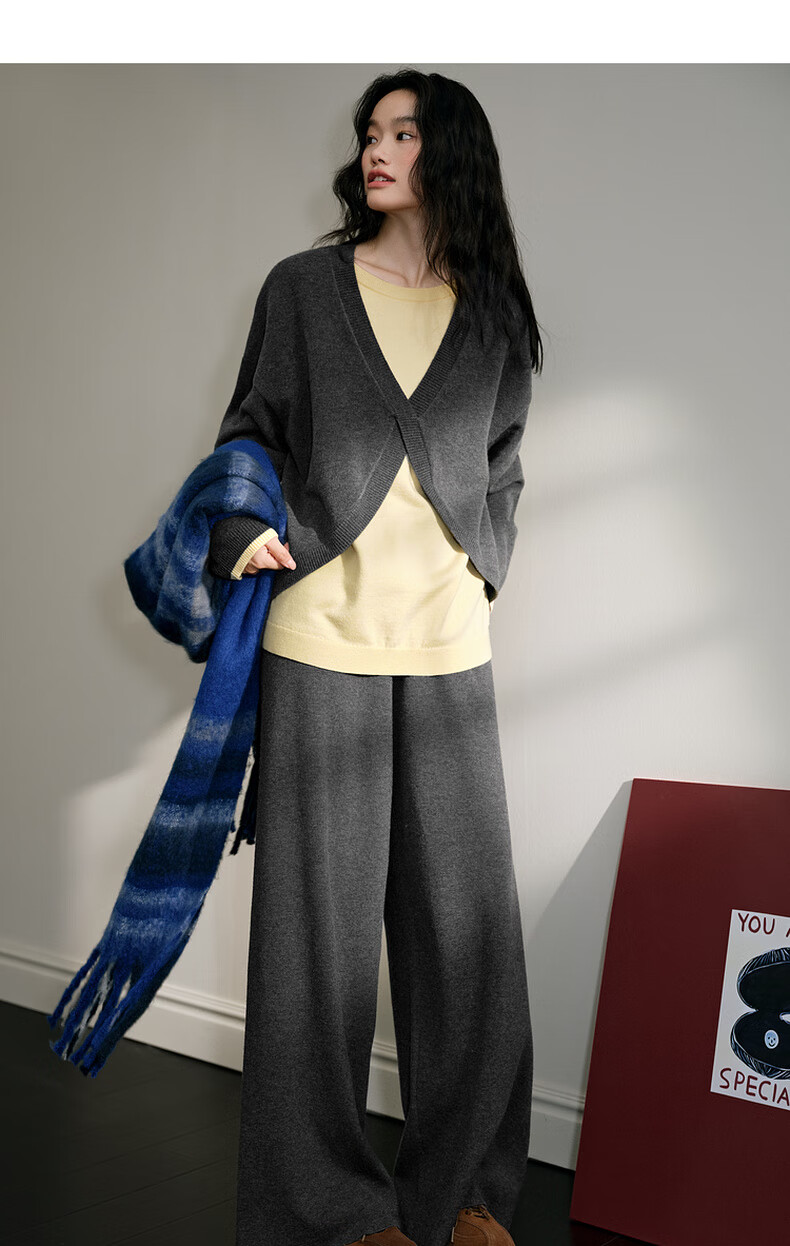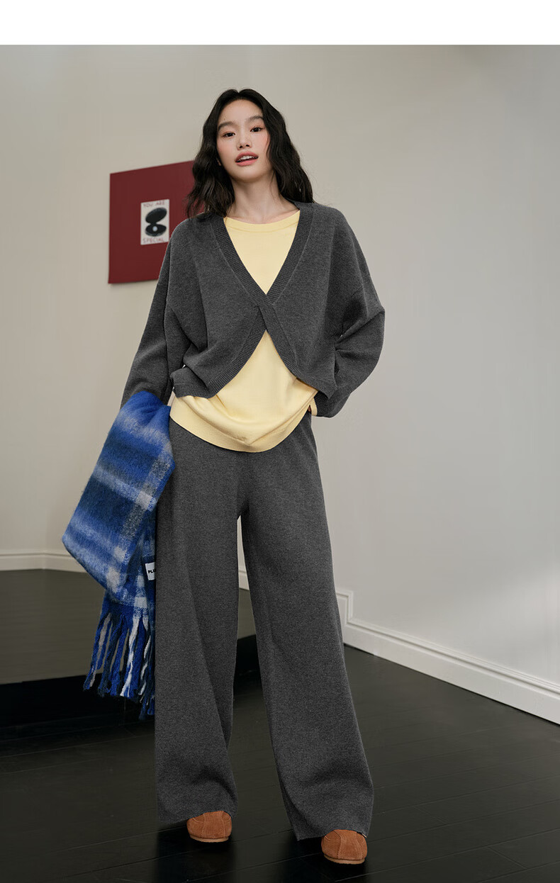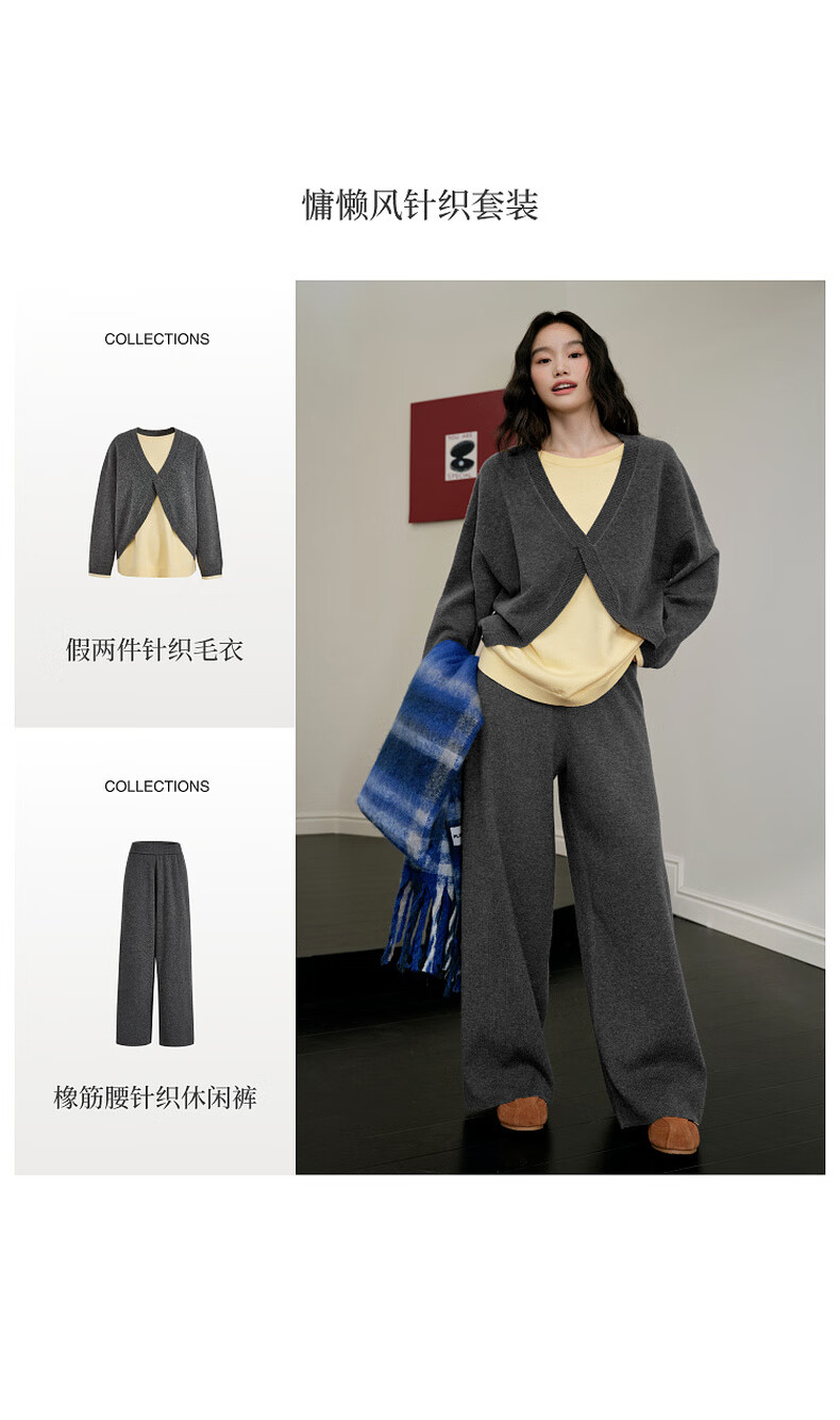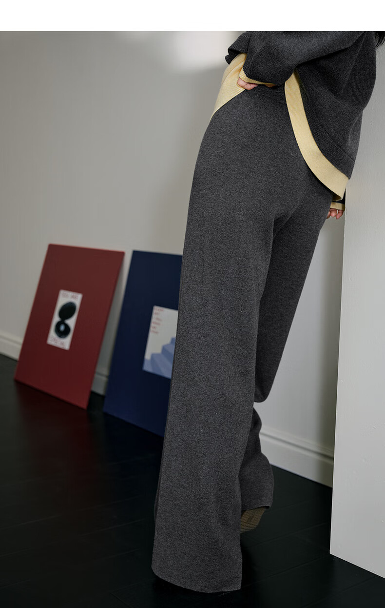Wide color fake two piece sweater casual pants two piece suit 2025 autumn and winter new women's top sweater long pants gray sweater 0048 S