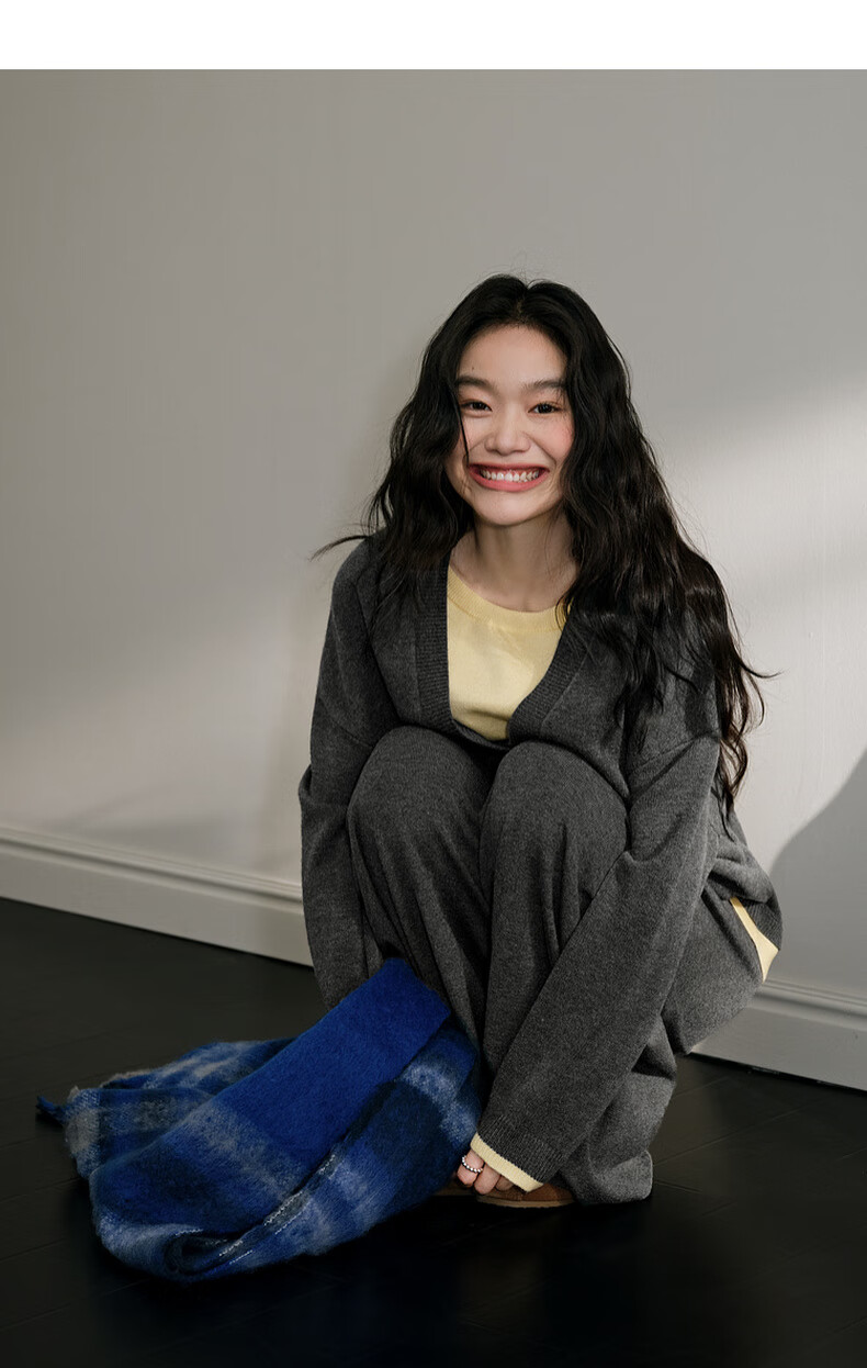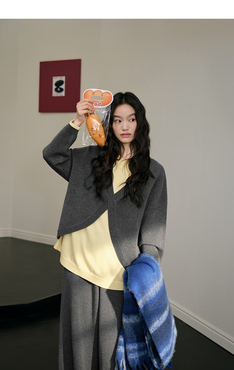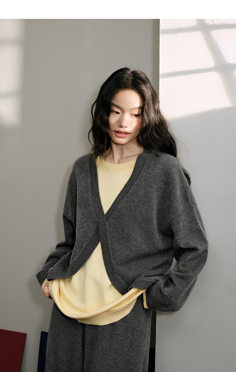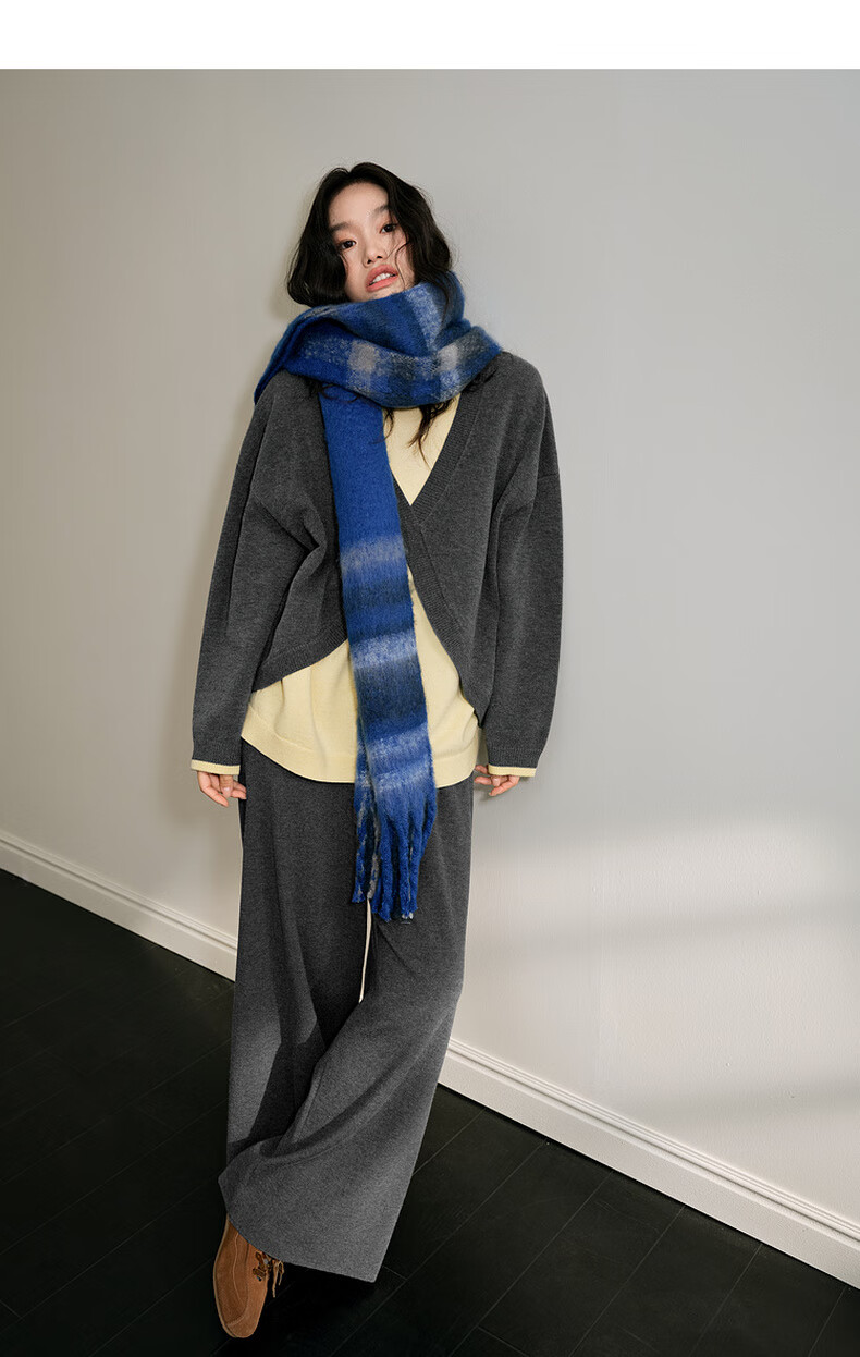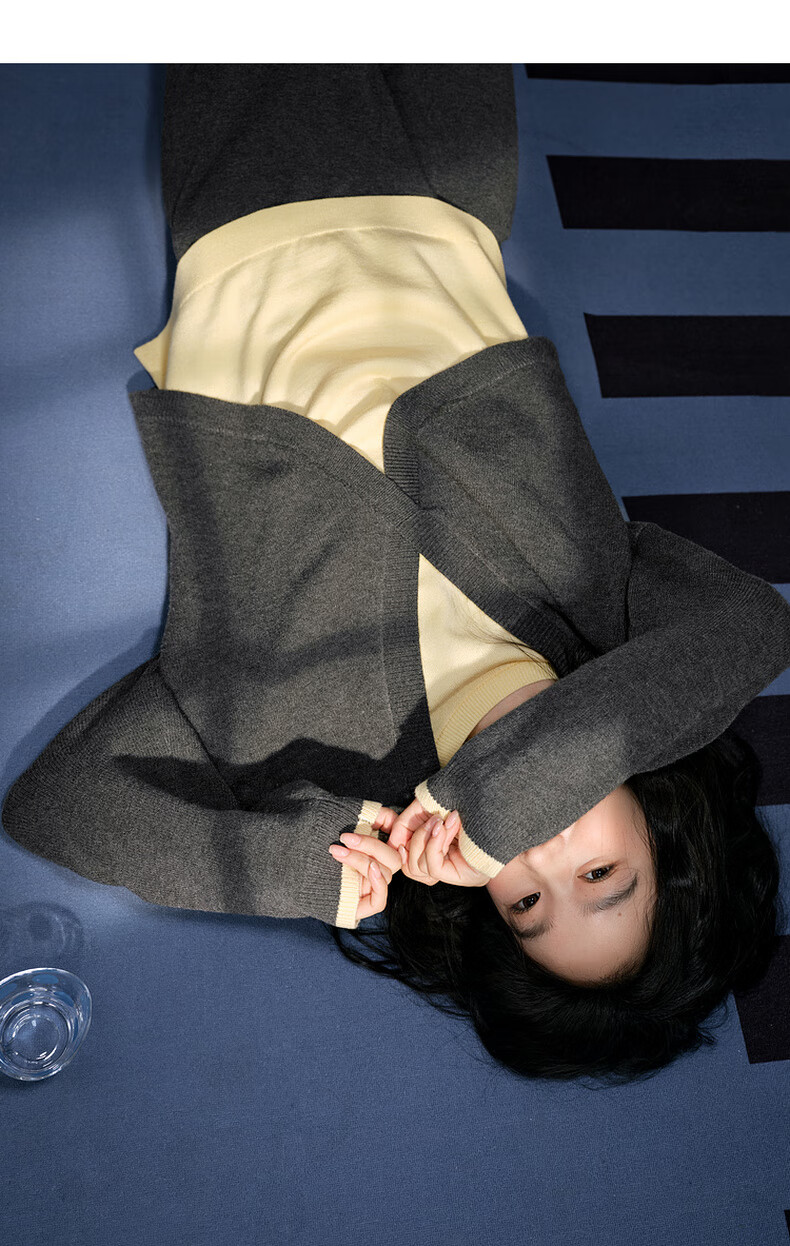 Wide color fake two piece sweater casual pants two piece suit 2025 autumn and winter new women's top sweater long pants gray sweater 0048 S