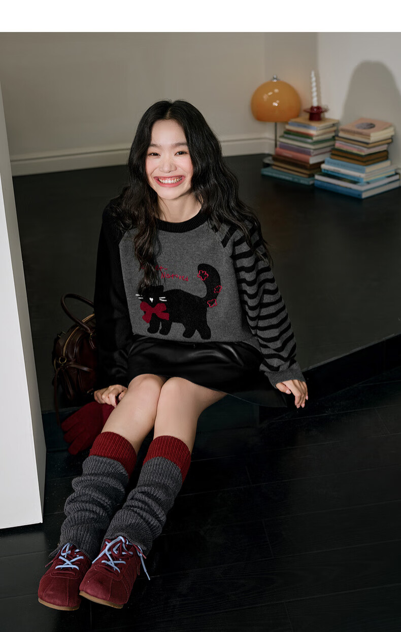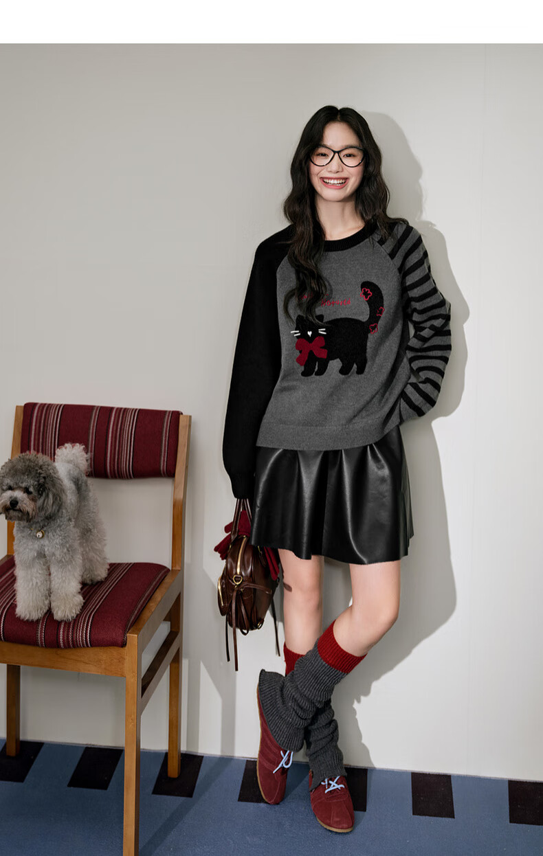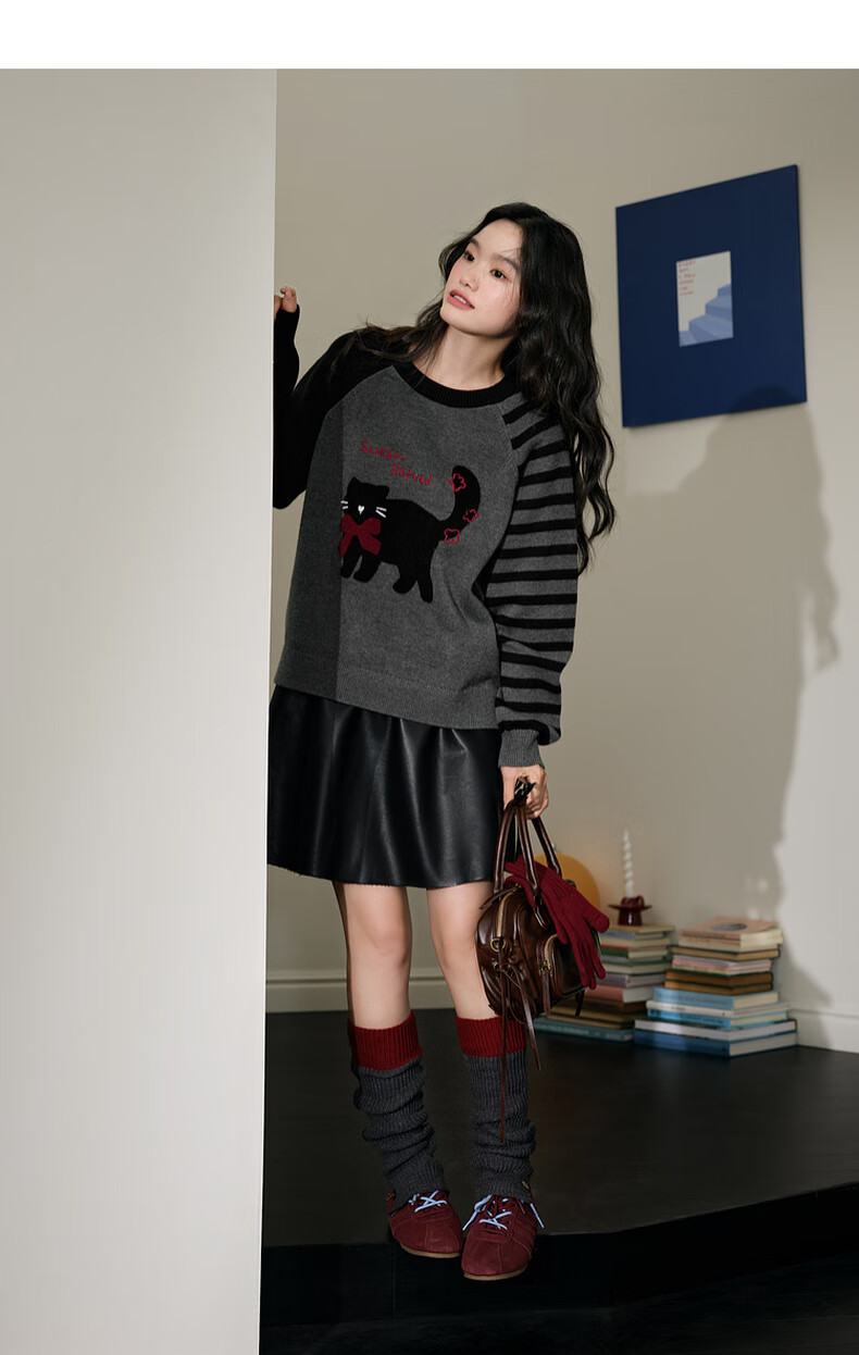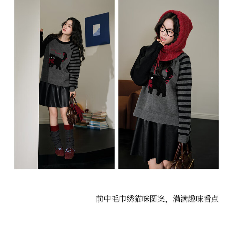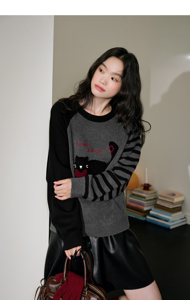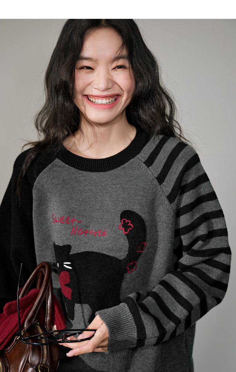 Wide gray design striped long-sleeved sweater women's 2025 autumn and winter new embroidered three-dimensional kitten top Gray Released on November 25 S