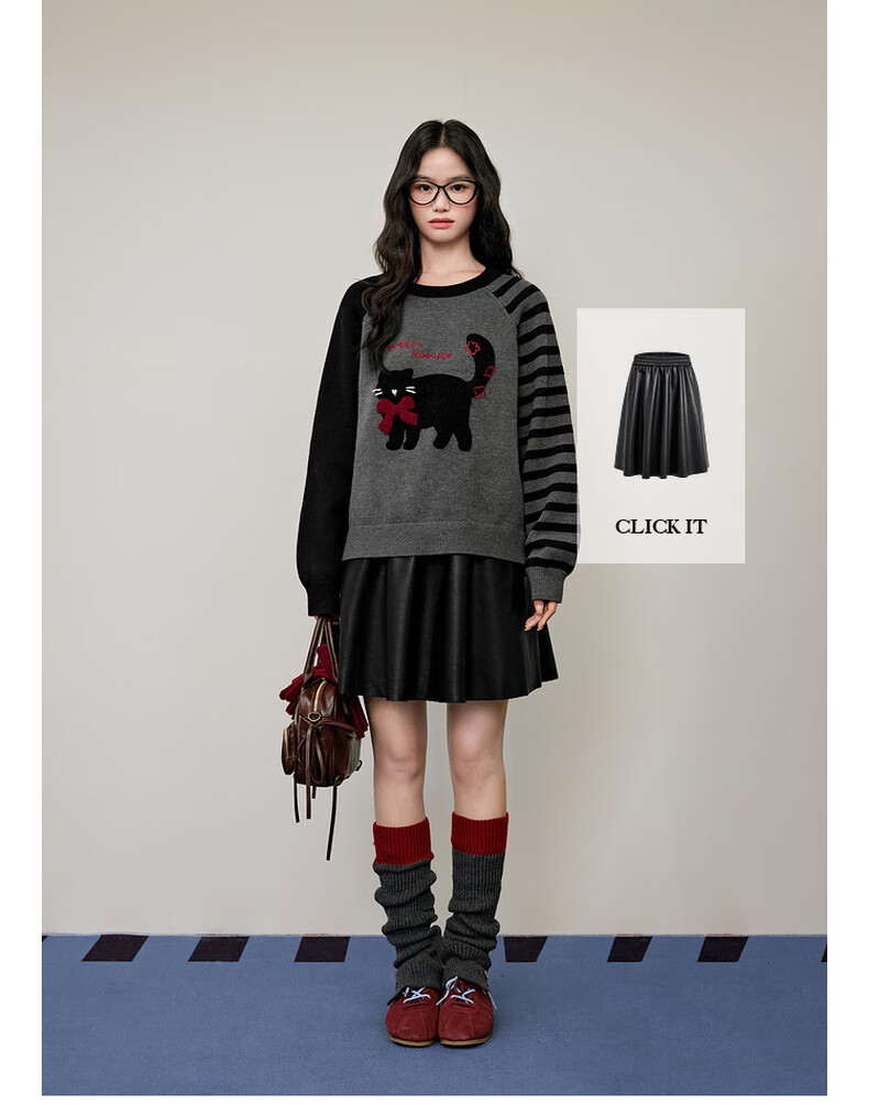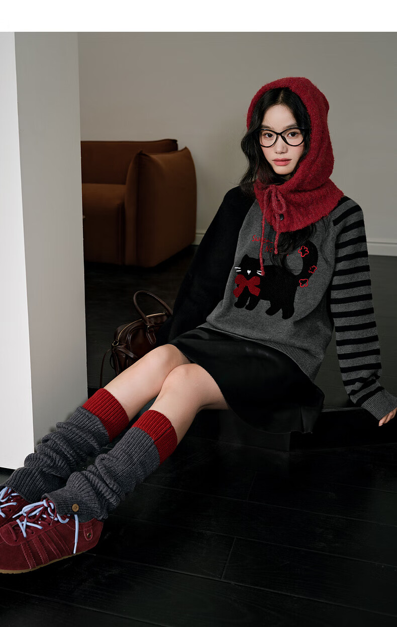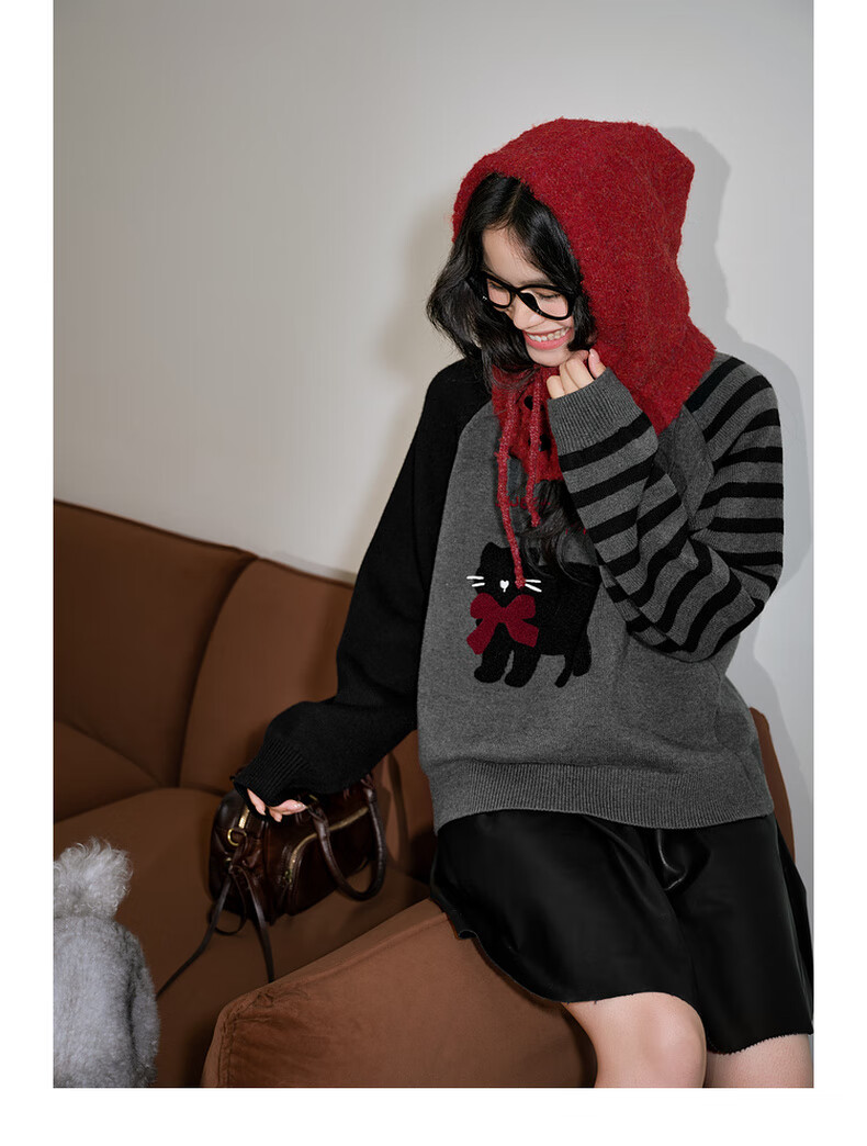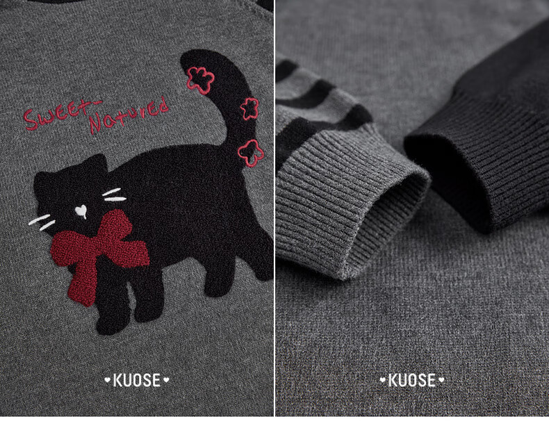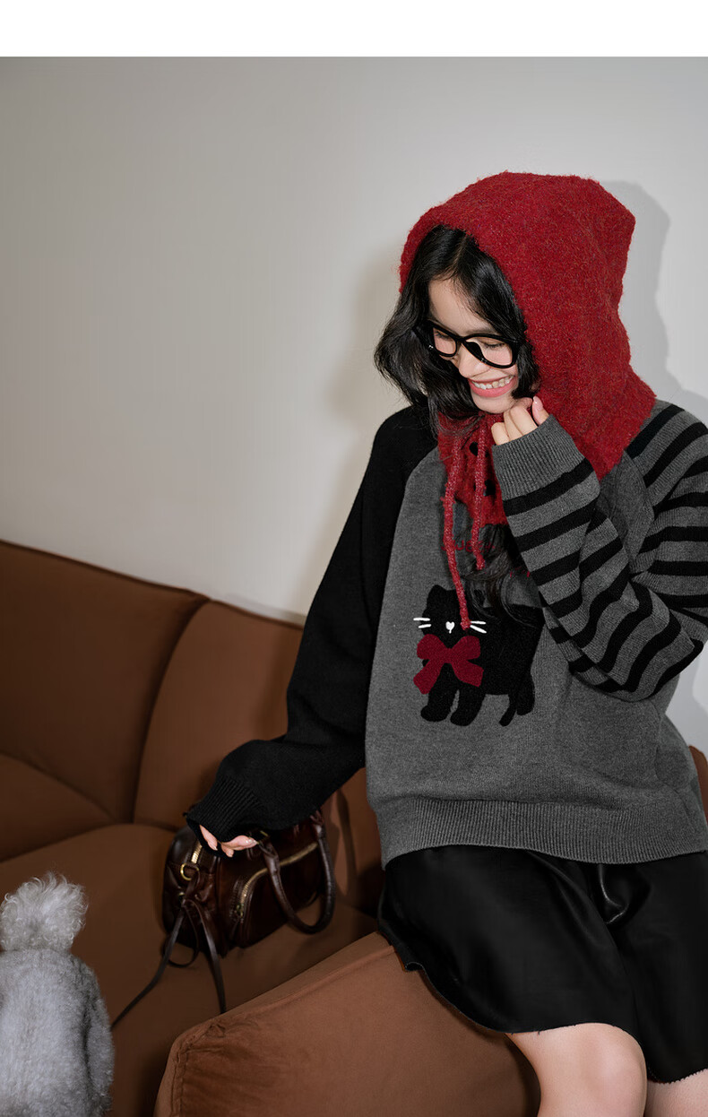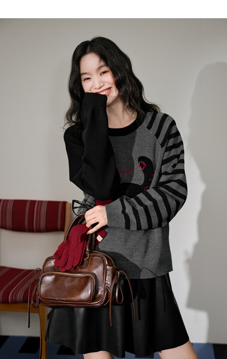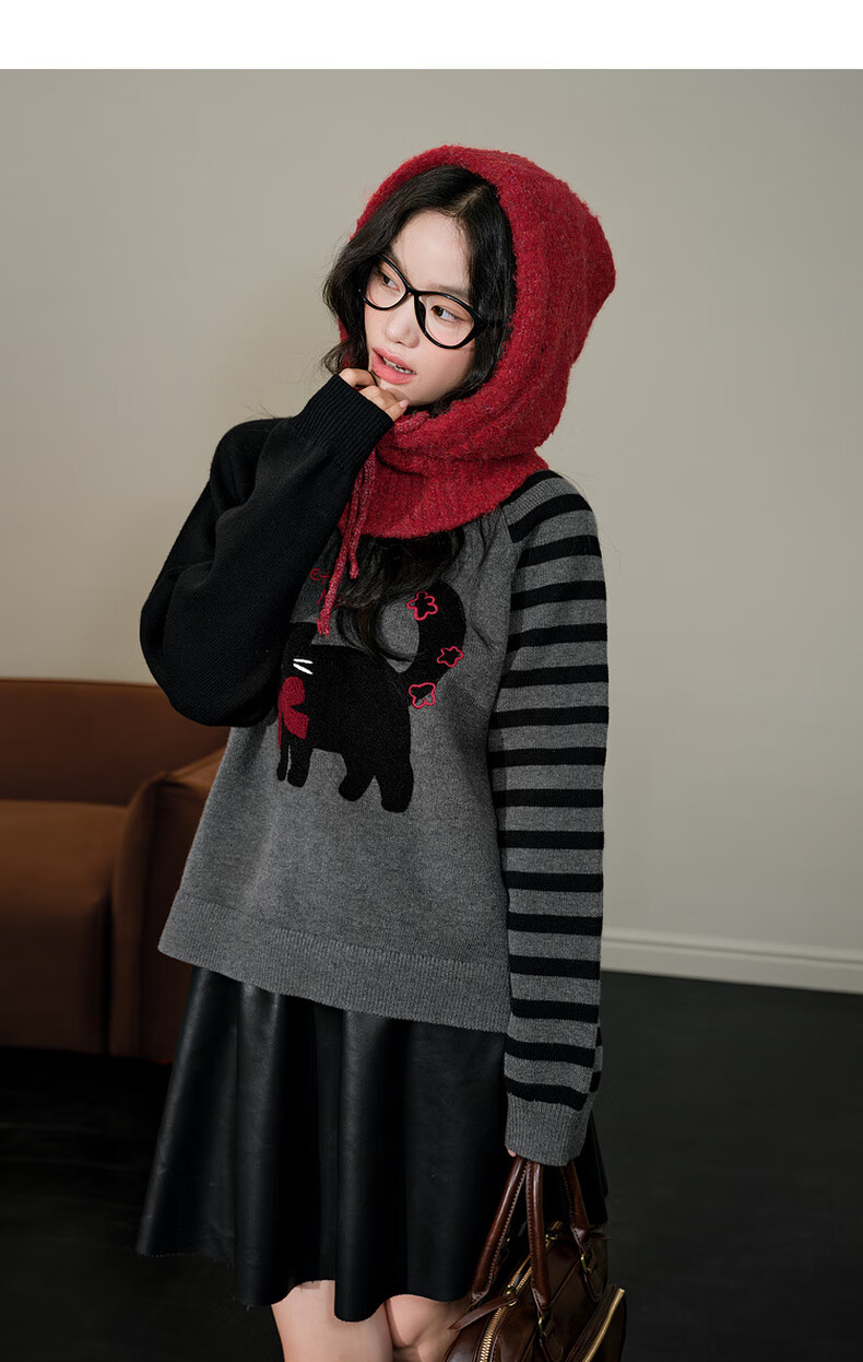 Wide gray design striped long-sleeved sweater women's 2025 autumn and winter new embroidered three-dimensional kitten top Gray Released on November 25 S