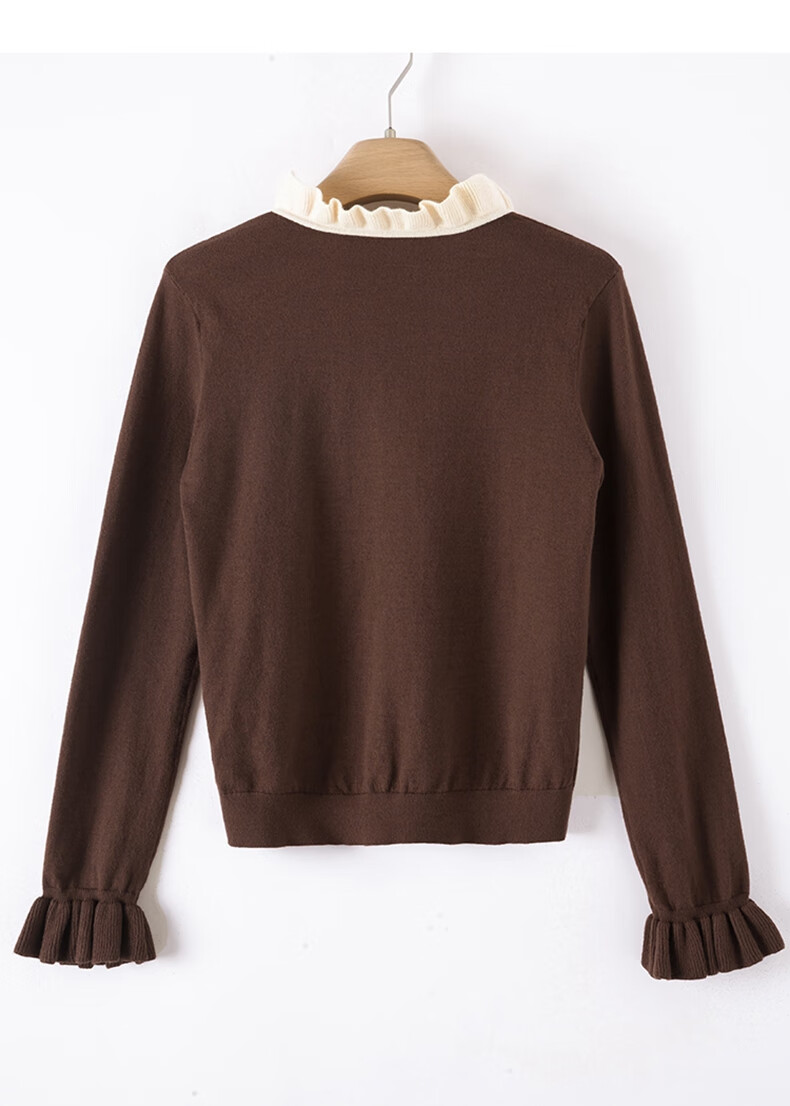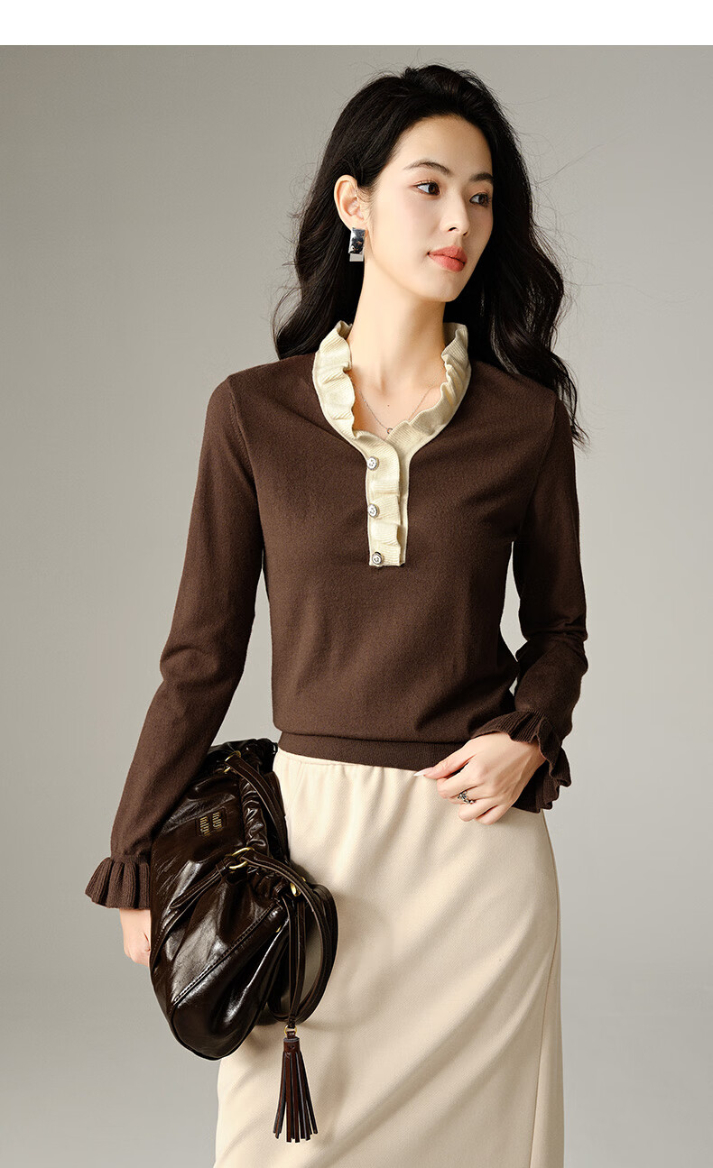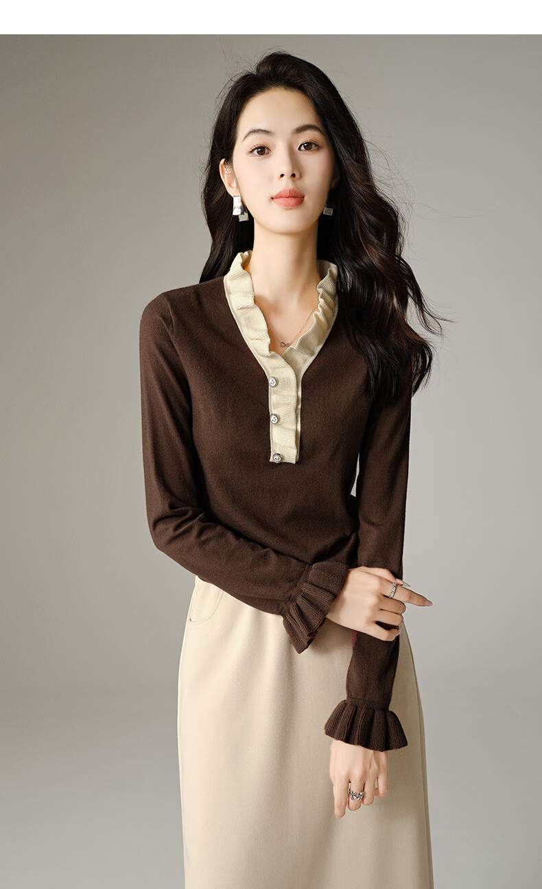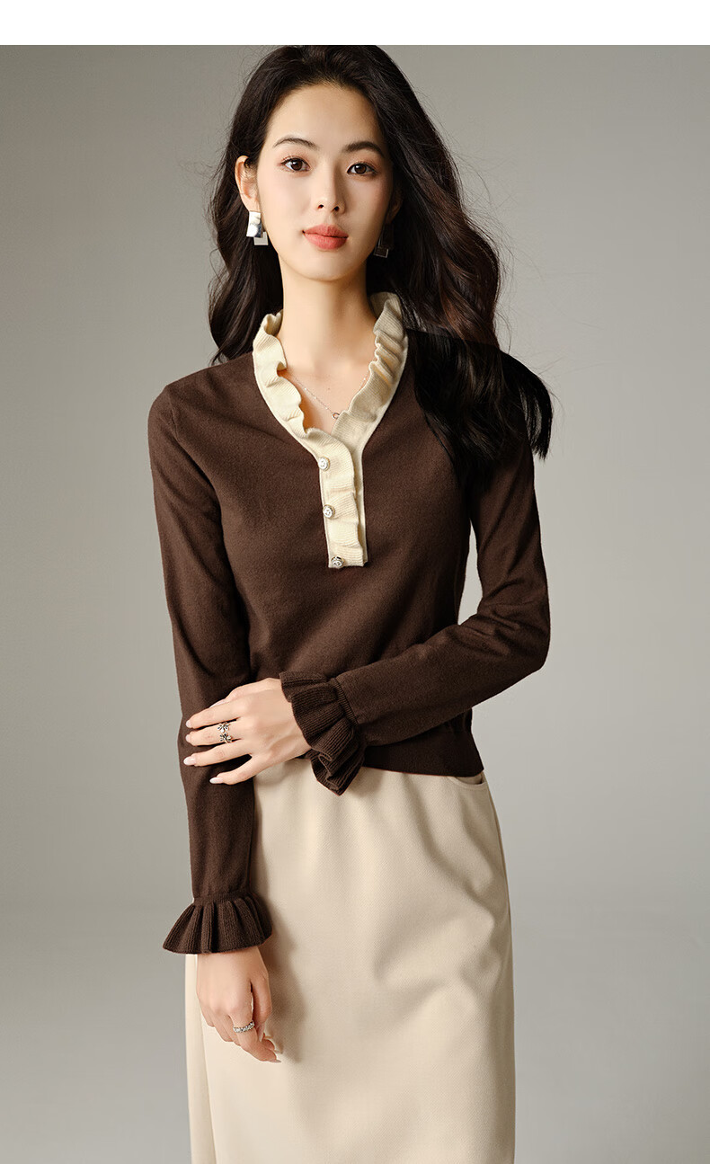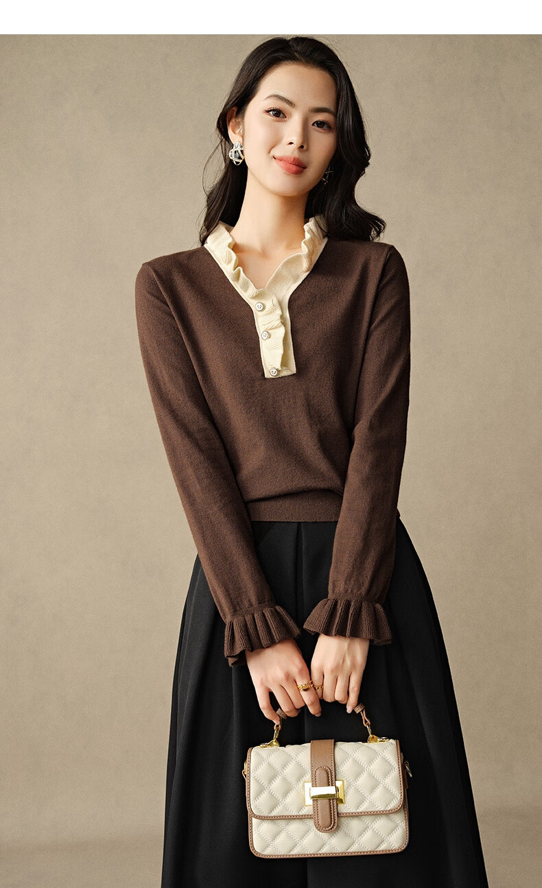 Late White New Product 2025 Autumn Fashion Simple Casual Sweater Temperament V-neck Lace Elegant Knitted Sweater Women Brown S