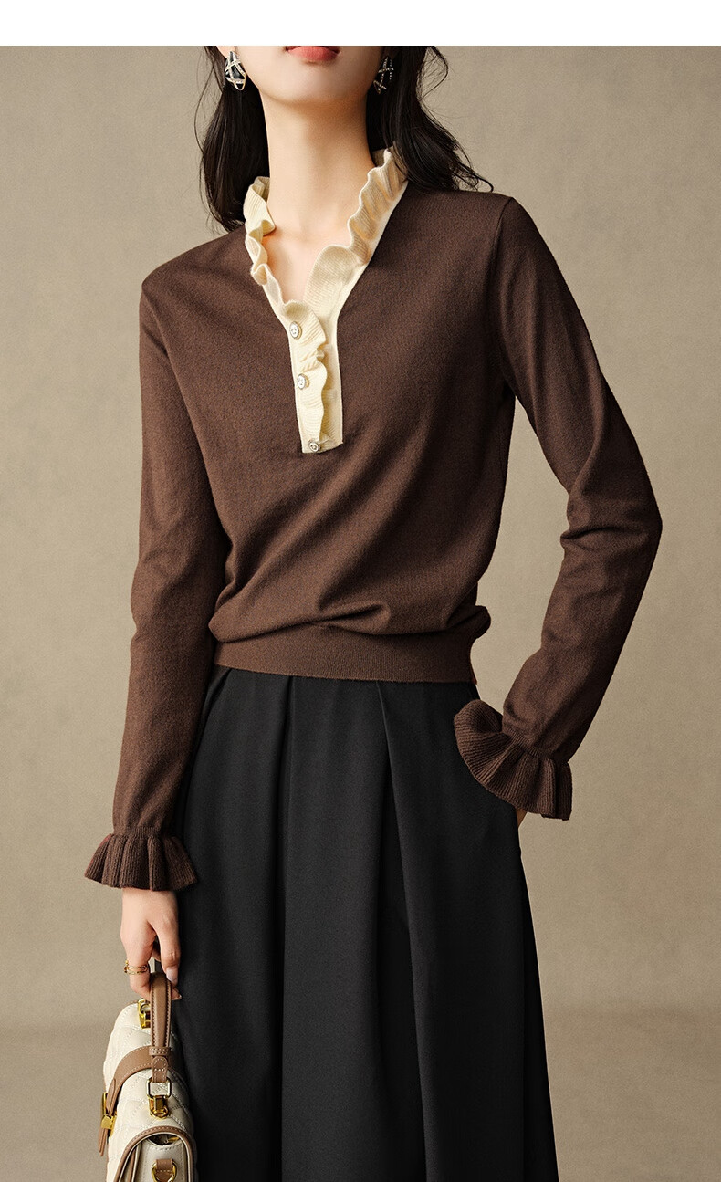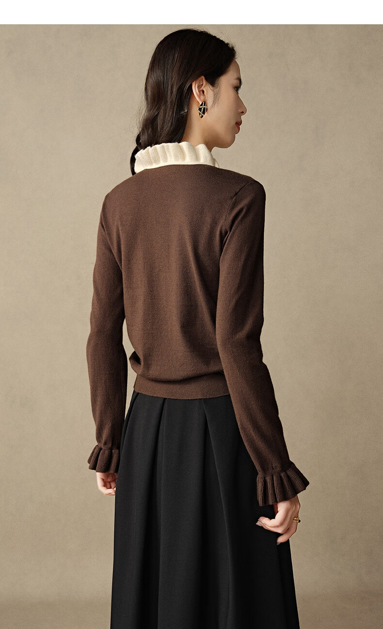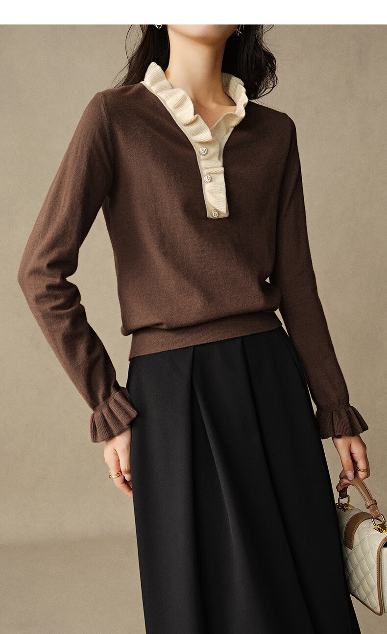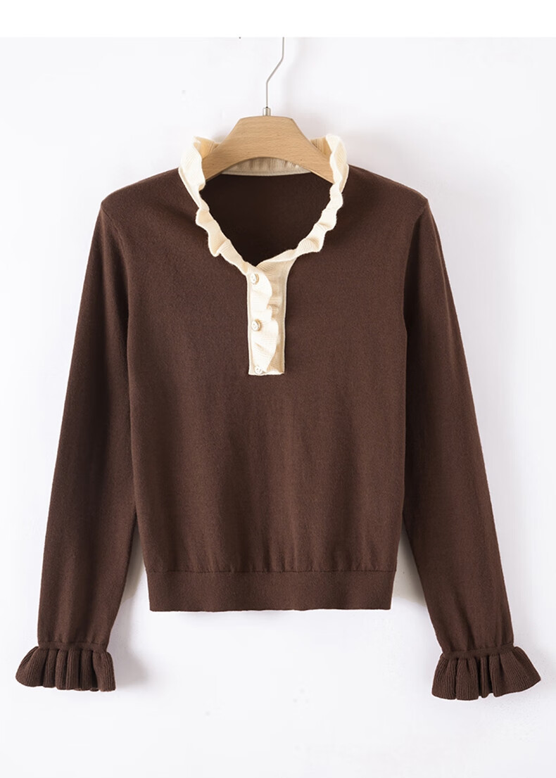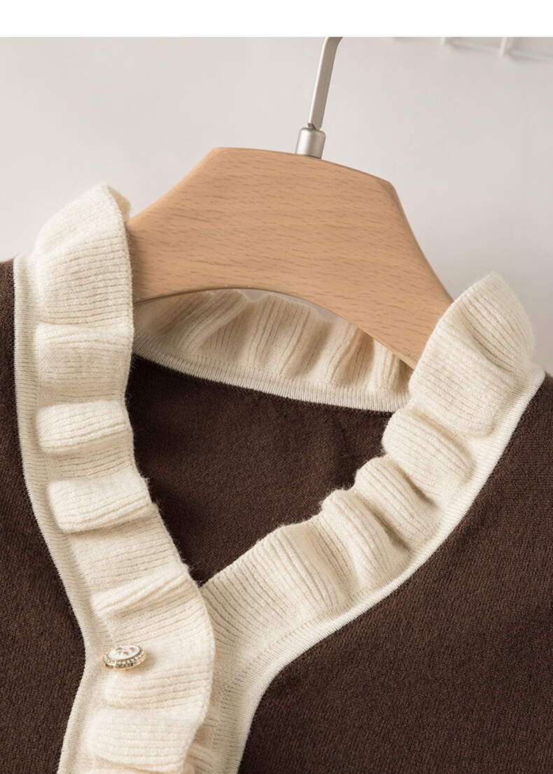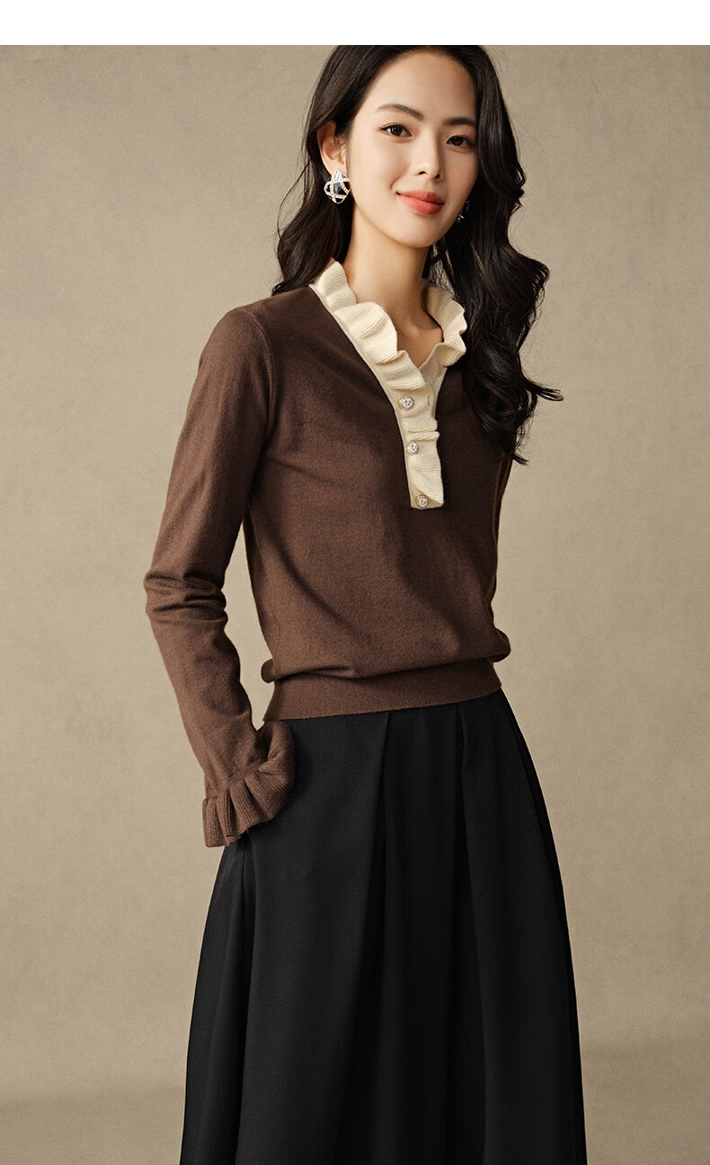 Late White New Product 2025 Autumn Fashion Simple Casual Sweater Temperament V-neck Lace Elegant Knitted Sweater Women Brown S