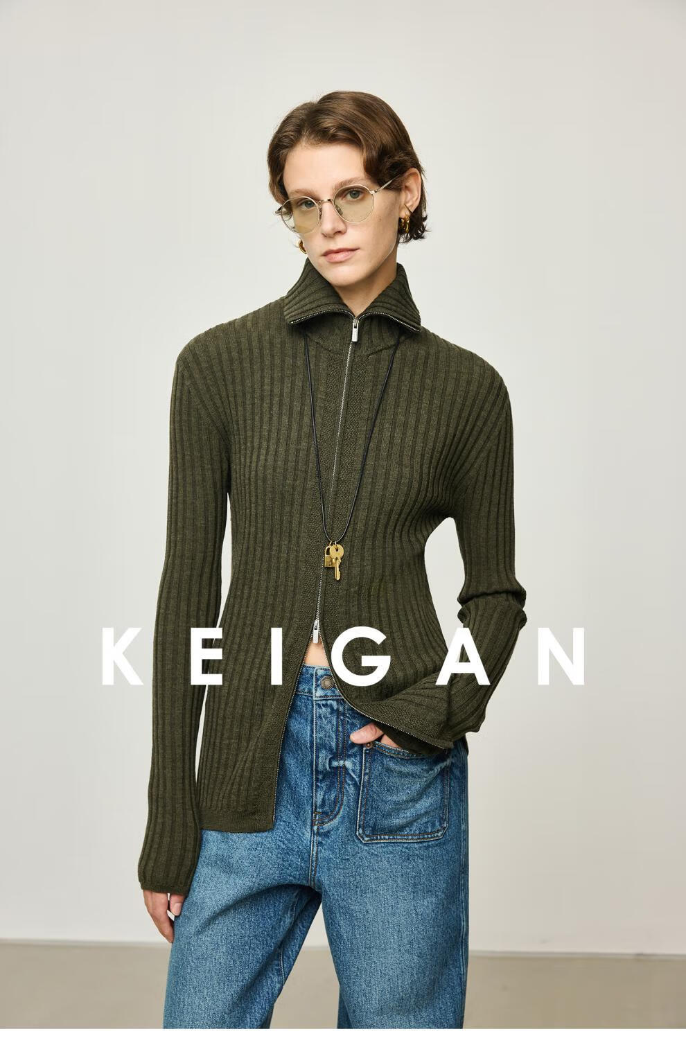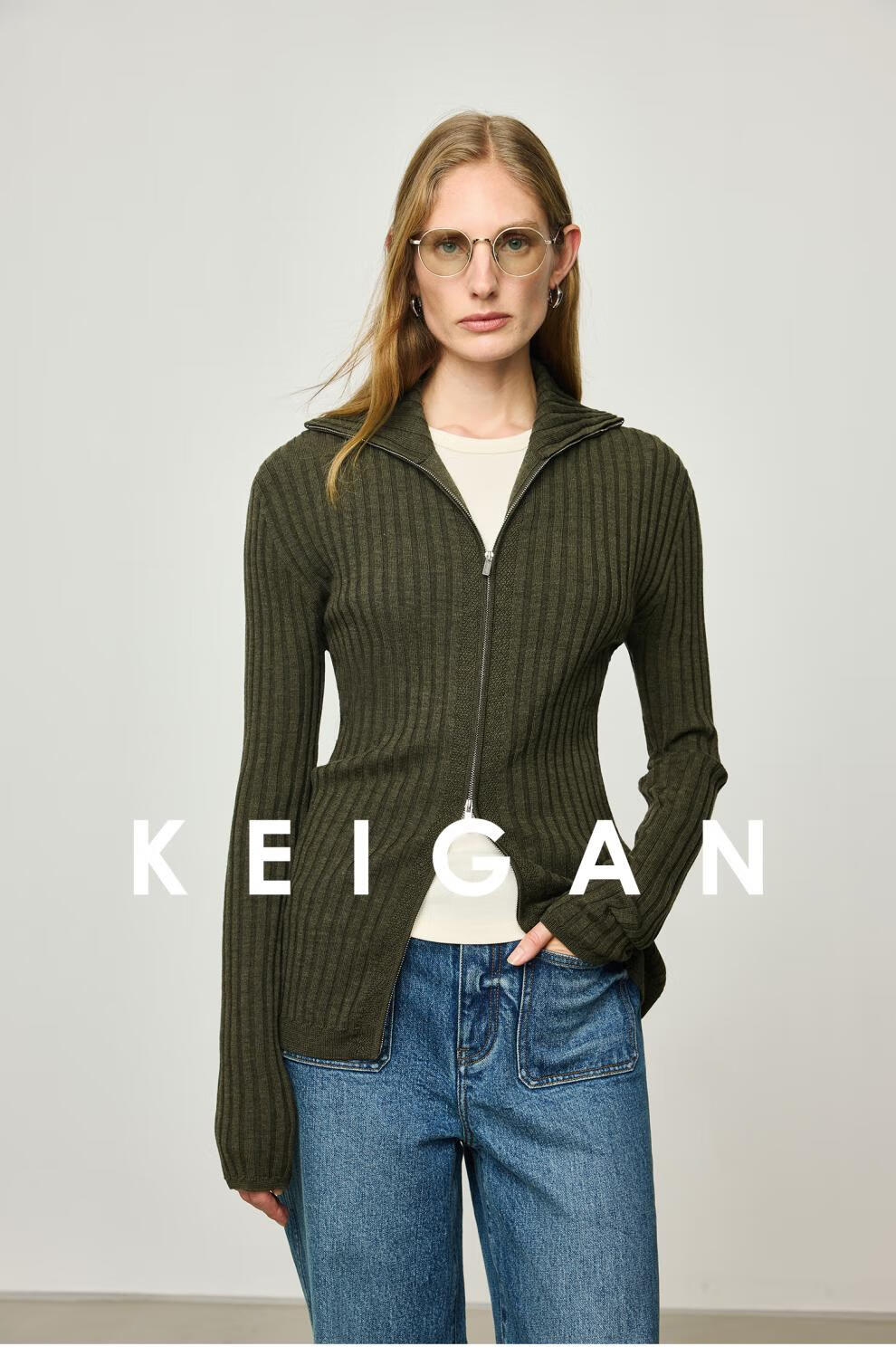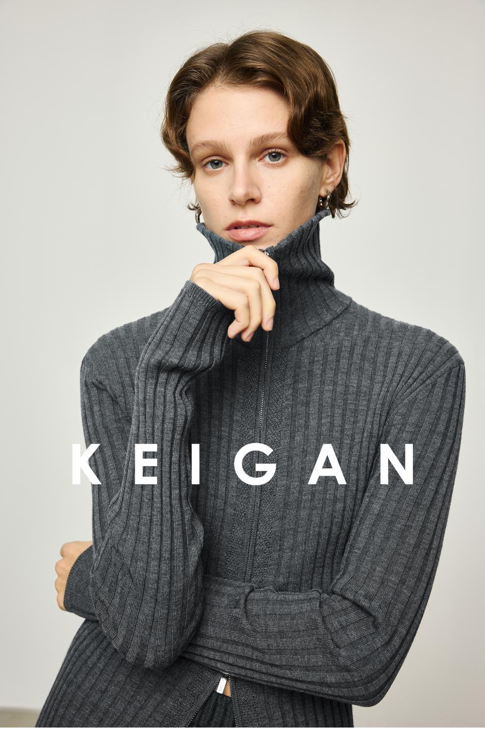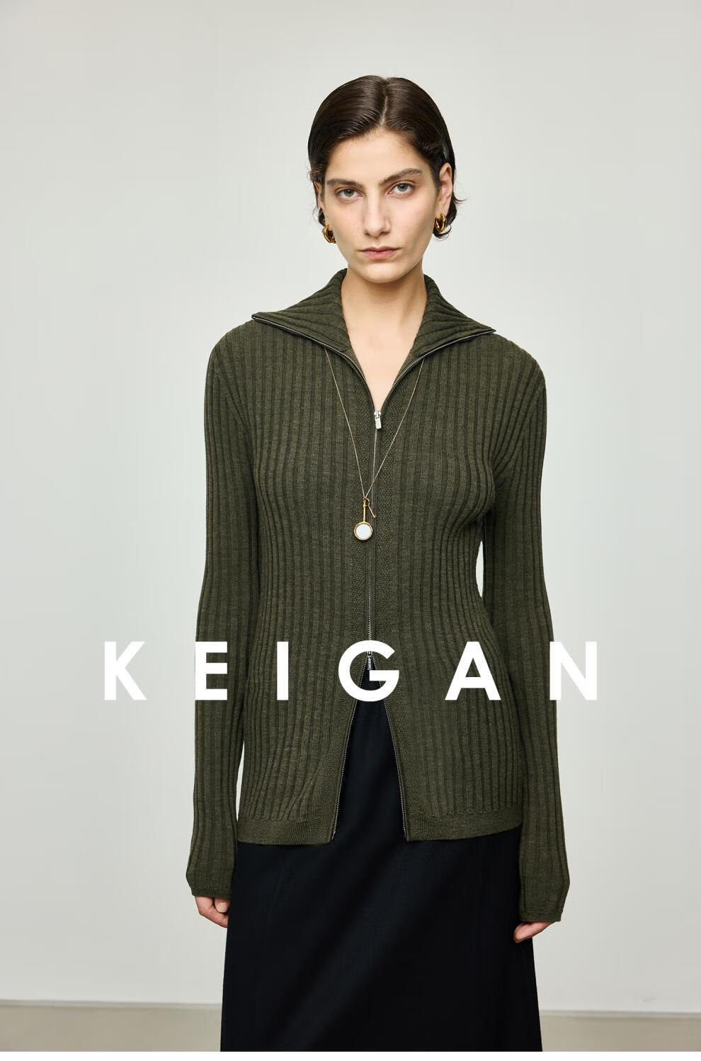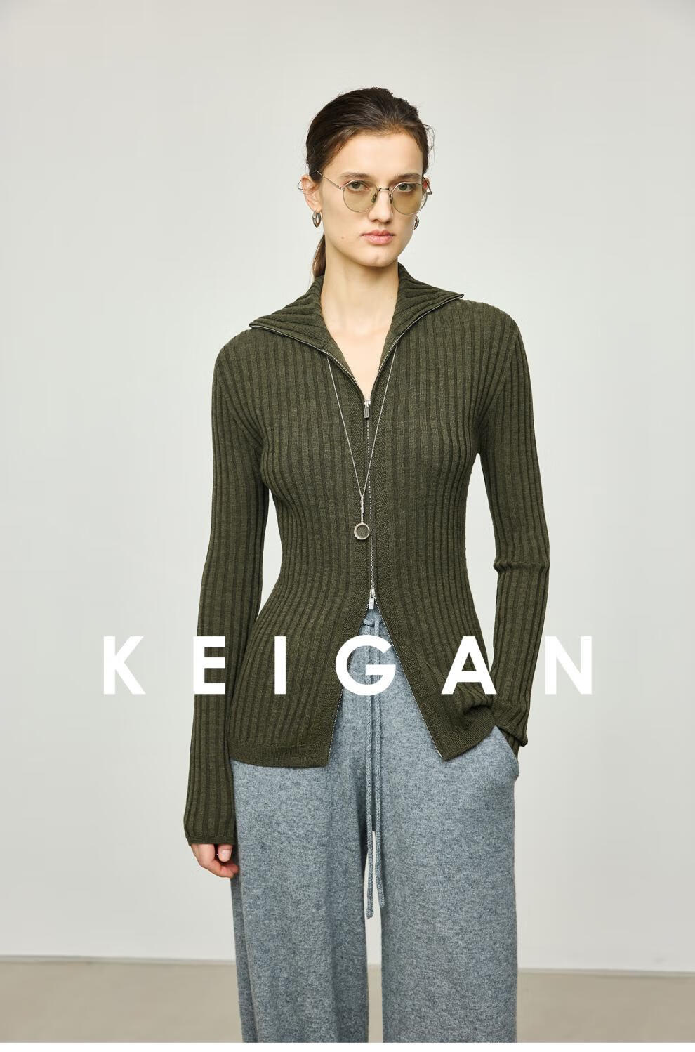 KEIGAN studio/black label imported & German BIELLA washable wool layered double zipper bottoming cardigan seaweed green S 34 (delivery within 25 days of booking)