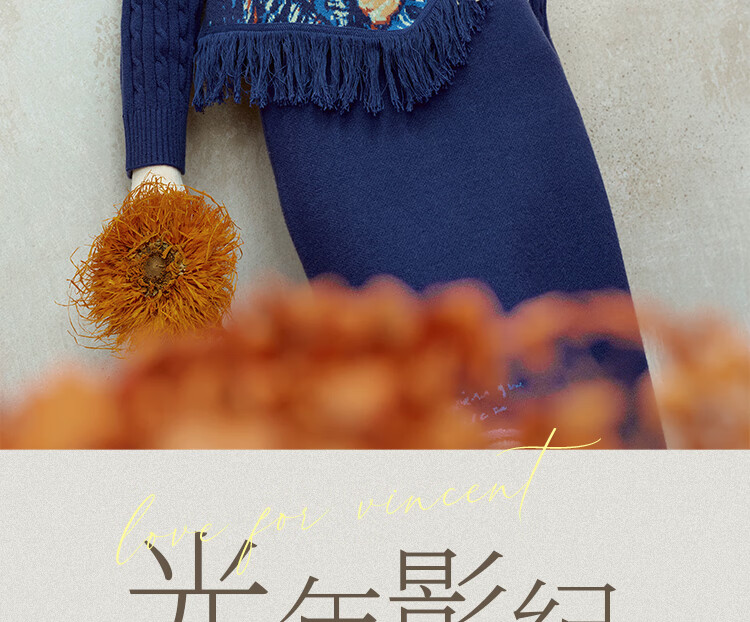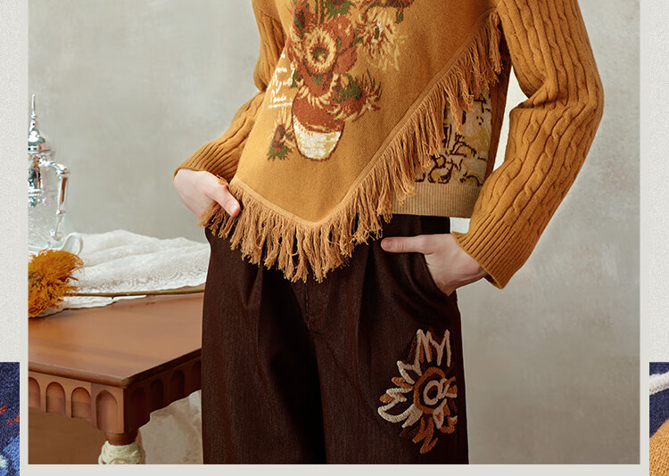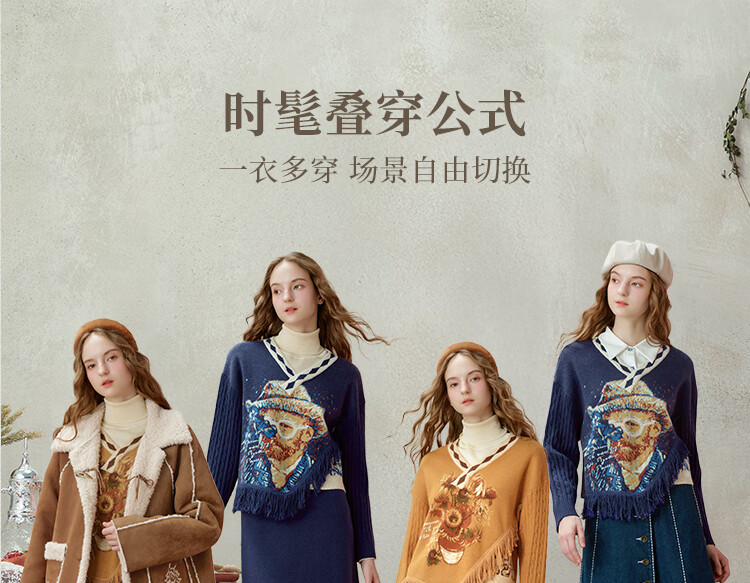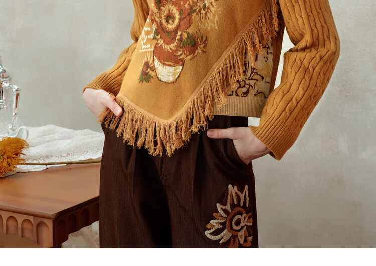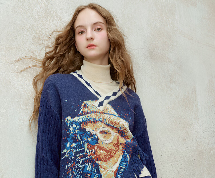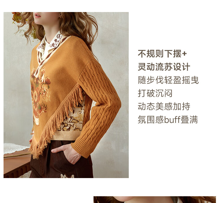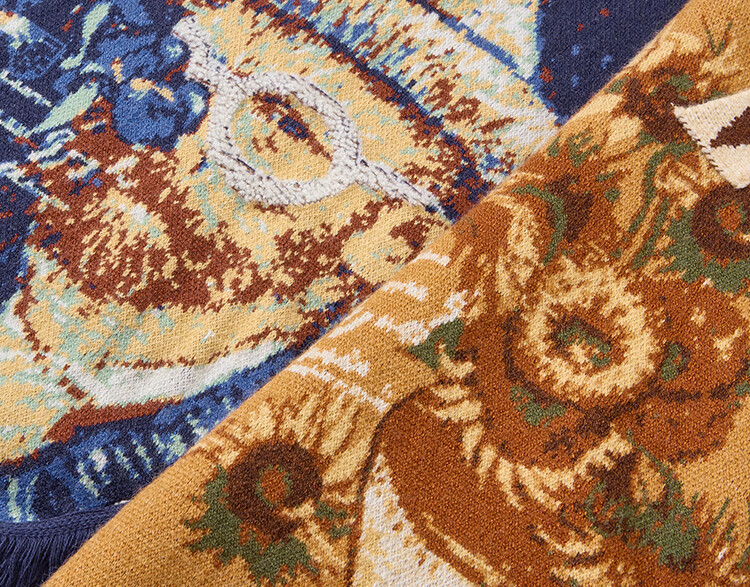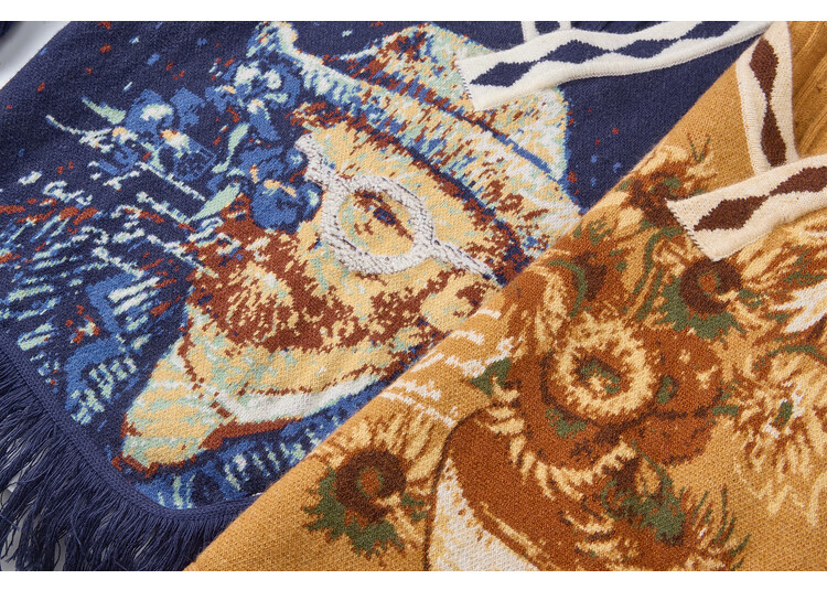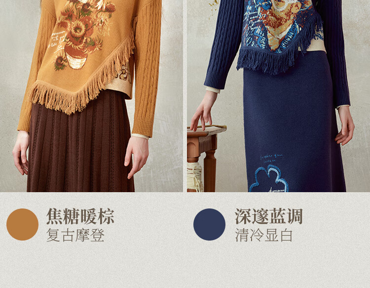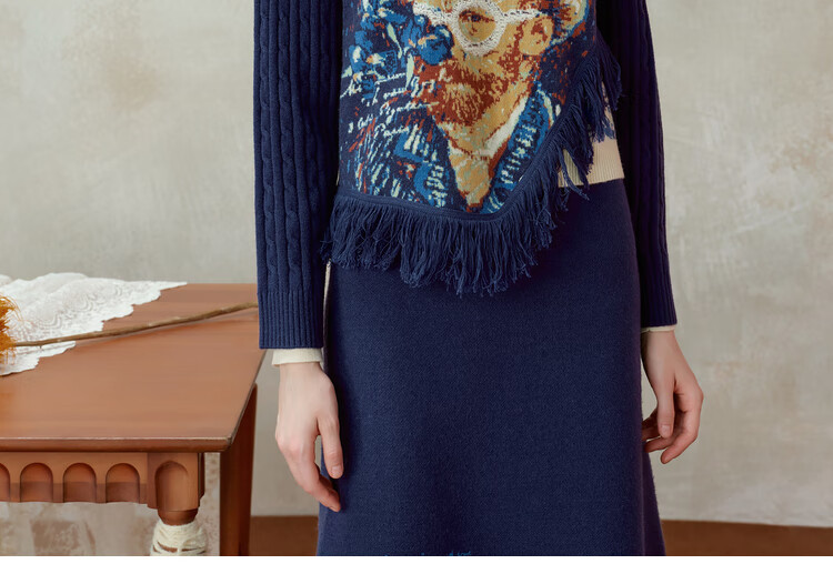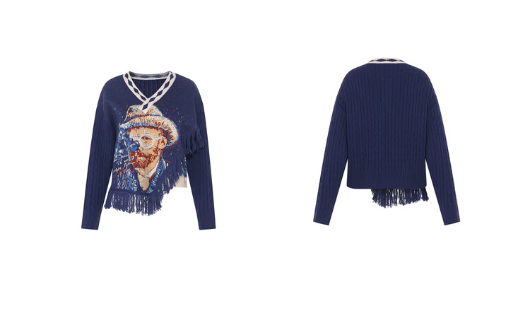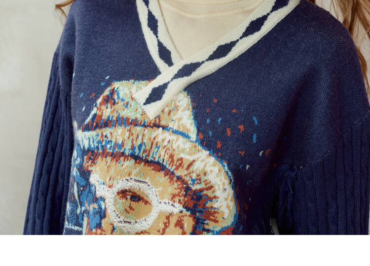 Two or three things about Van Gogh's literary and artistic light years and shadows 2025 winter new oil painting pattern tassel asymmetric hem sweater for women dark blue S