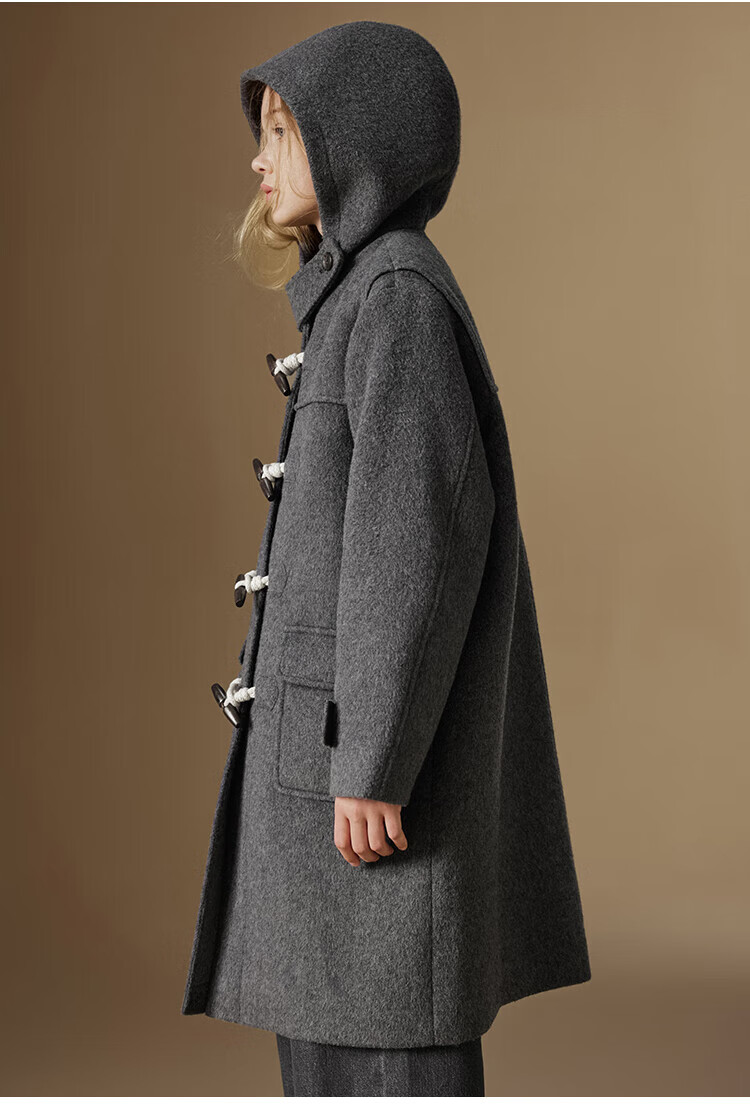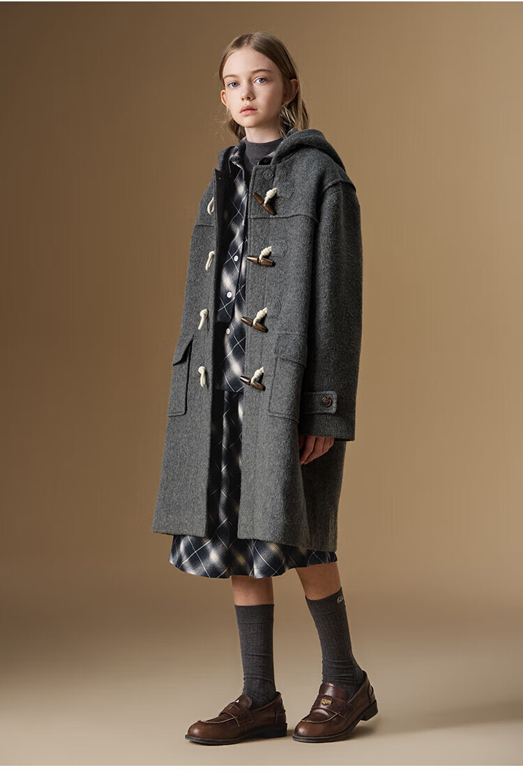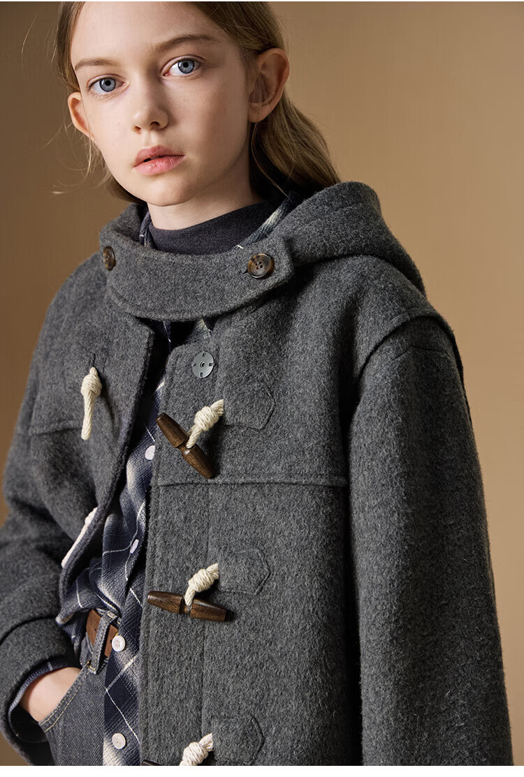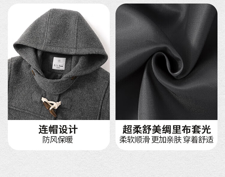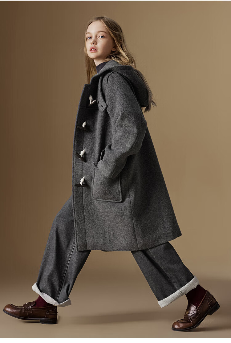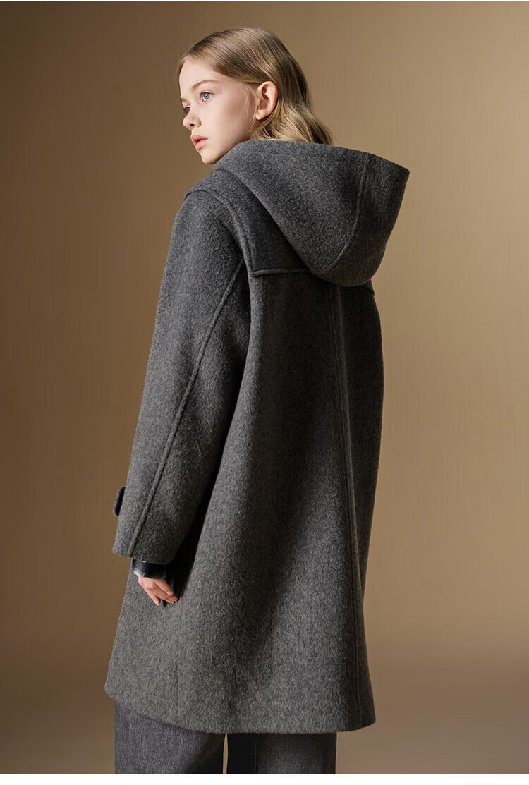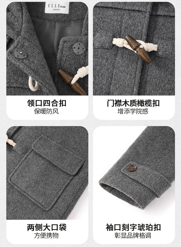 ELLE KIDS 50% wool coat French preppy style autumn and winter hooded temperament girls mid-length loose woolen coat