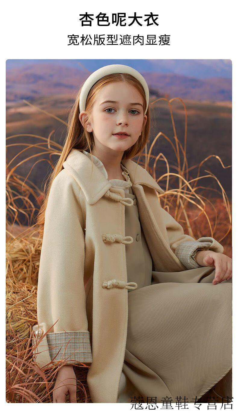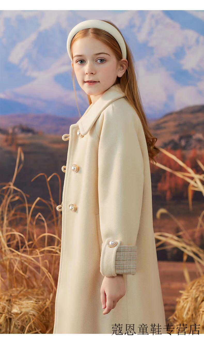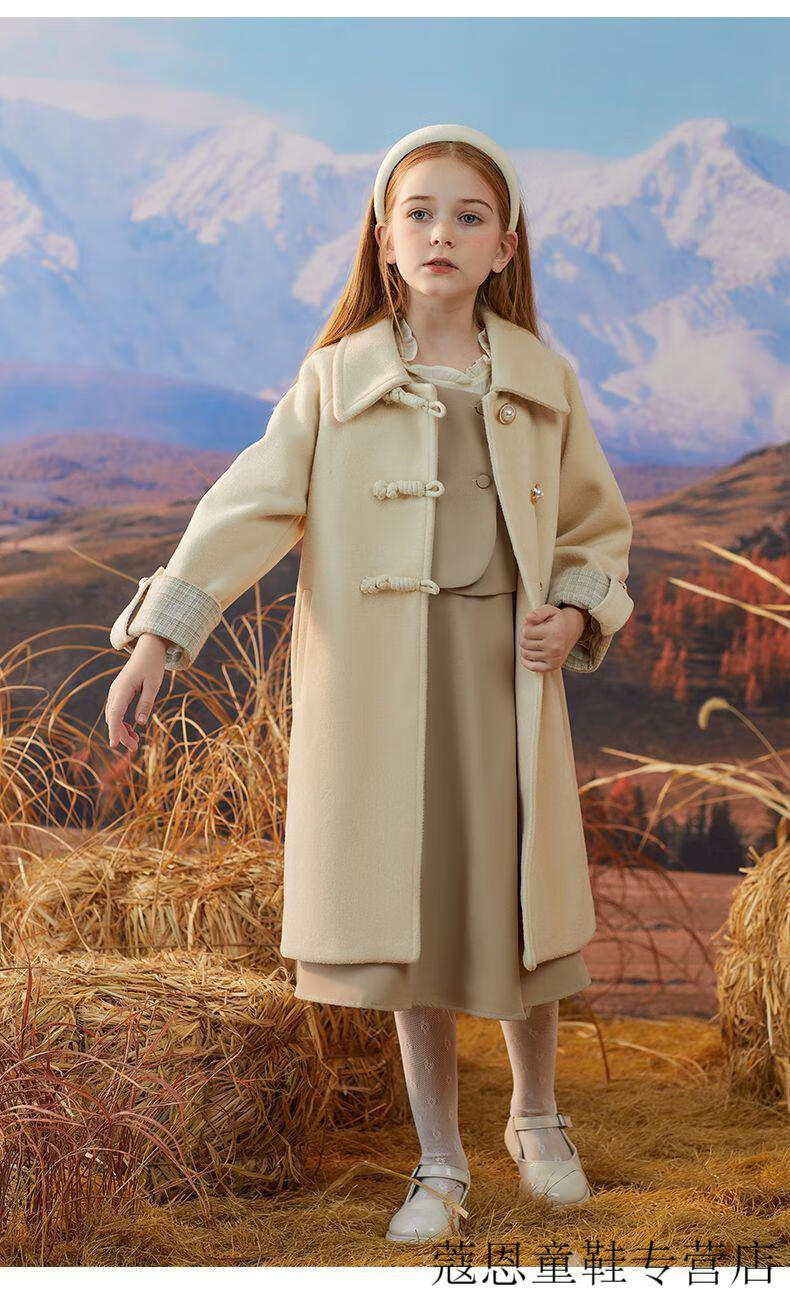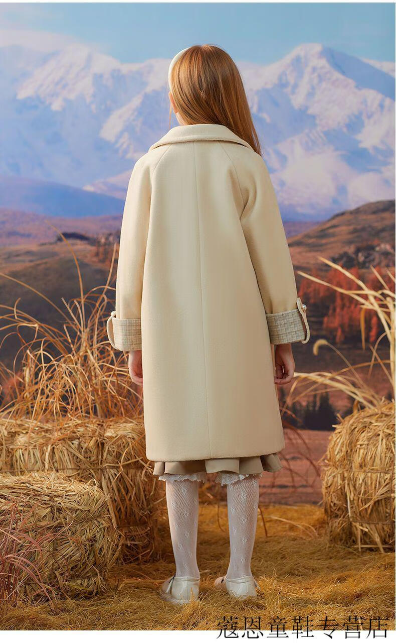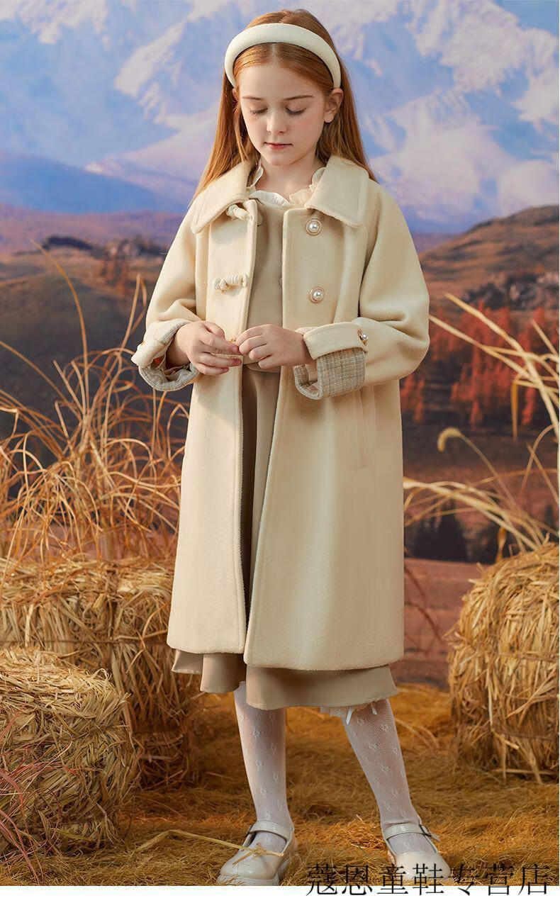 Disney Girls' Woolen Coat Autumn and Winter New Style Western Style Large Children's Woolen Coat Thickened Cotton Mid-Length Winter Clothes Beige Single Layer Lining 120