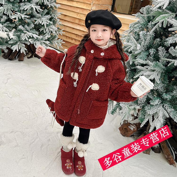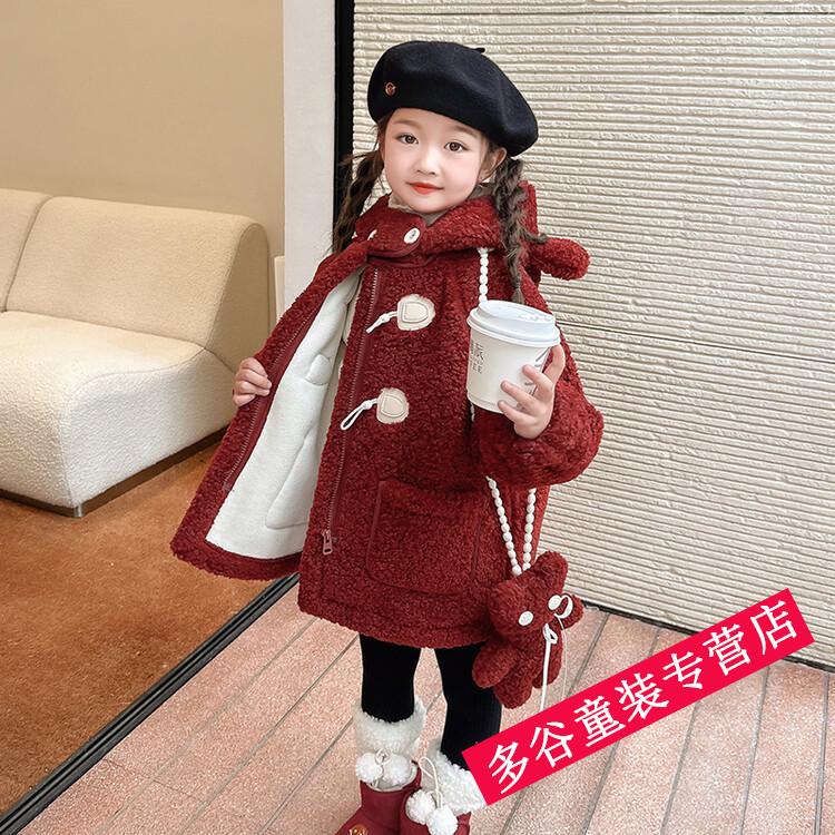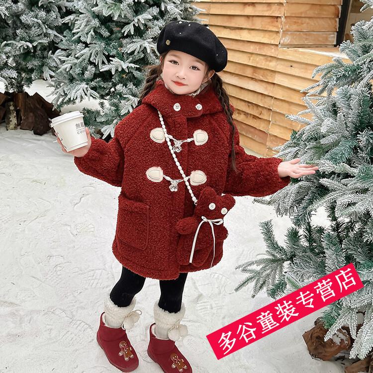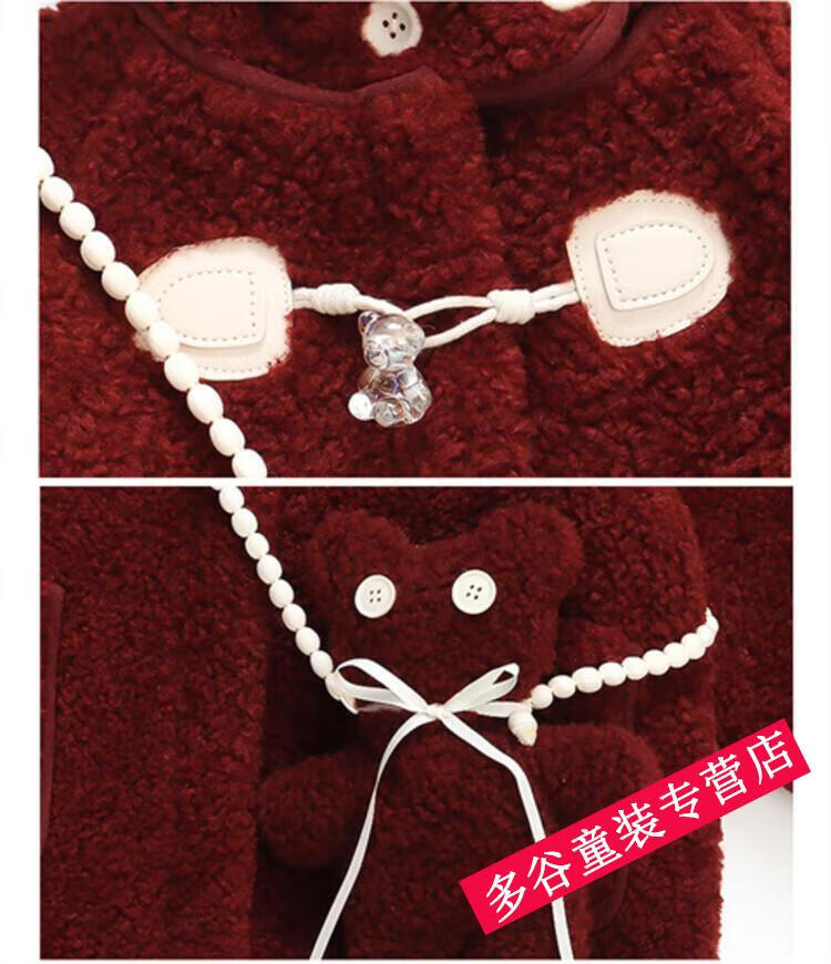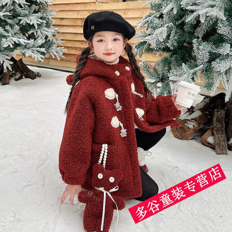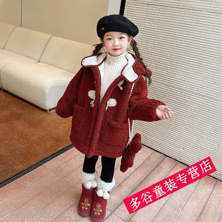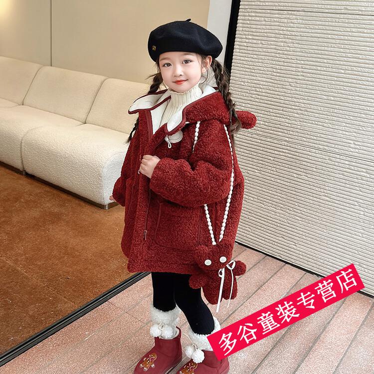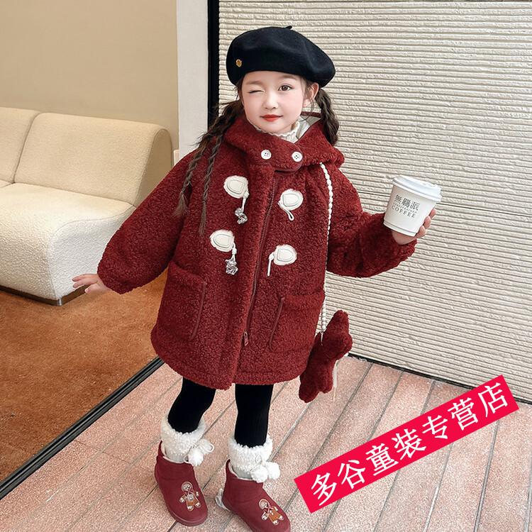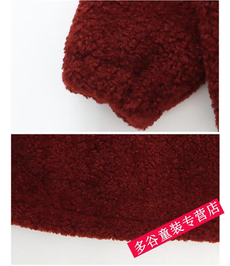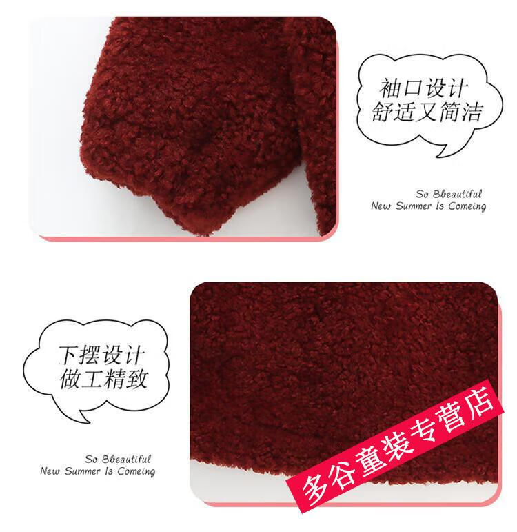 G.DUCKKIDS Mädchen-Lammwolljacke Herbst und Winter 2024, neuer Baby-Stil, plus samtverdickter Kinderpelzmantel, Winter, Angorarot, inklusive Tasche, 110 cm