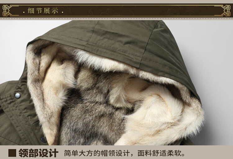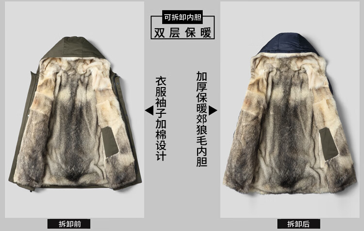 Hengyuanxiang Winter Genuine Leather Coyote Fur Liner Men's Fur One-piece Fur Pie Overcoat Hooded Outdoor Warm Jacket Army Green 2XL