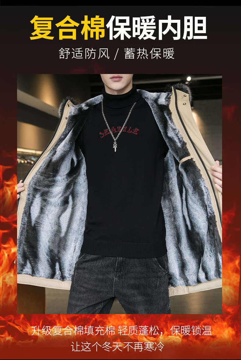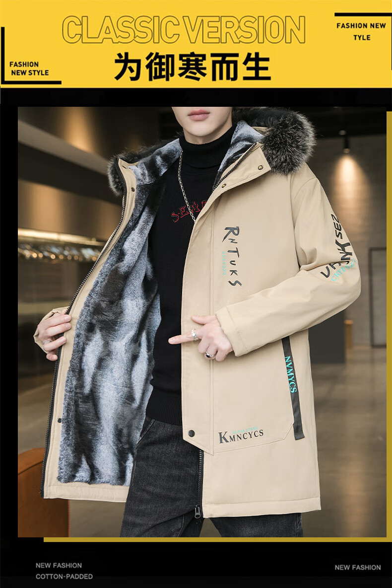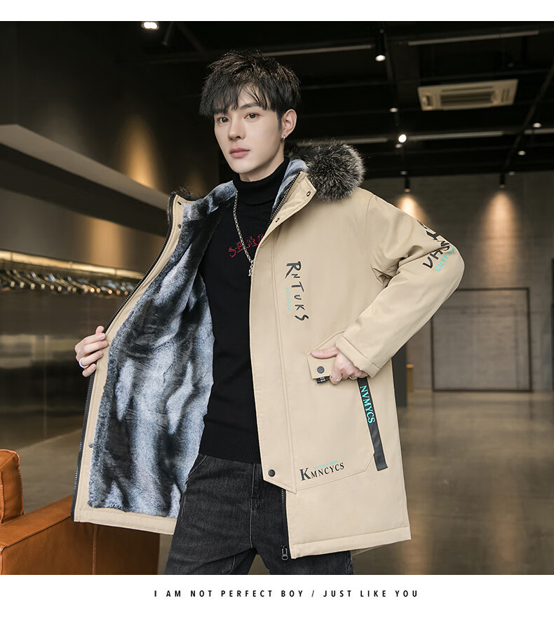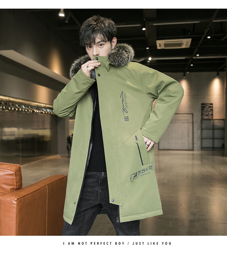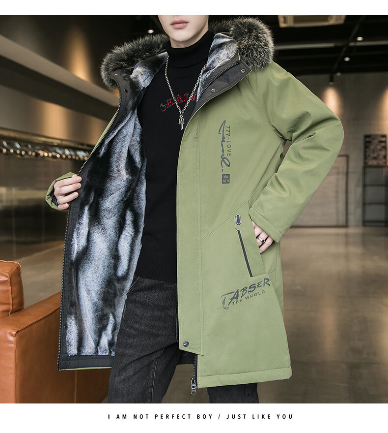 Pierre Cardin parka men's velvet windbreaker jacket winter thickened warm mid-length coat trendy student cotton coat cotton jacket 917 military green XL