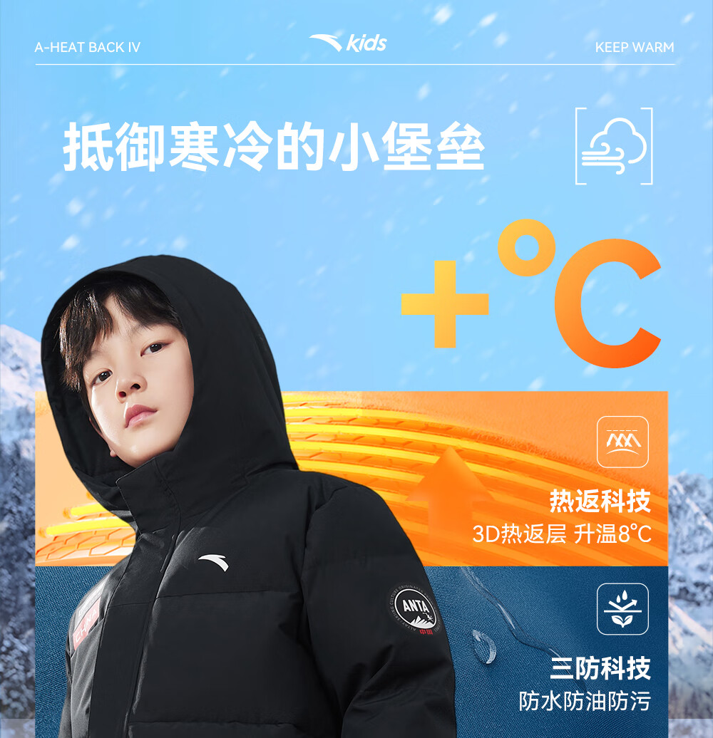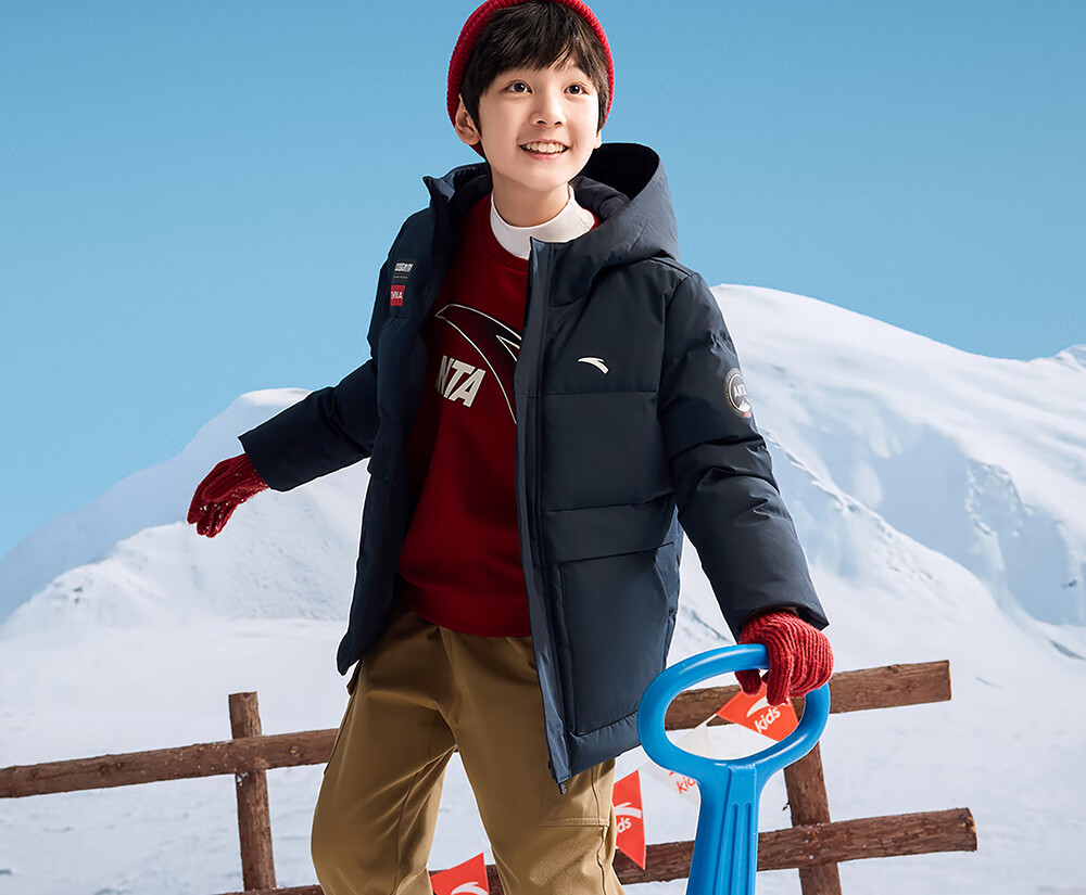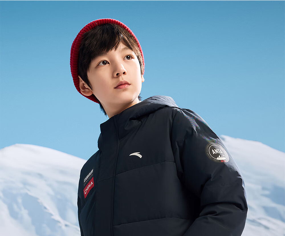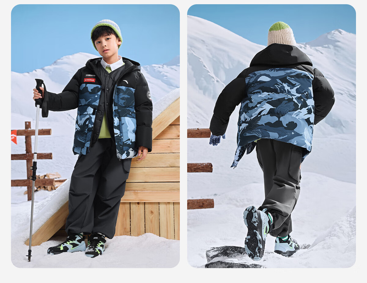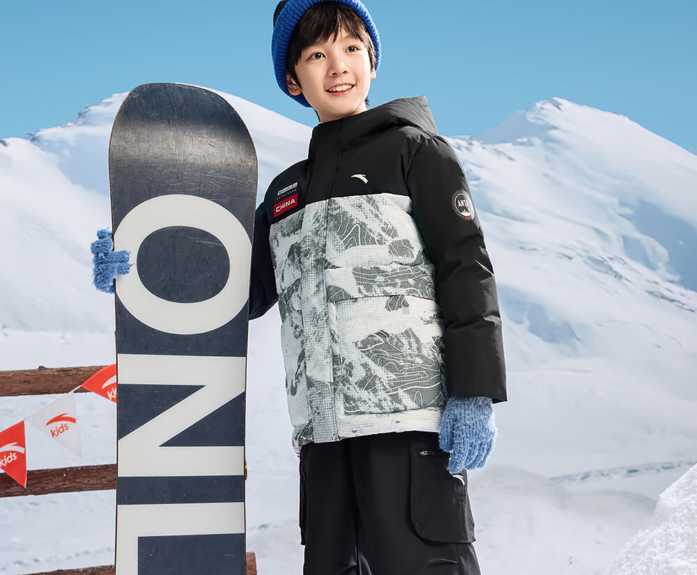 ANTA children's down jacket boys' 25-year winter outdoor three-proof snow shell heat return IV warm windproof thickened top jacket heat return IV snow shell late night blue/full print 6901H-8 down content 85% 160 down filling capacity 153g