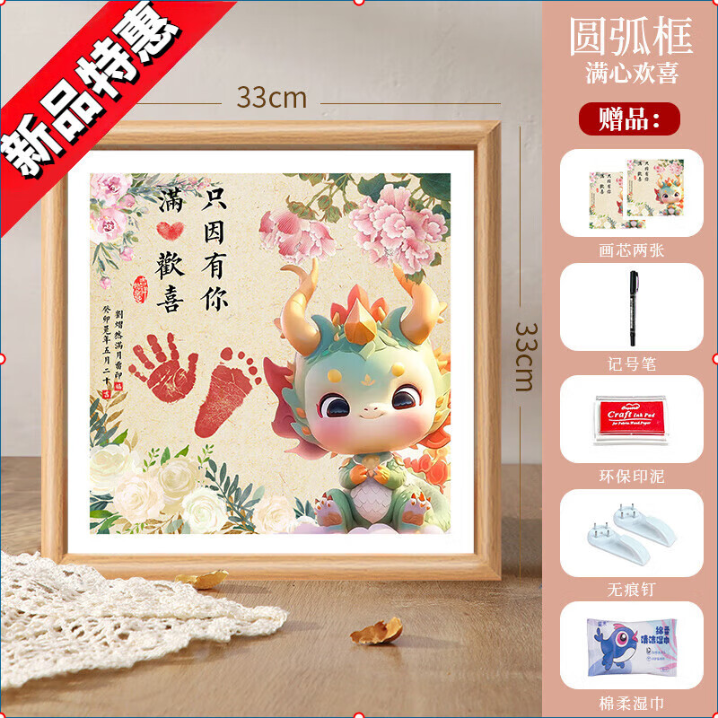 Baby dragon's 100th day of full moon hand and foot prints commemorative photo frame ritual ink pad birth newborn baby table ink pad + wet wipes new heart filled with joy (A4)