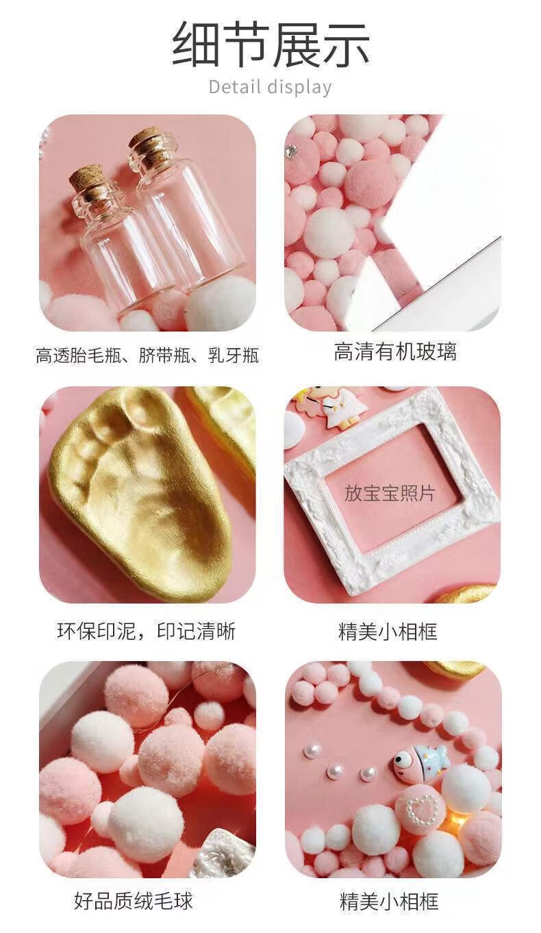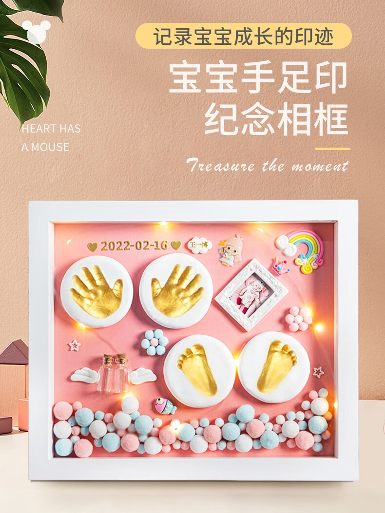 Full Moon Commemorative Hand and Footprint Mud Photo Frame Lanugo Hair Umbilical Cord Newborn Baby 100 Days Hand and Footprint Baby One-Year-Old Gift Model 12 Inch Simple Love Pink Style A