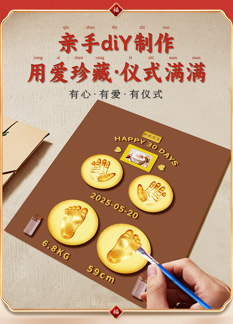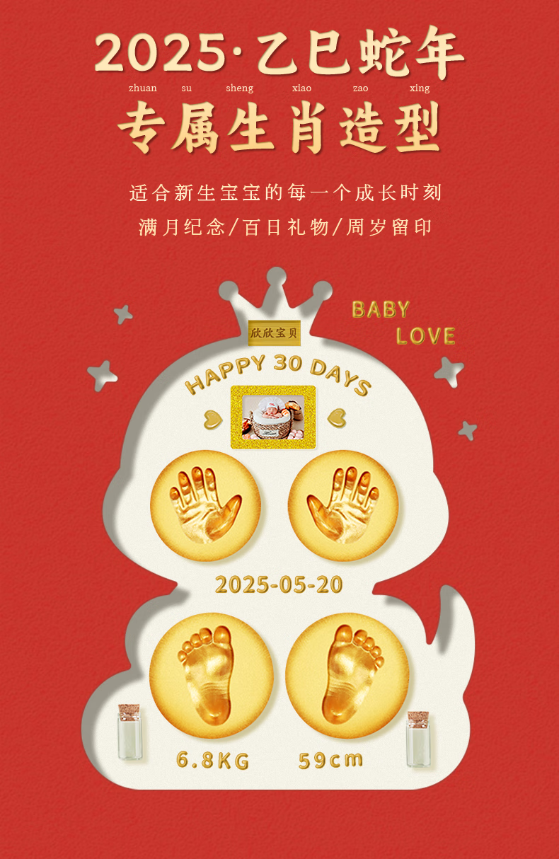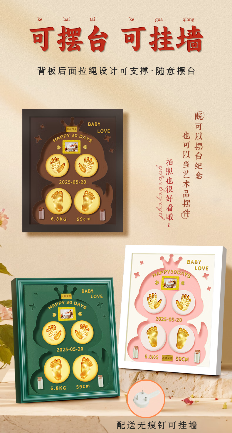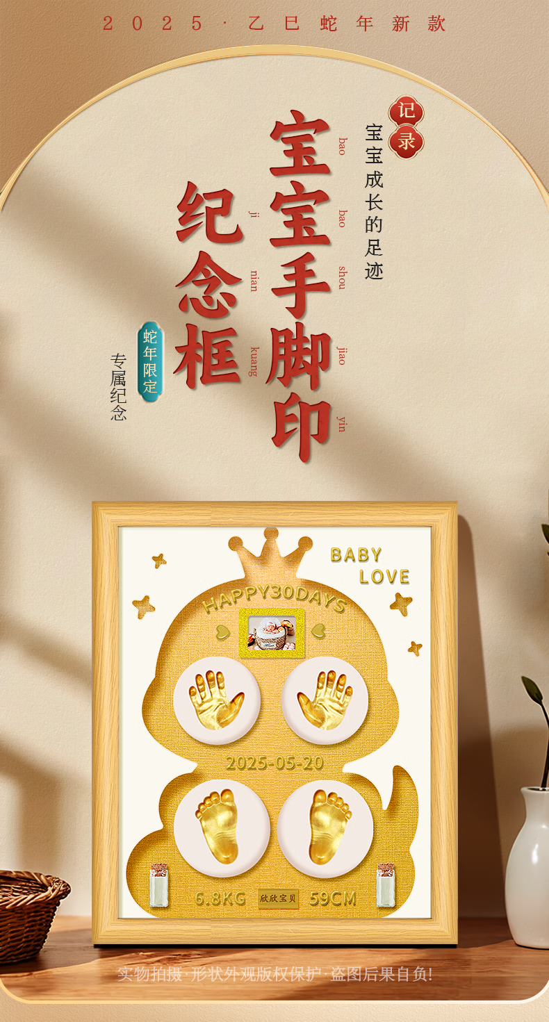 Shiyuexiaozai2025 Year of the Snake newborn baby's hand and foot prints, fetal hair, umbilical cord collection, baby's hand and foot prints, 100th day commemorative photo frame, solid wood color, Qiancheng Si brocade, blank + gold base, 12-inch regular package