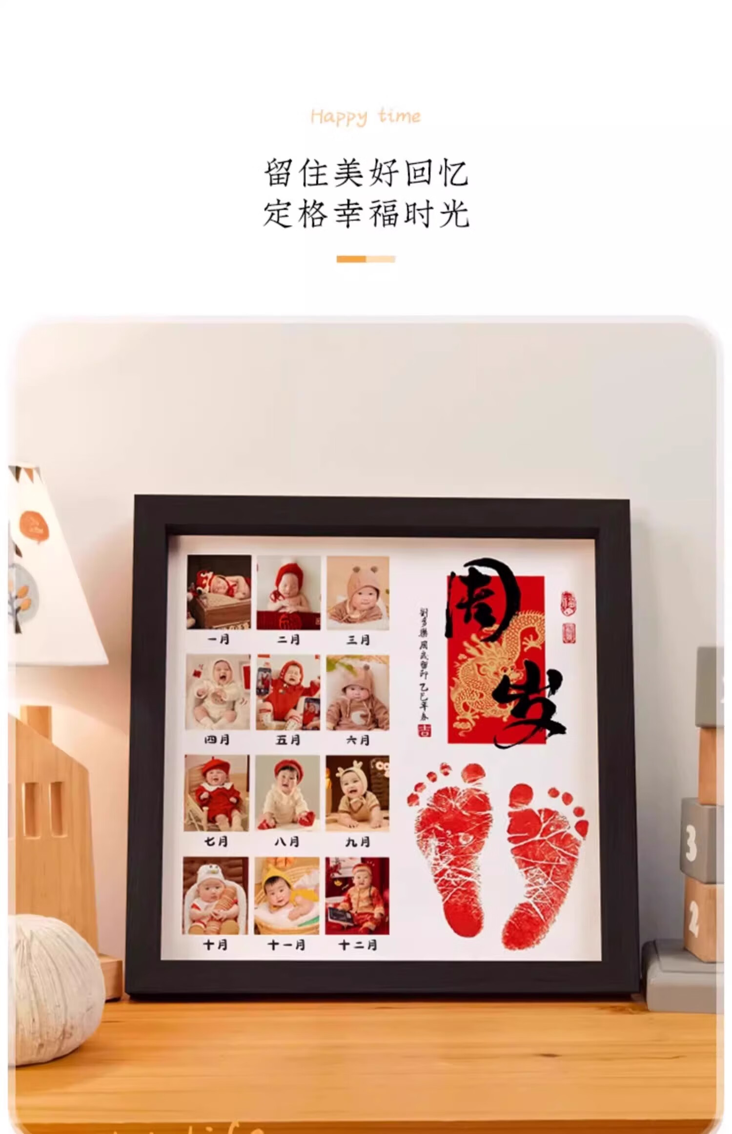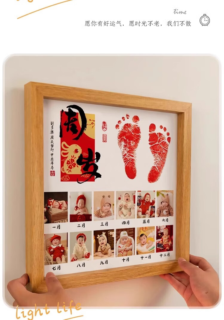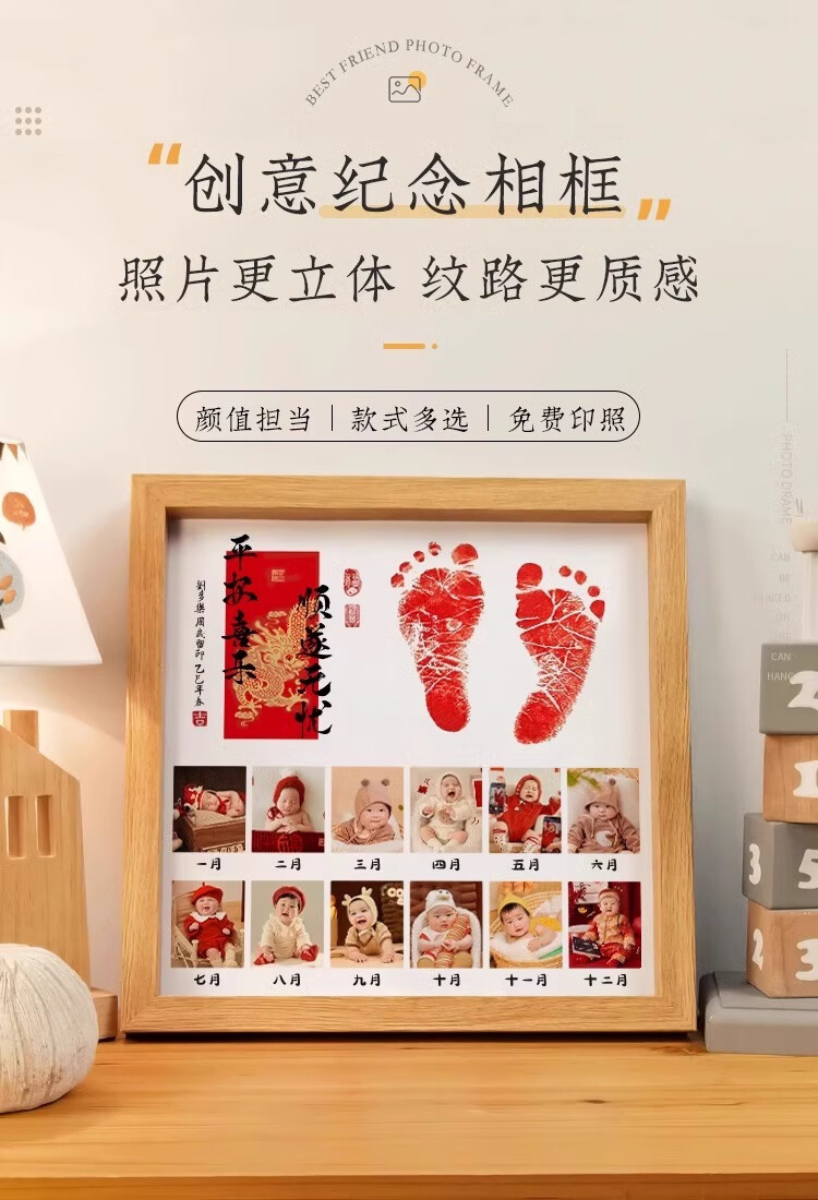 Baby dragon's one-year-old hand and foot print photo souvenir photo frame 100 days of baby footprints and full moon ceremony walnut color - one year old - horizontal version 33x33cm