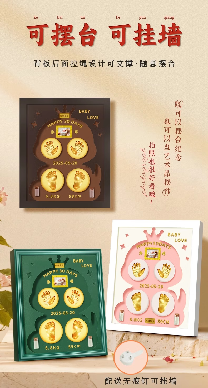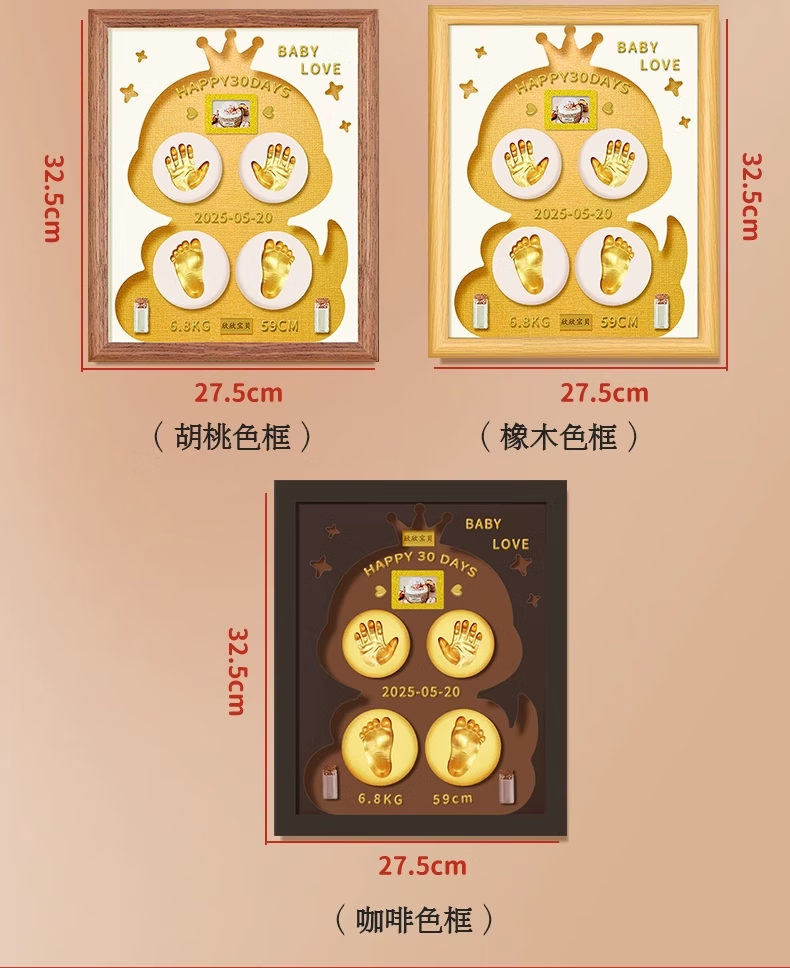 100-day Ceremony of Snake Treasure Full Moon, Hand and Foot Print Photo Frame, Souvenir, Lanugo Hair, Umbilical Cord Collection Box, Ink Pad, Hand and Footprint, 12-inch Log Frame with Blank Carving + Light Foundation + Warm Lamp
