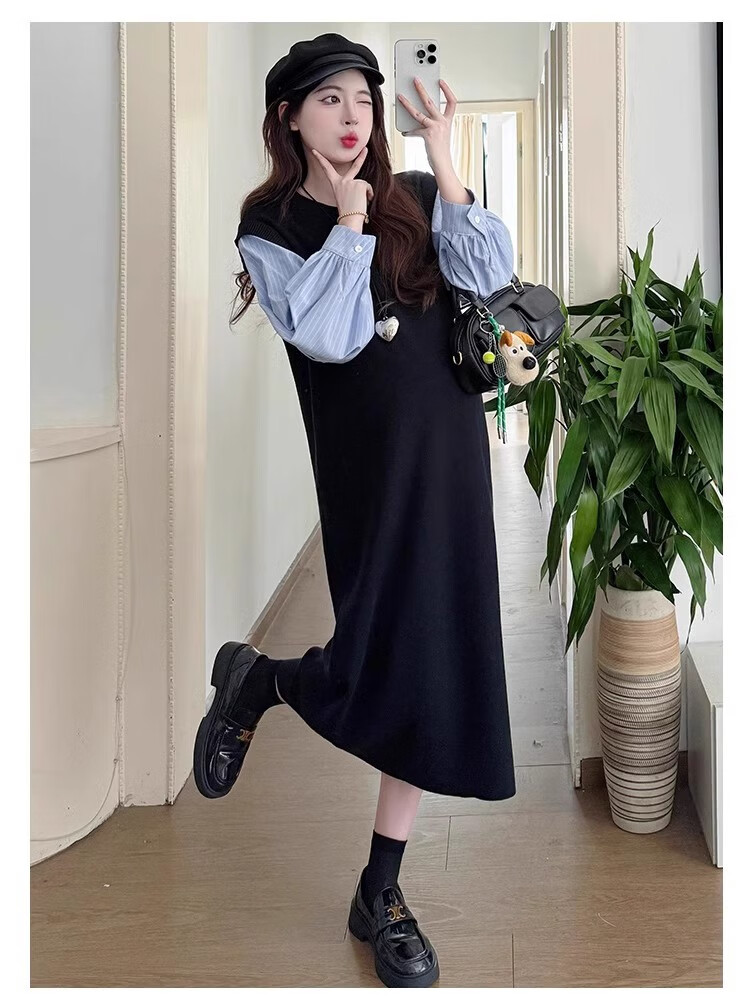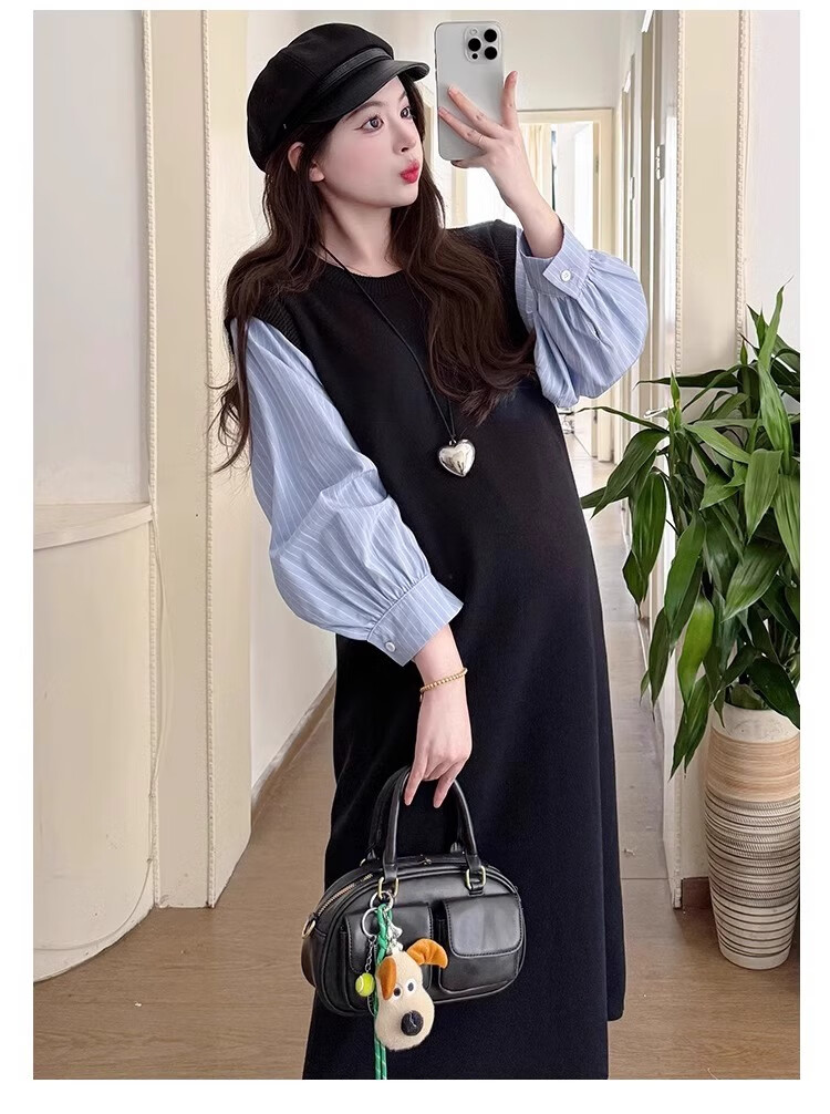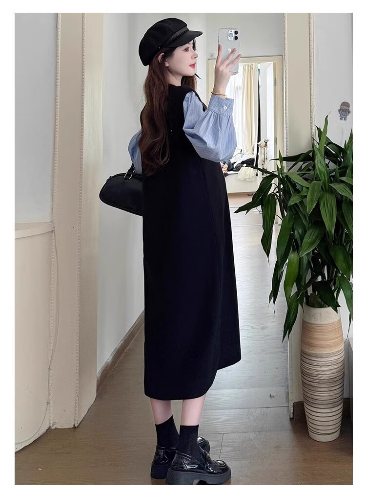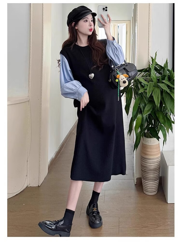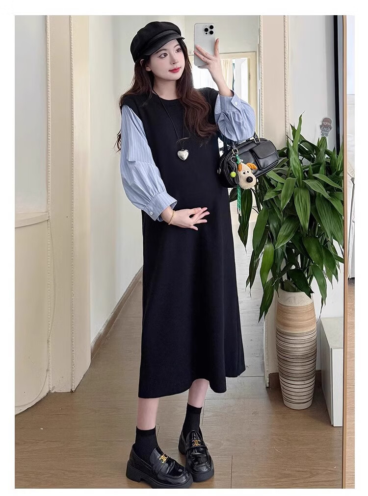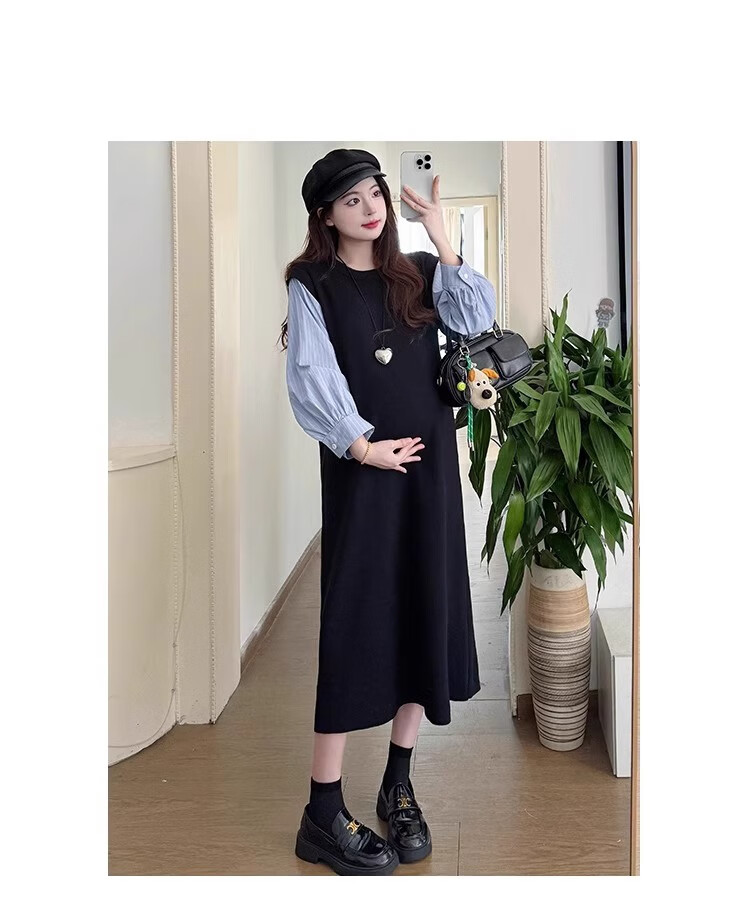 Geman Maternity Dress Spring and Autumn 2025 New Fashion Fake Two-Piece Loose Shirt Spliced Long Skirt Autumn Maternity Skirt Picture Color Dress + Skin Color Tights XL