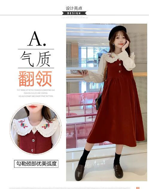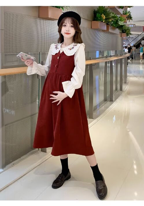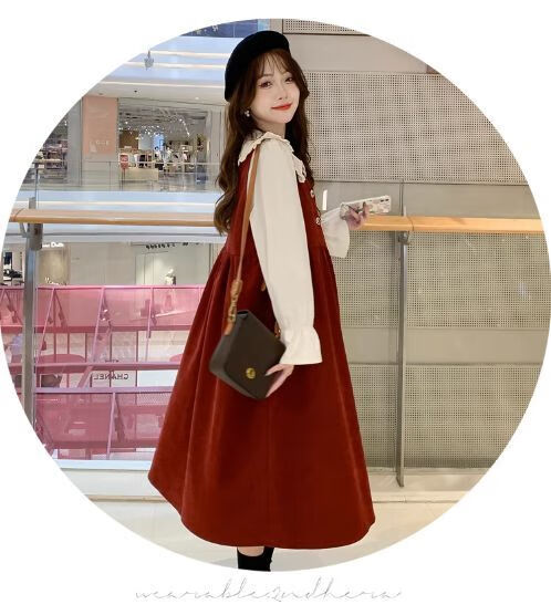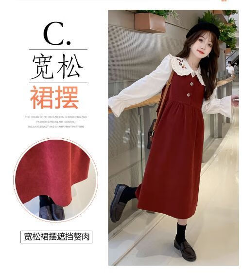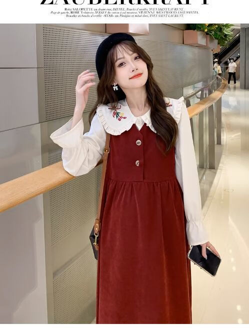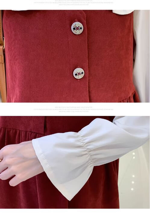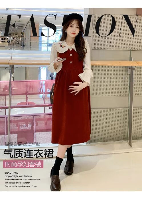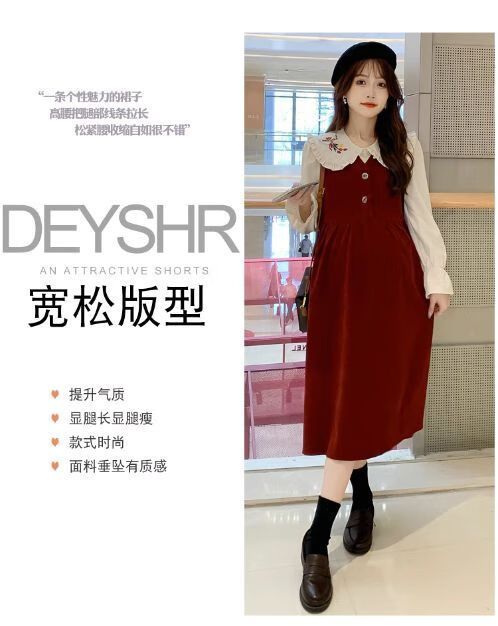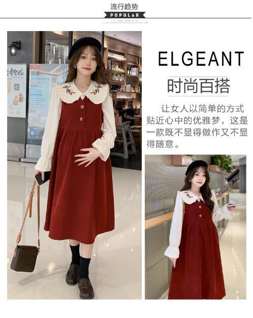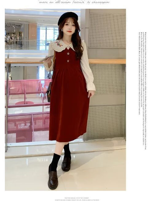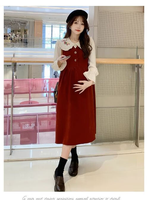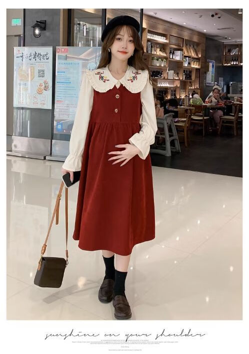 Maternity dress spring and autumn new design sense maternity wear loose doll collar shirt + vest sweet age-reducing trend red two-piece set L