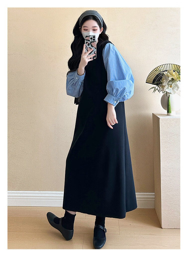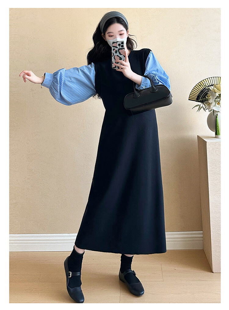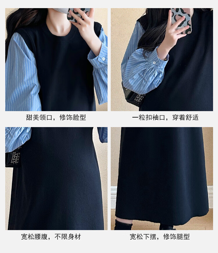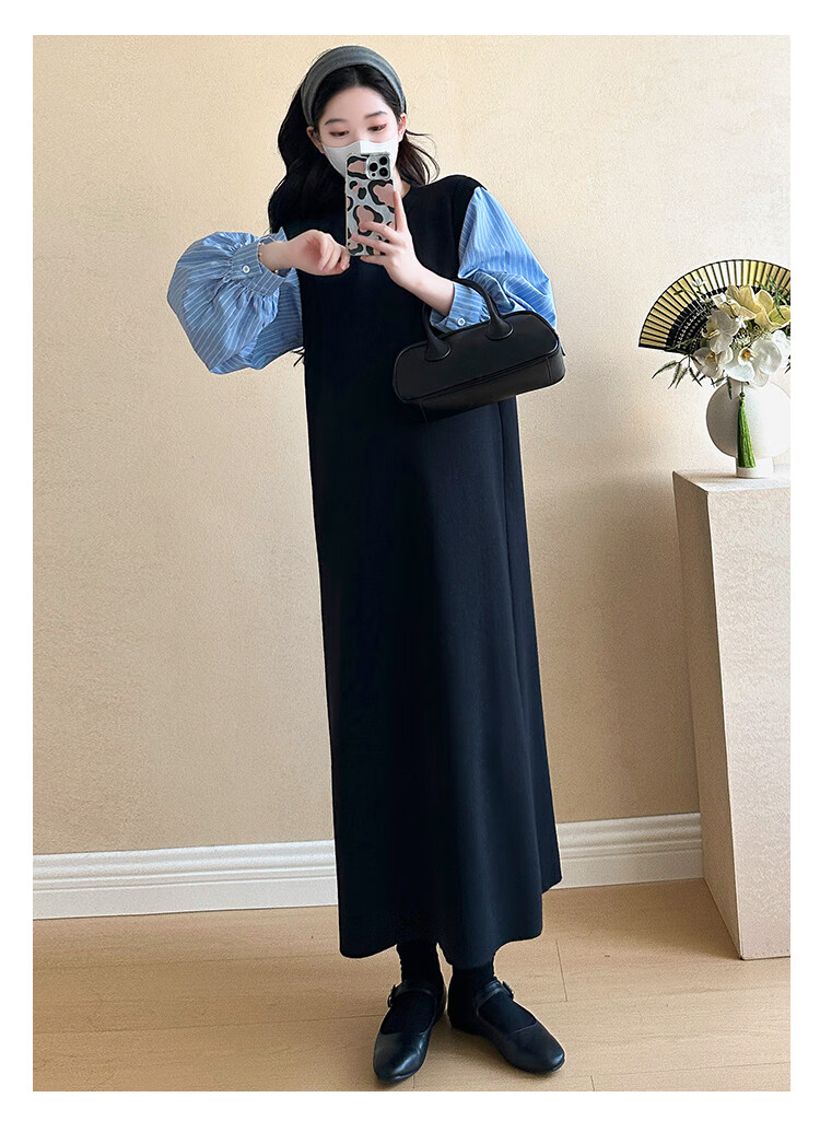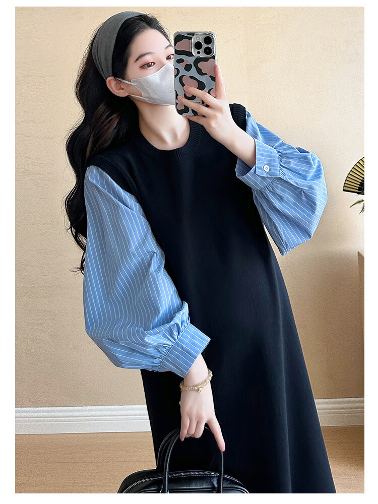 Ranqi Mommy Maternity Clothing 2025 Autumn New Designer Fake Two-piece Shirt Knitted Skirt Loose Slimming Spliced Maternity Dress Picture Color L