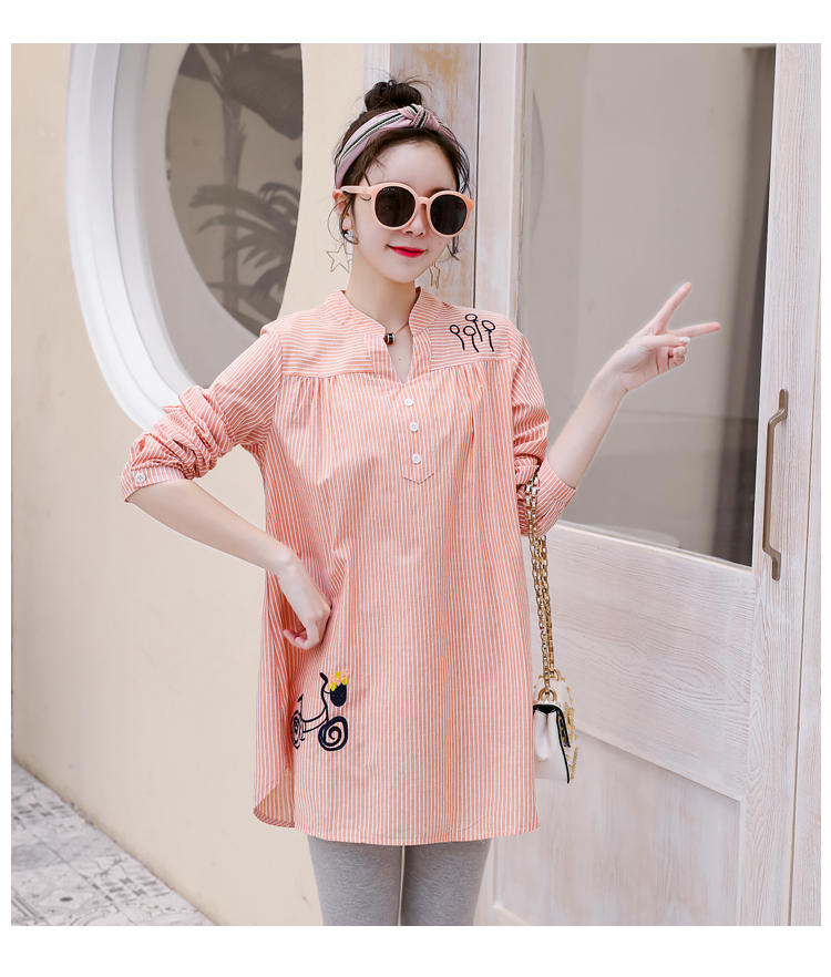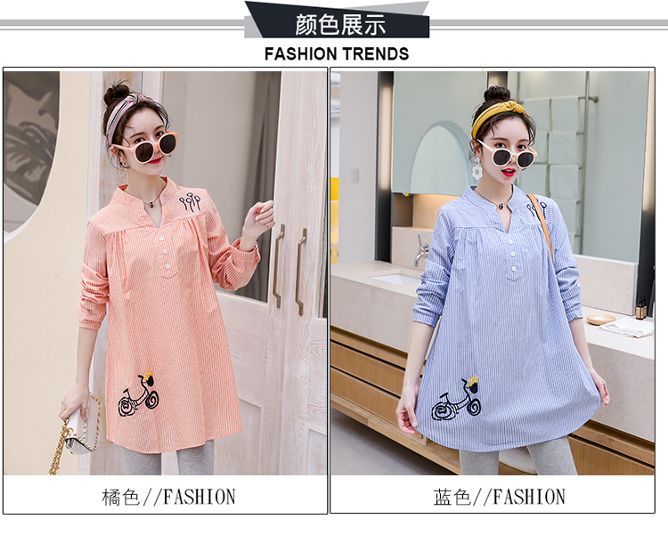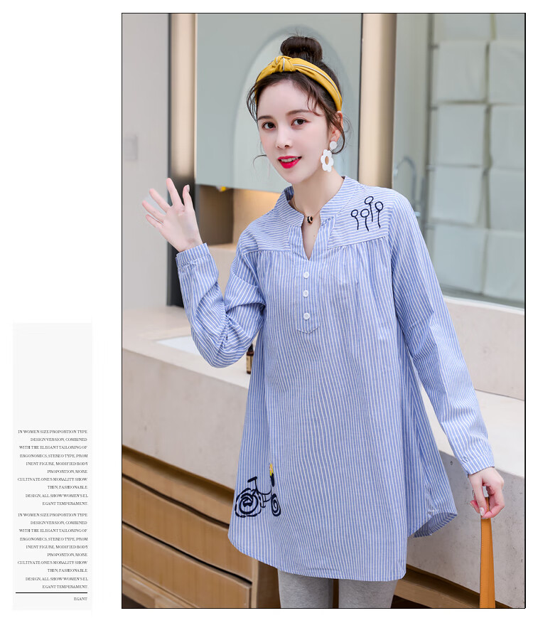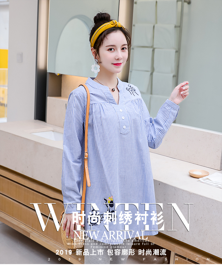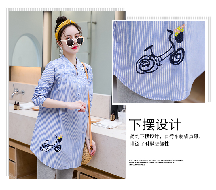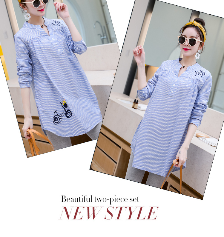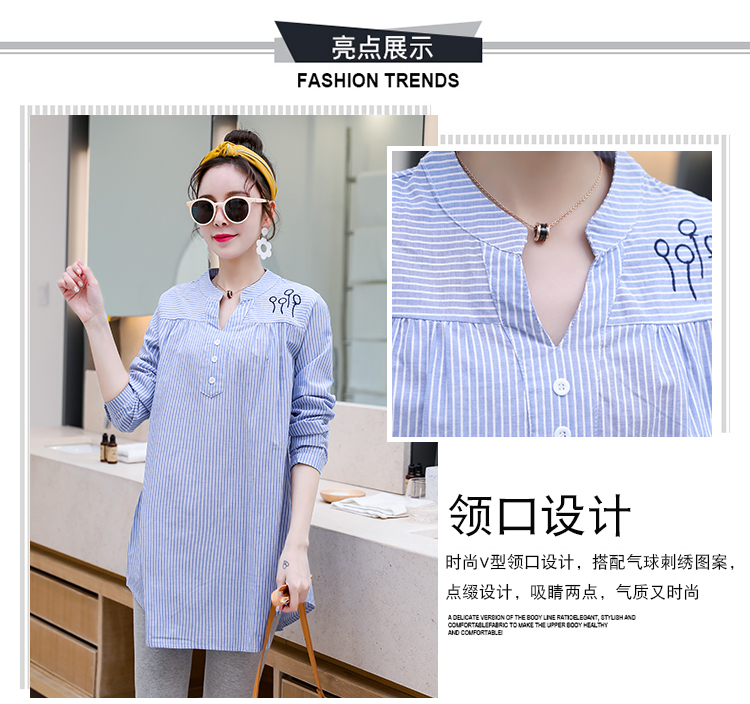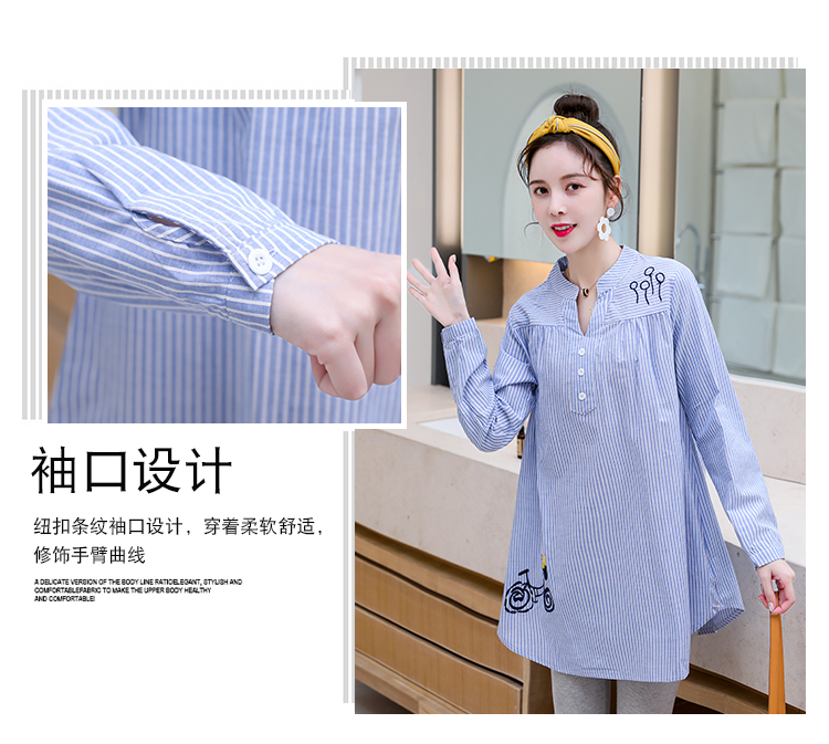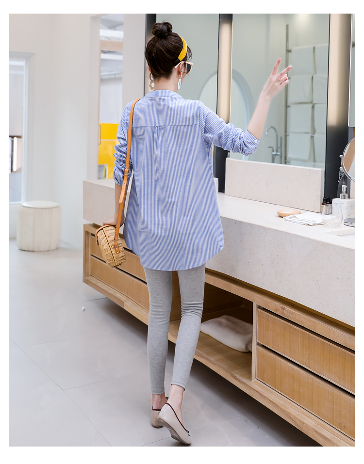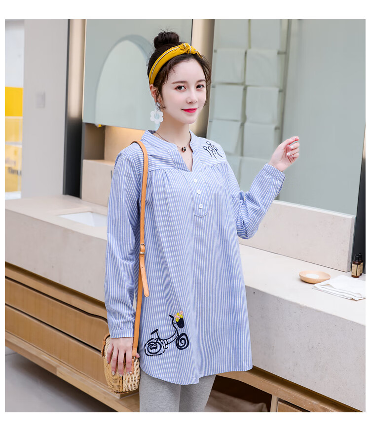 Maternity wear, spring and autumn shirts, long-sleeved shirts, mid-length autumn maternity wear, pure cotton two-piece striped tops for women, blue tops, long sleeves, L recommended 120-140 Jin Jin equals 0.5 kg