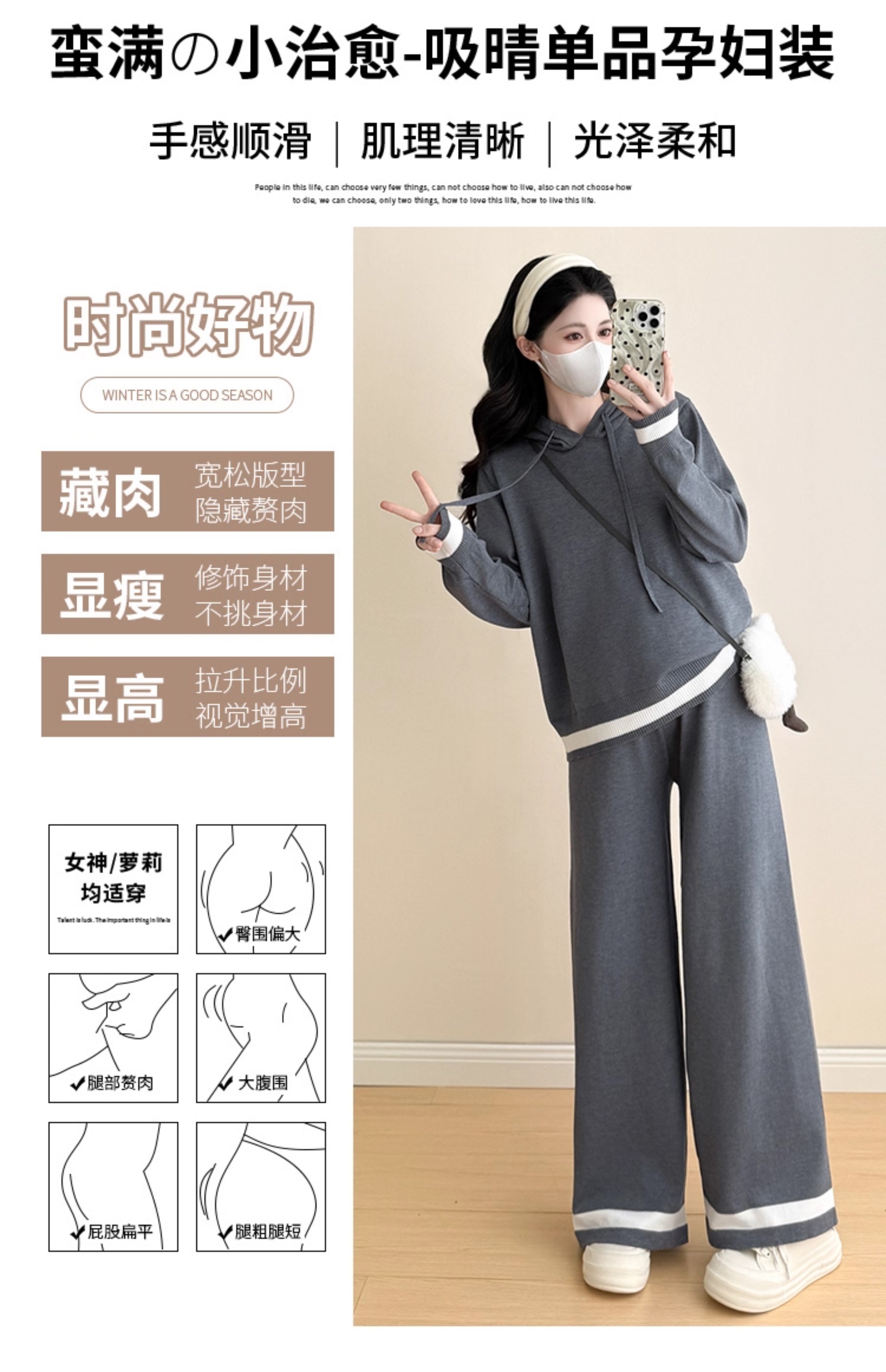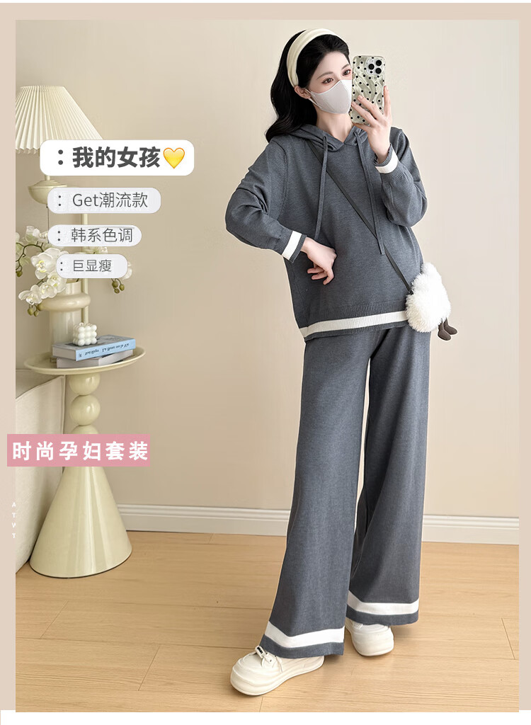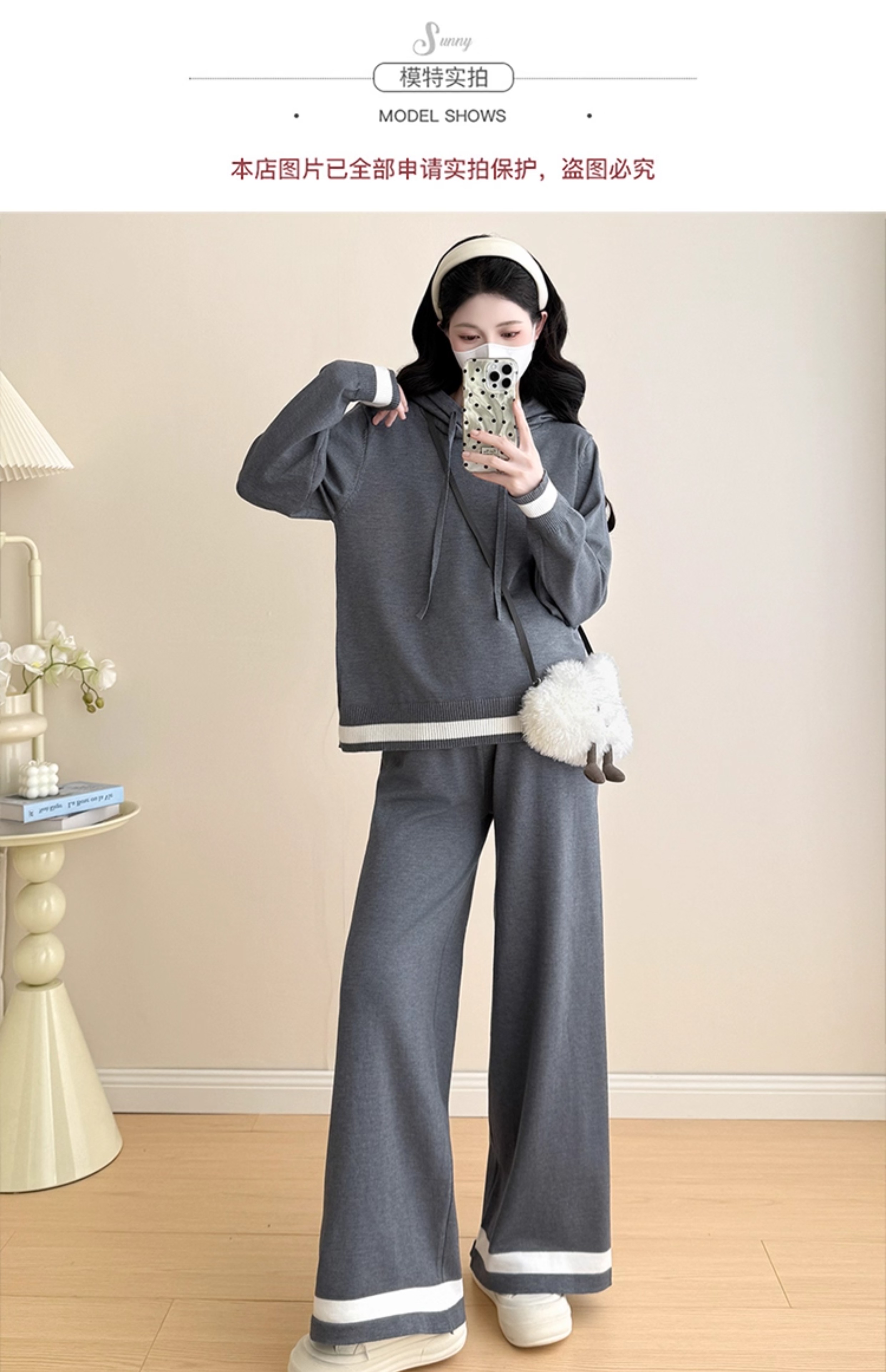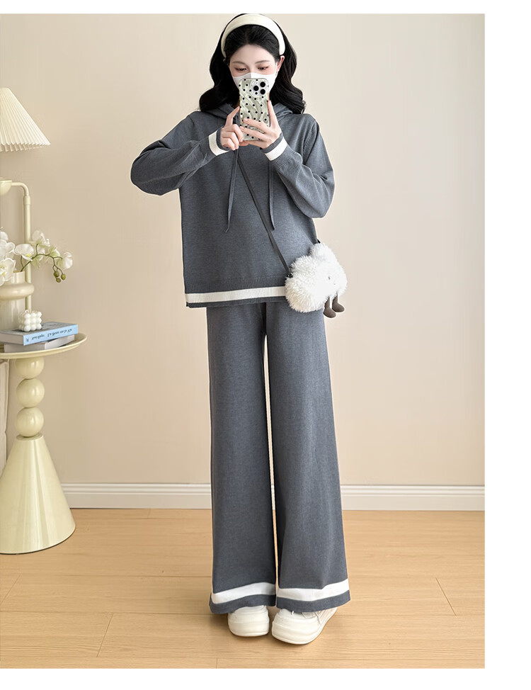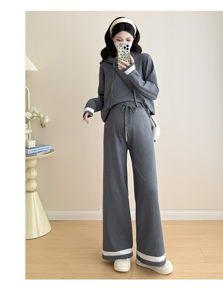 Mother's true color maternity gray suit autumn and winter 2025 new fashion simple lazy hooded knitted sweater wide leg pants two-piece set gray suit XXL