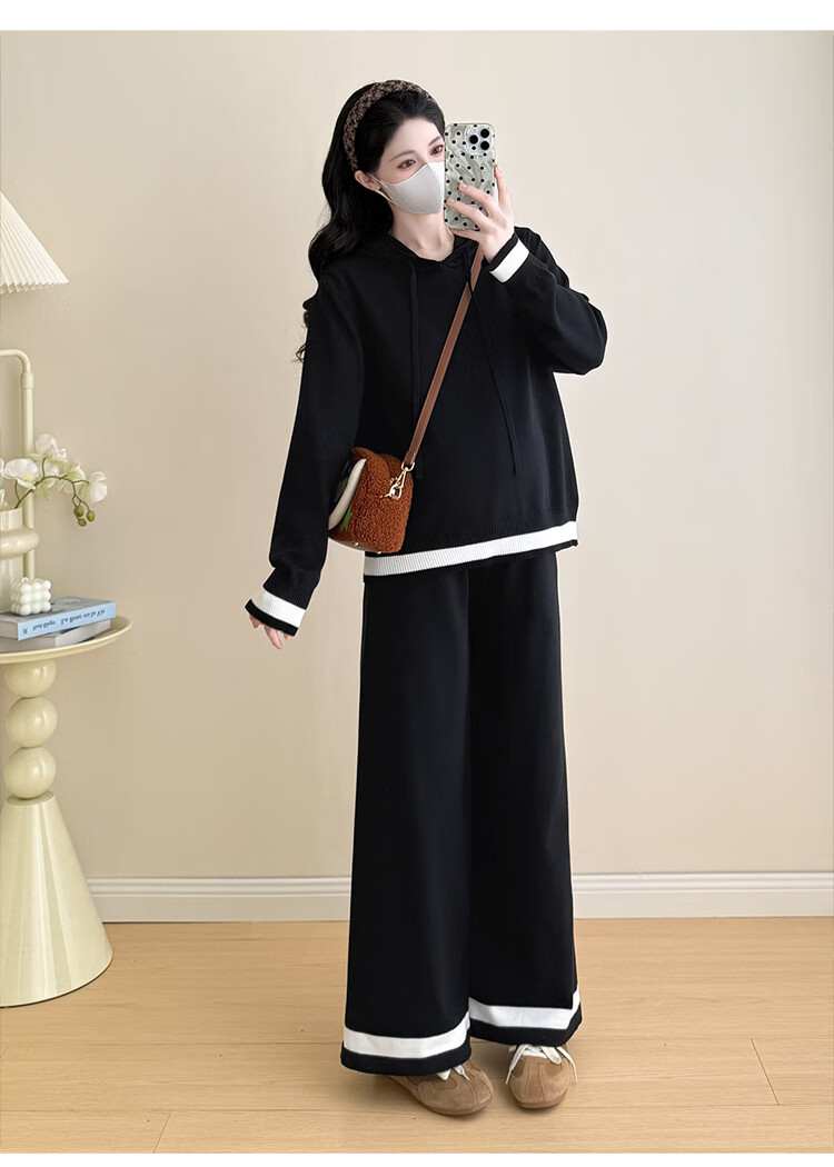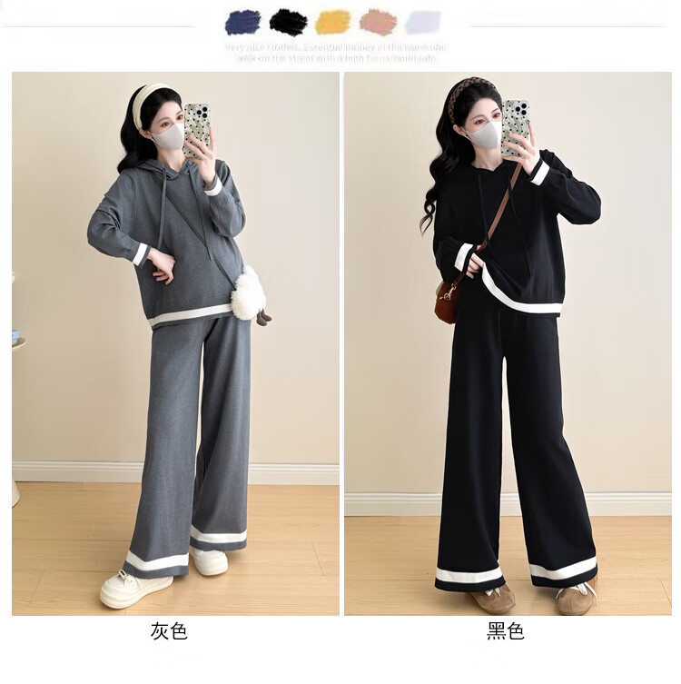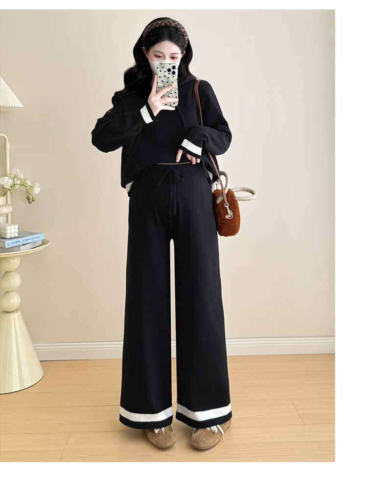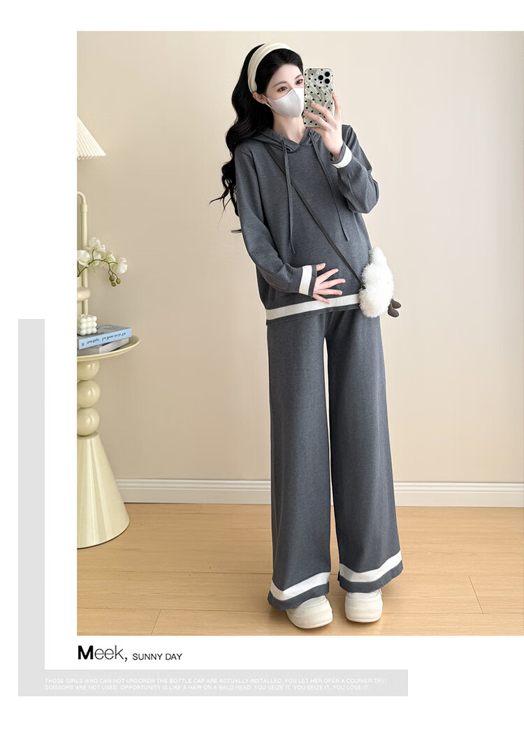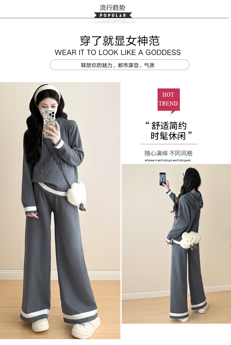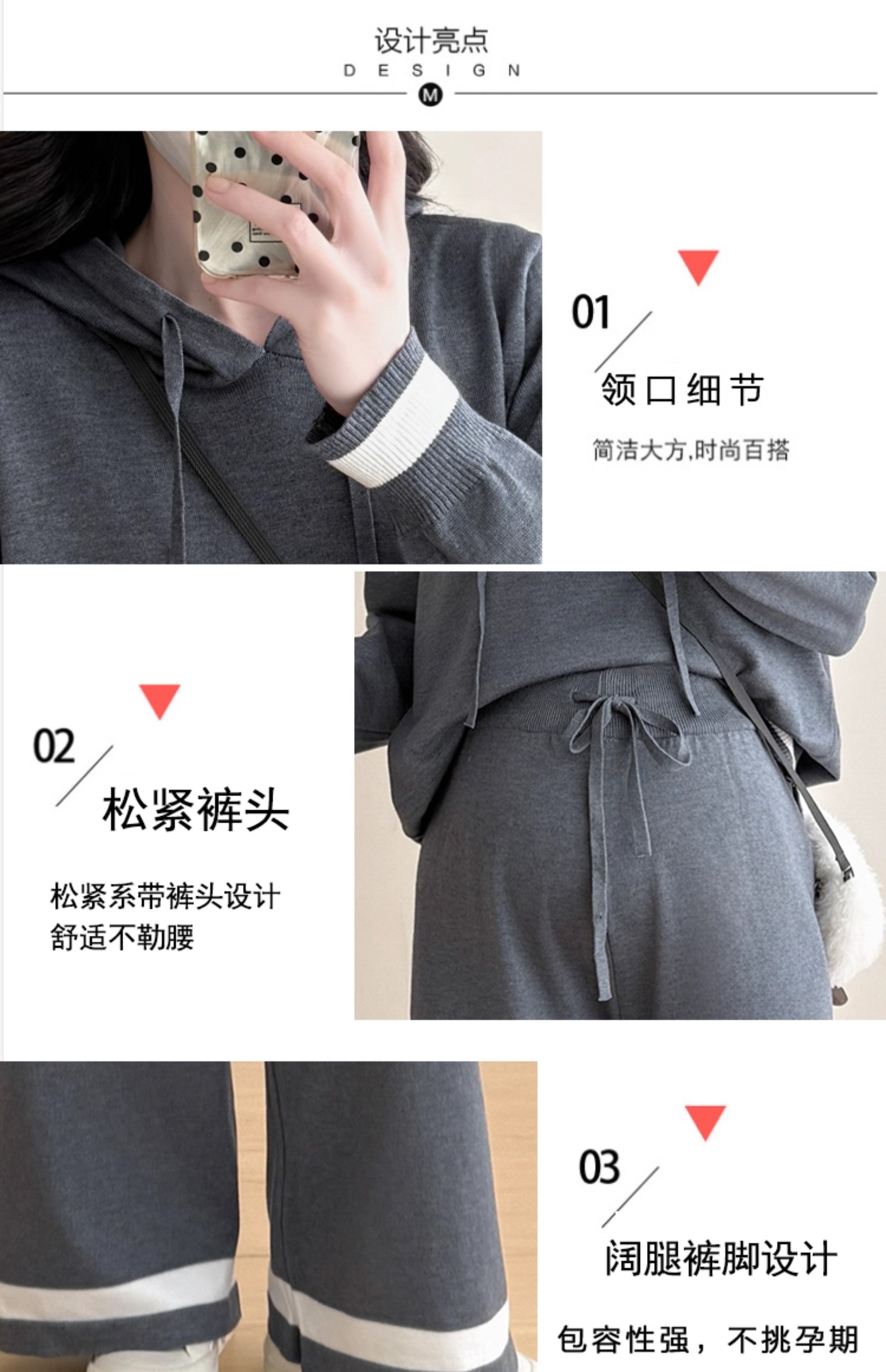 Mother's true color maternity gray suit autumn and winter 2025 new fashion simple lazy hooded knitted sweater wide leg pants two-piece set gray suit XXL