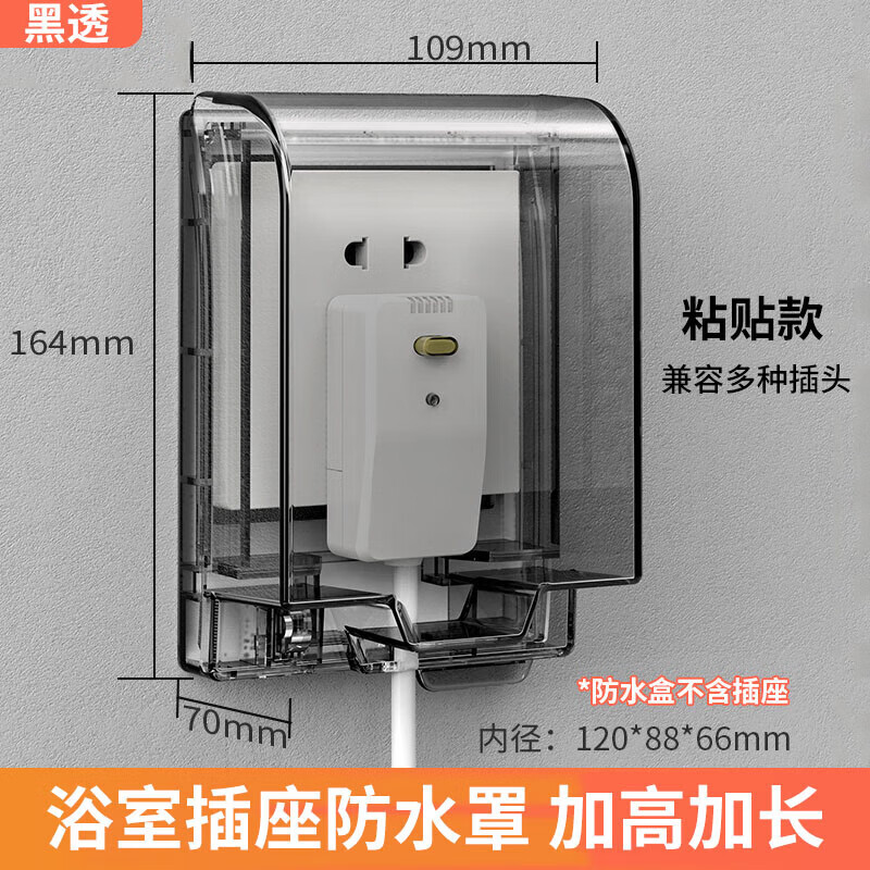 Socket waterproof cover, socket protective cover, bathroom socket waterproof box, bathroom switch splash-proof box protective cover cover, black transparent, taller and longer adhesive version, one pack