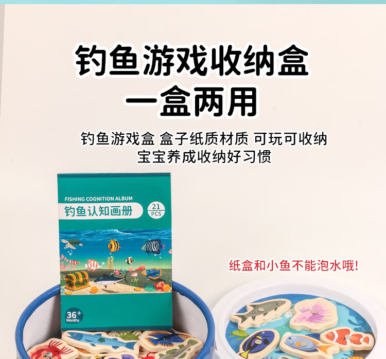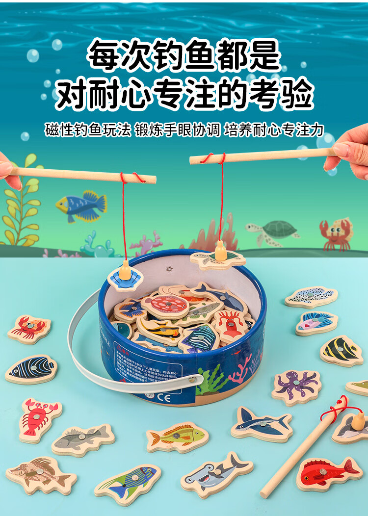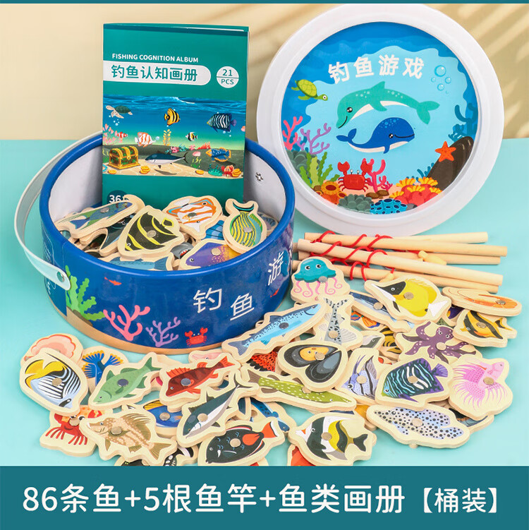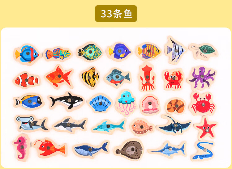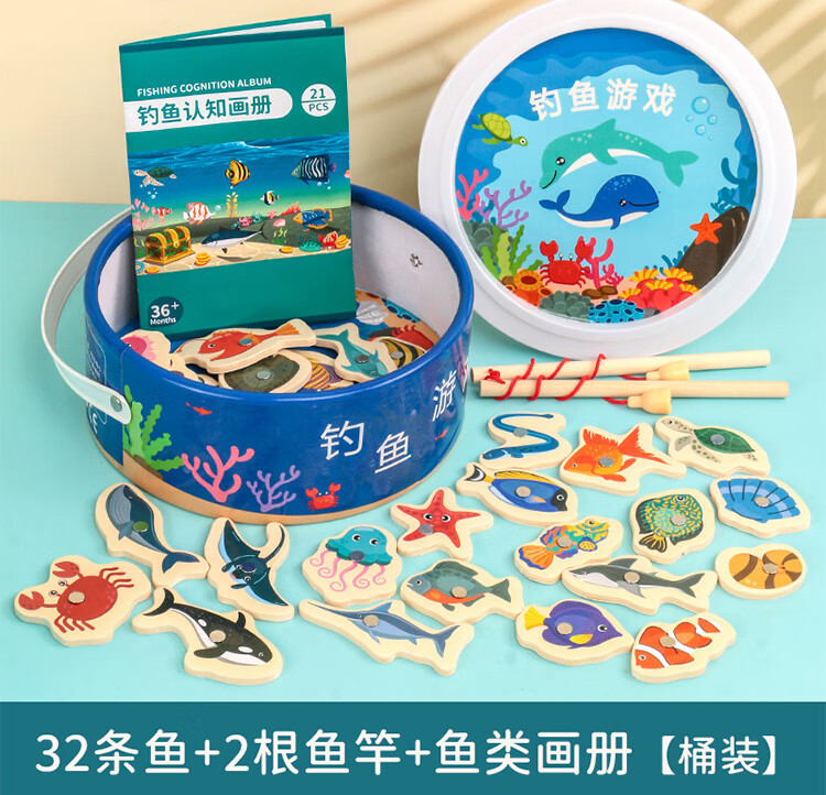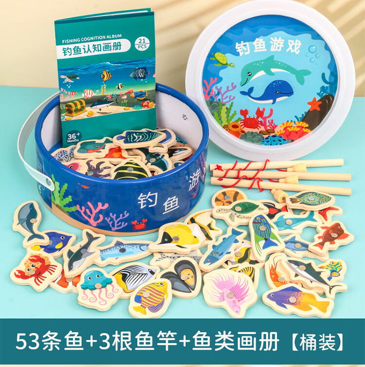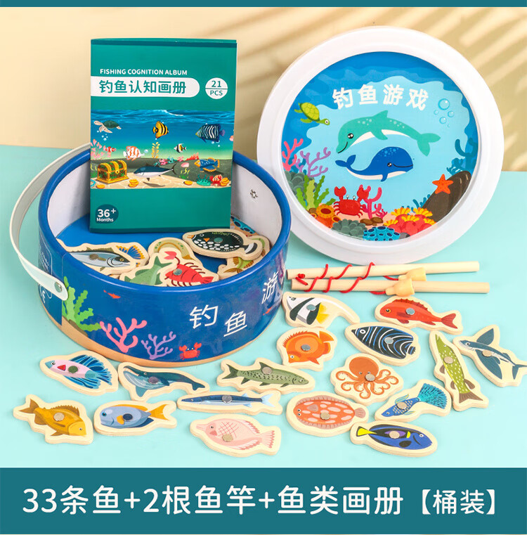 Childish fishing toys for children wooden baby magnetic small fish infant educational puzzle 1-2 years old 1 to 2 and a half years old 3 boys and girls barreled 33 fish + 2 fishing rods + fish pictures