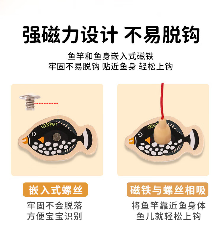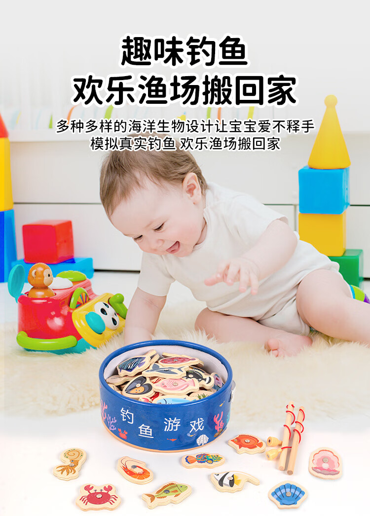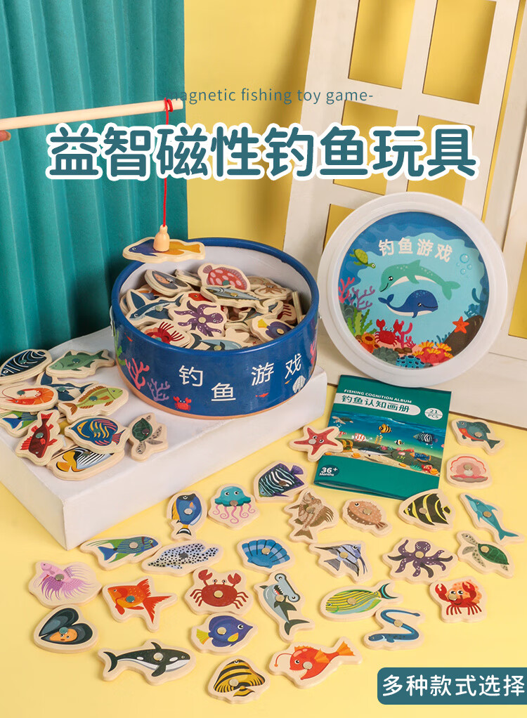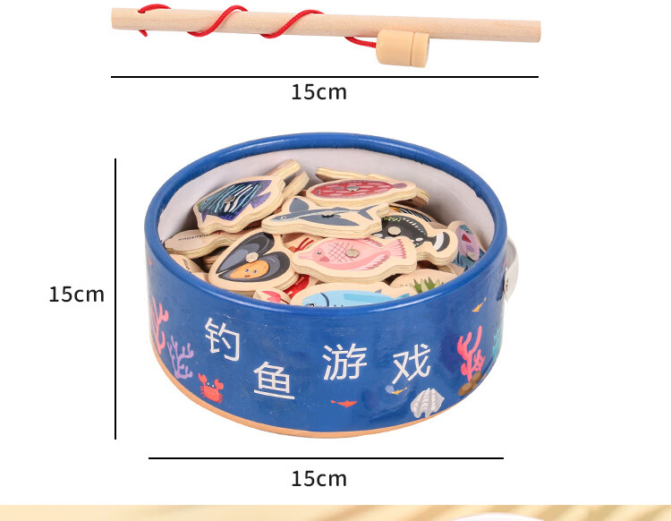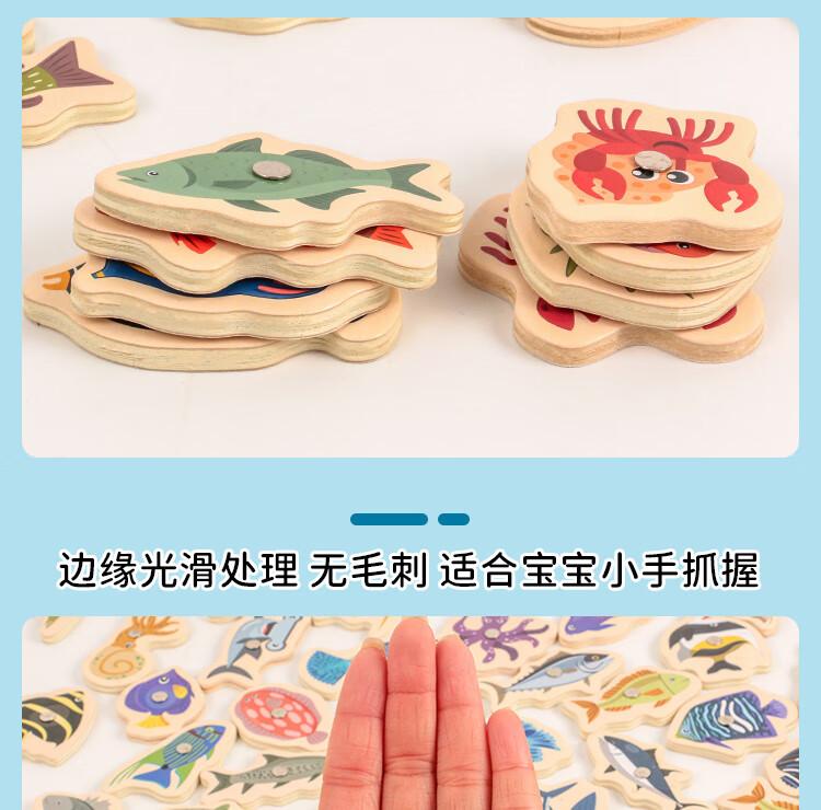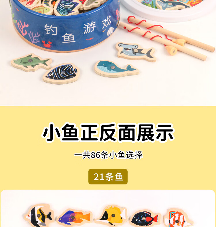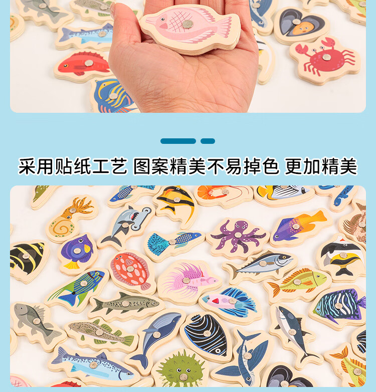 Childish fishing toys for children wooden baby magnetic small fish infant educational puzzle 1-2 years old 1 to 2 and a half years old 3 boys and girls barreled 33 fish + 2 fishing rods + fish pictures