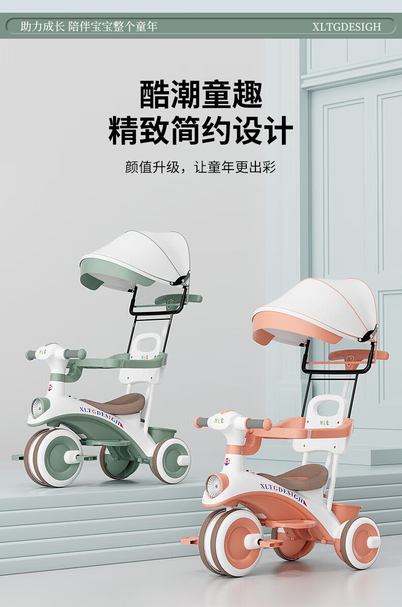 Beiq children's tricycle 1-3 years old bicycle baby walking artifact baby stroller 3-in-1 stroller safety guardrail + backrest + steering push rod green push and ride dual-purpose 0-6 years old baby bicycle