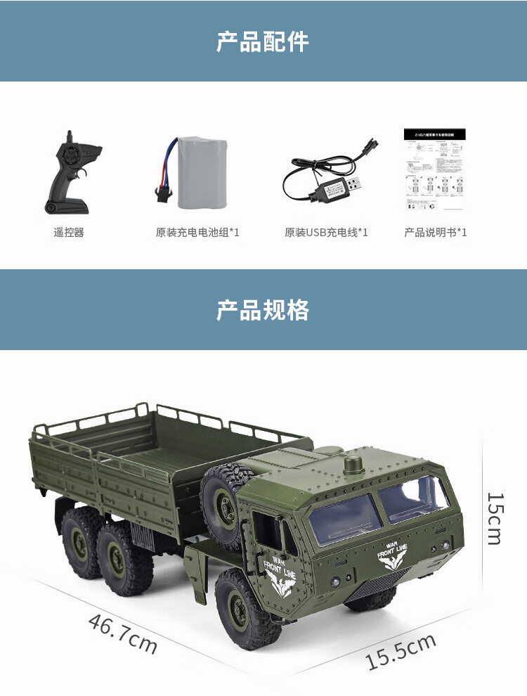 Zhouke children's remote-controlled transport vehicle heavy-duty truck off-road electric cargo truck climbing six-wheel drive car children's electric car alloy front green remote-controlled six-wheel military truck 31cm high configuration three-power about 90 minutes of use