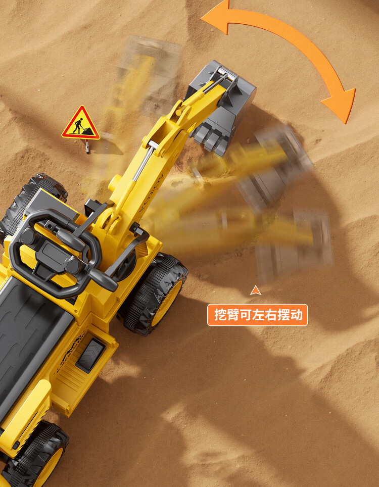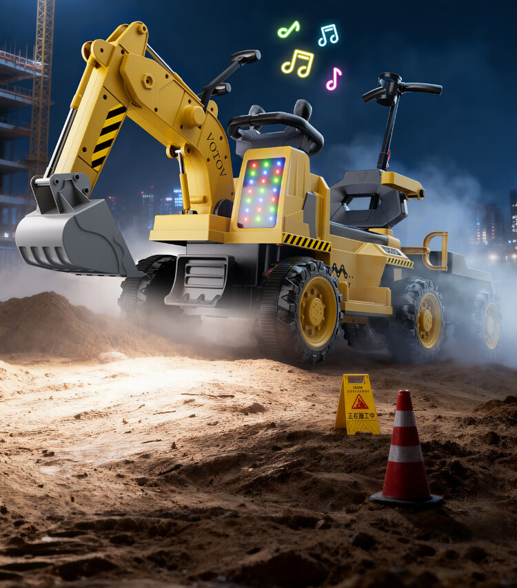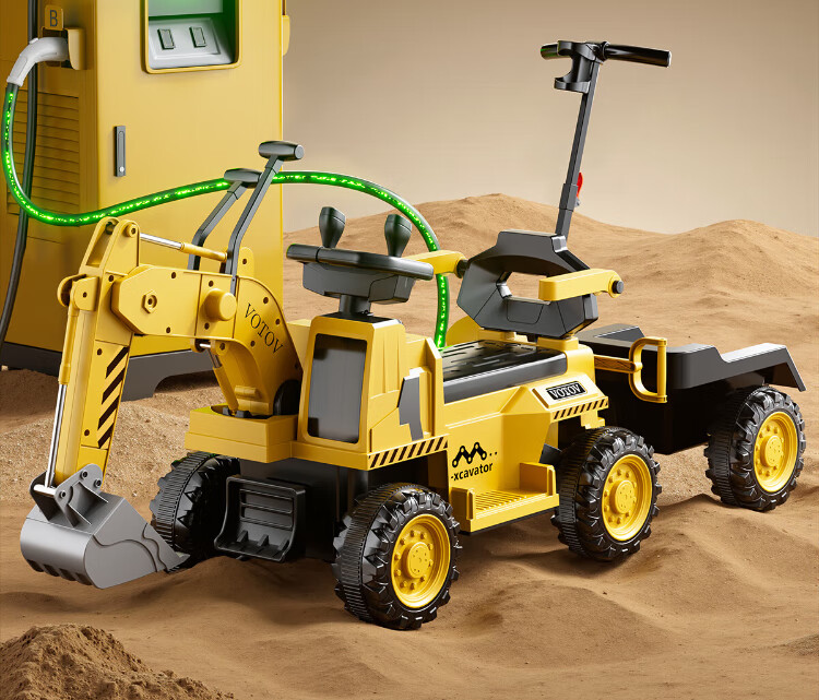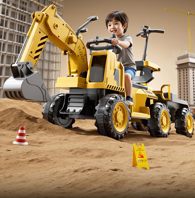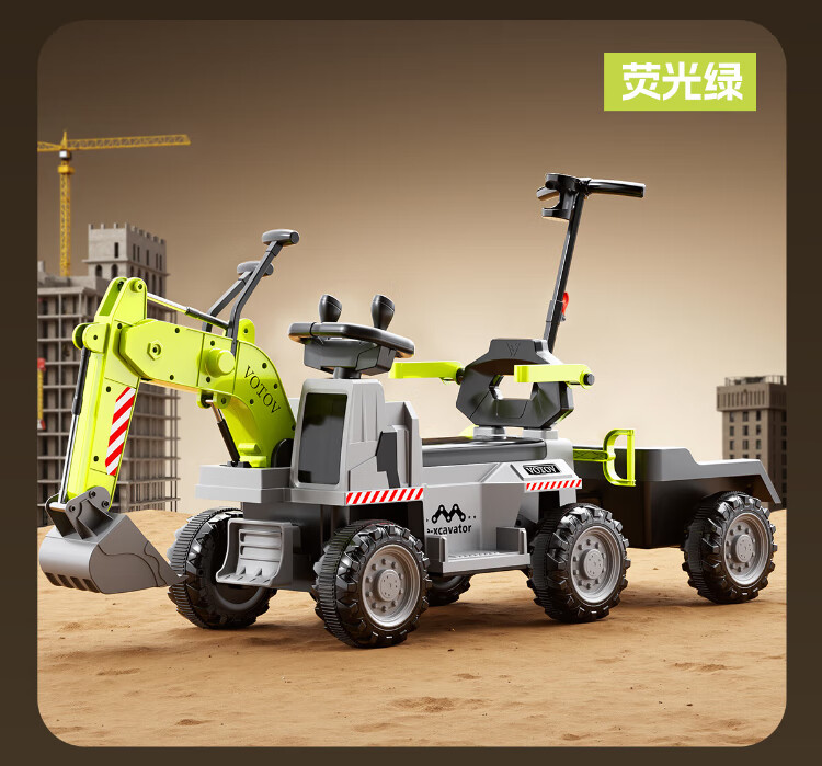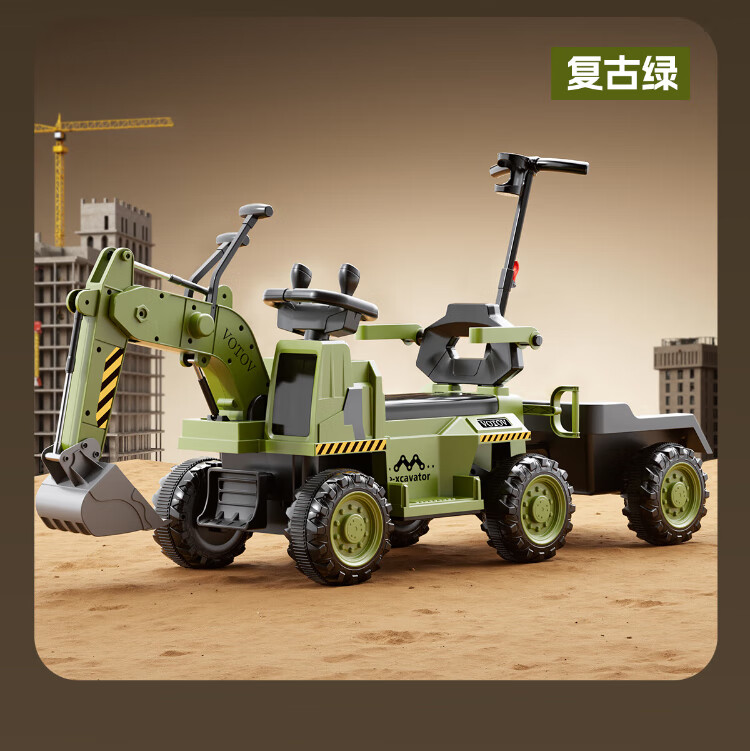Haha strange children's electric excavator can sit on children's electric car, children's car toy car, large can sit on people digging soil gift, retro green | dual drive + 6V12A battery + push handle + remote control + gift