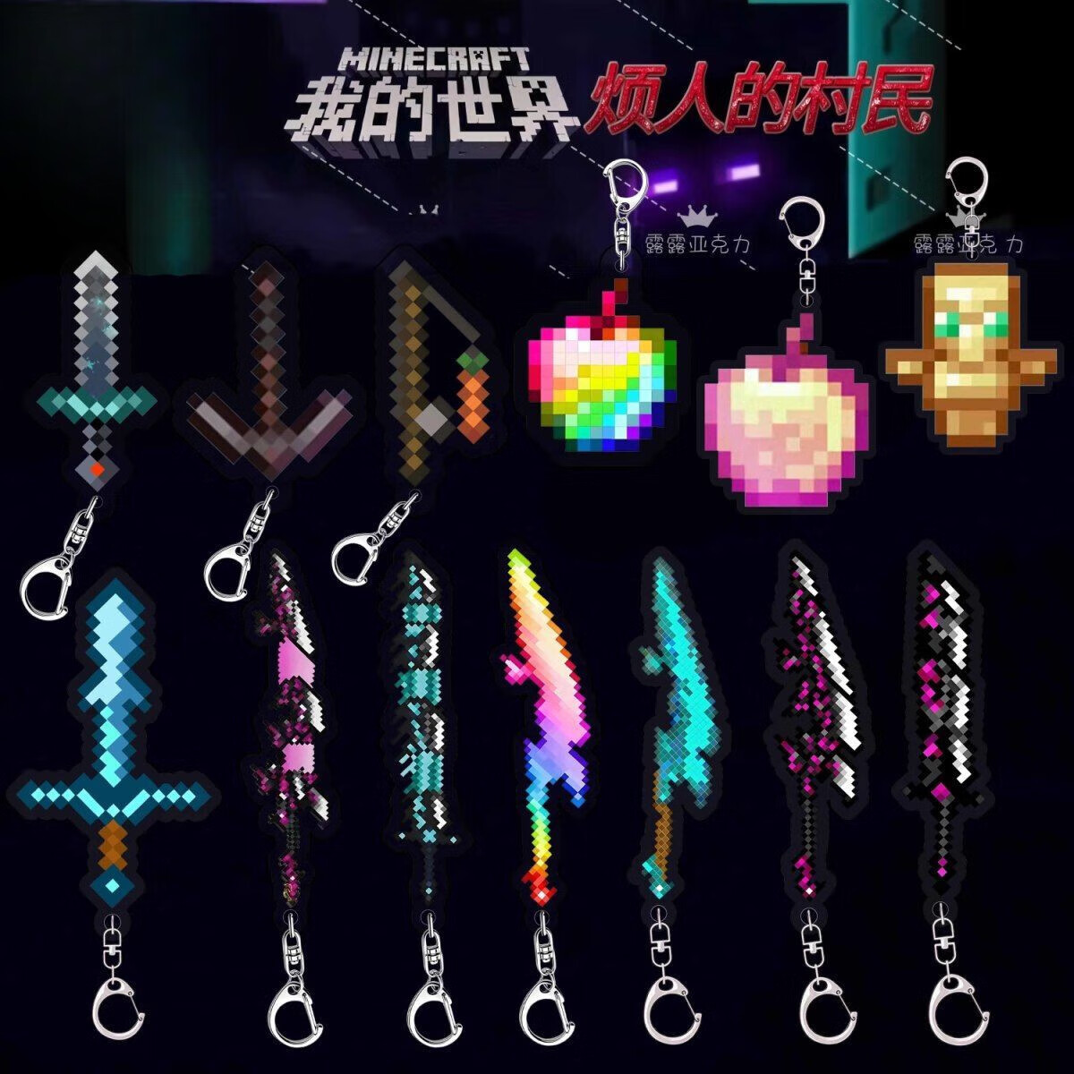 Benfox Minecraft Pendant Complete Set Keychain Undying Totem Enchanted Golden Apple Alloy Pickaxe Sword Yak Minecraft Keychain Complete Set of 12 Pieces Top Accessories Tear-off Film Used High-Definition Printing