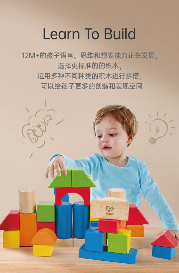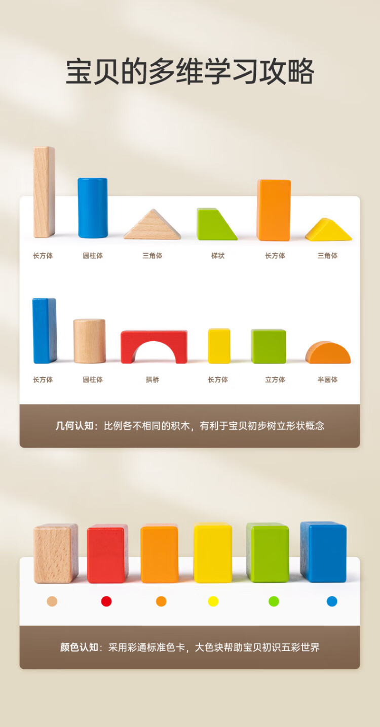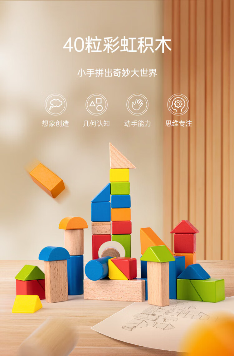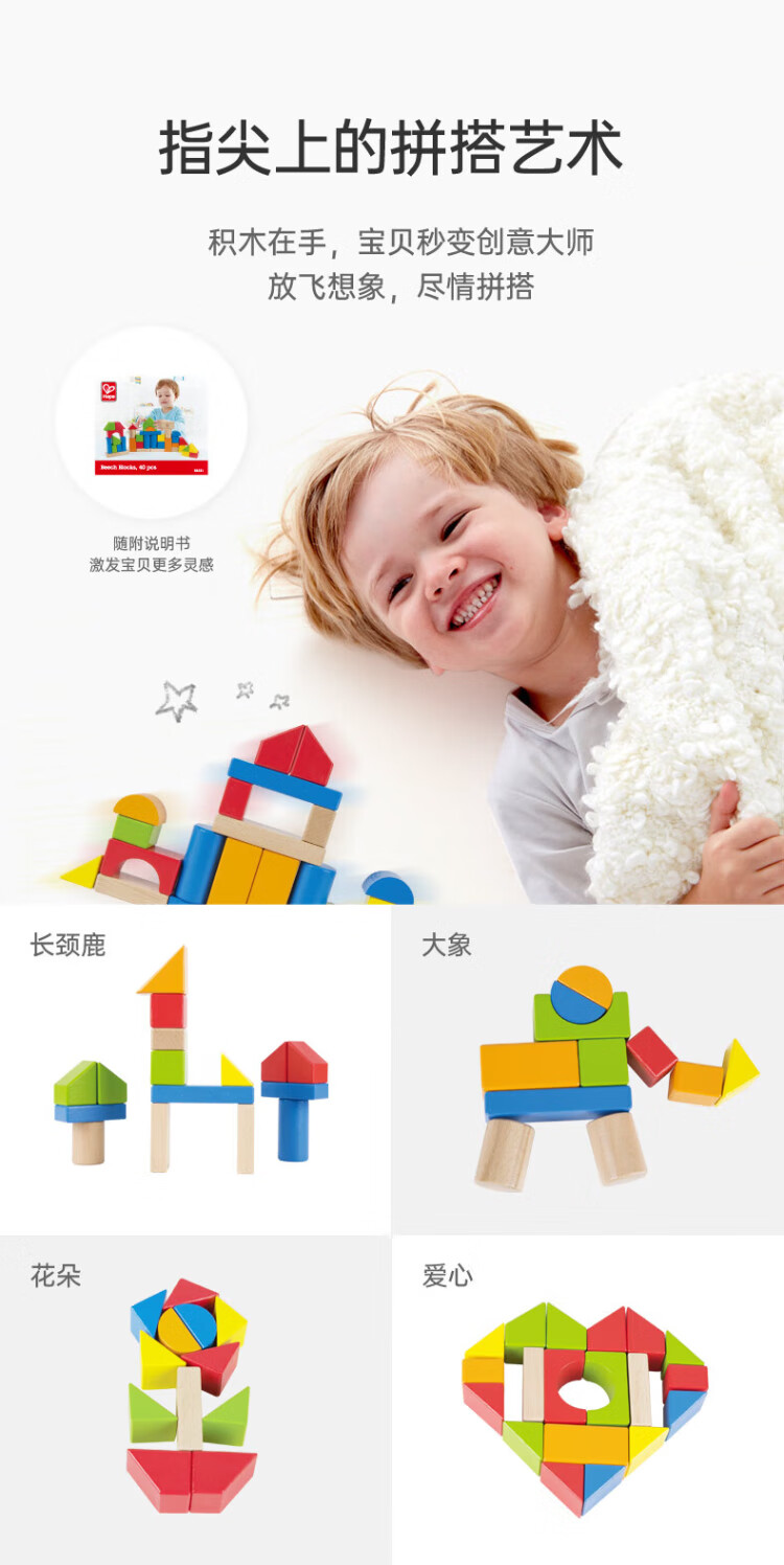 Hape (Germany) infant and toddler building wooden building block toys 40 pieces rainbow building blocks baby birthday gift E8321