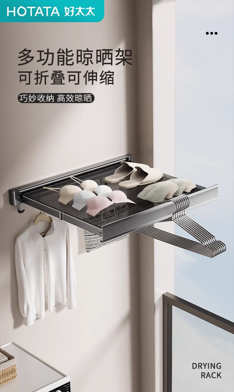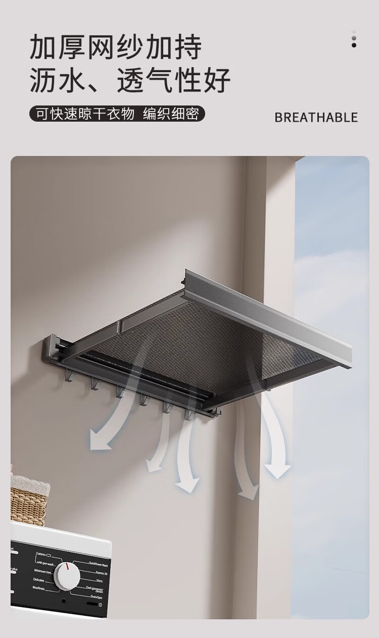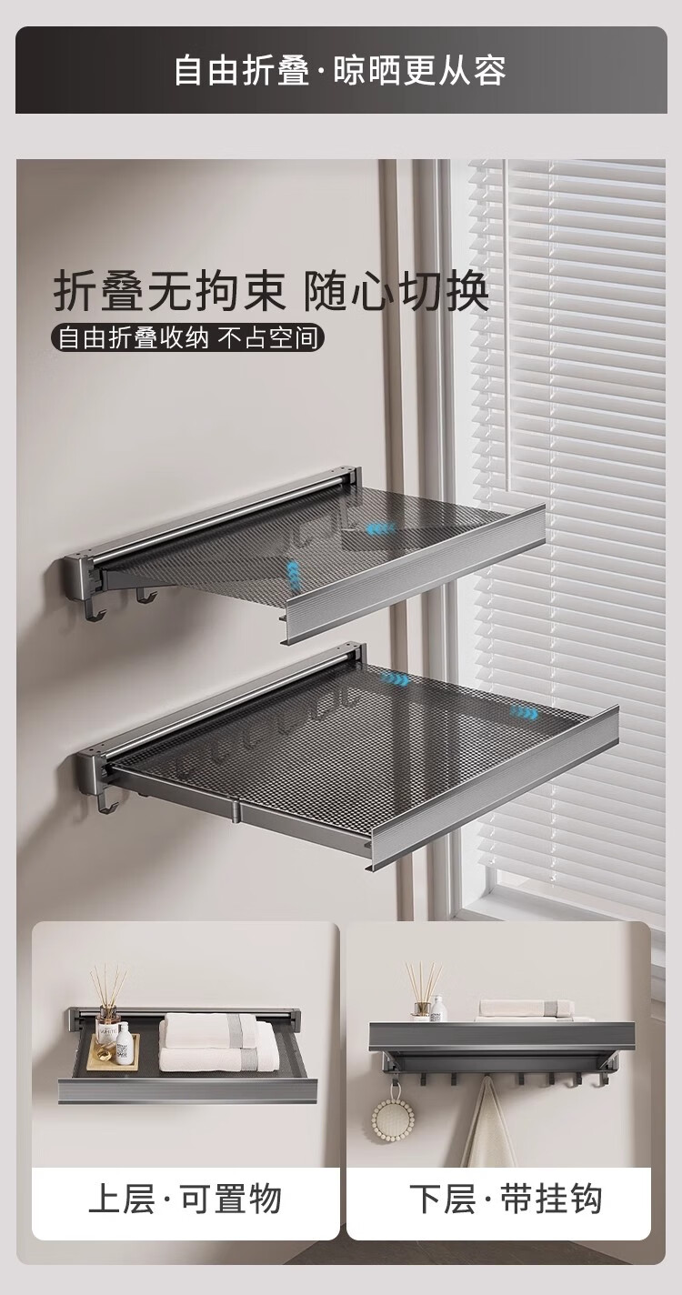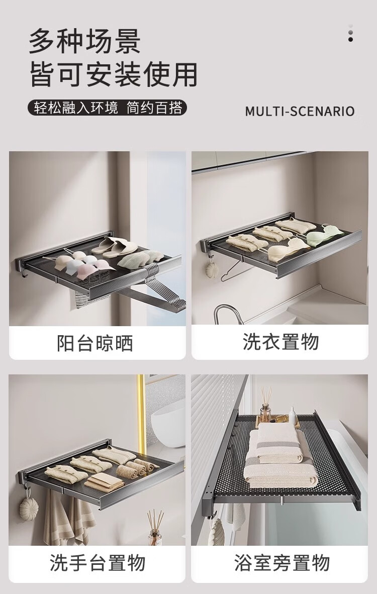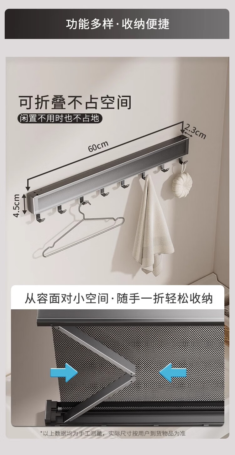 Good wife multifunctional home bathroom/balcony can store things and can be laid flat for drying. The wall rack can be retracted and stored with hooks. Large size 60cm can be retracted and stored with 8 hooks.