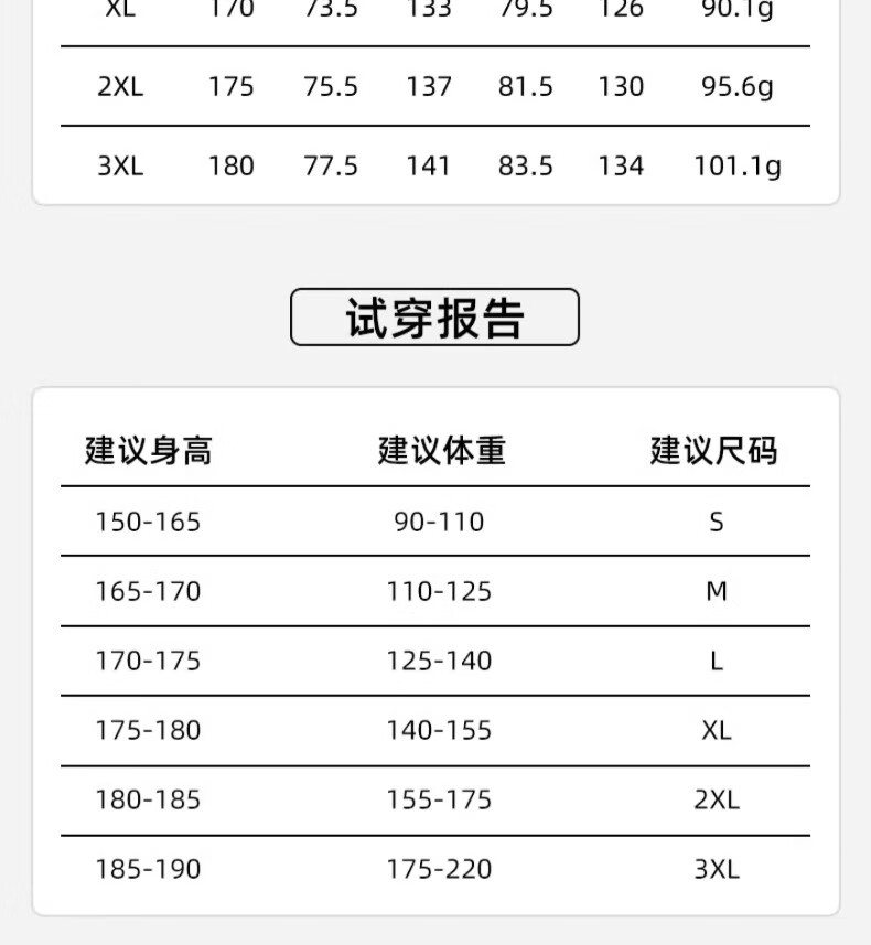 China (cm) 165 / 88-90 170 / 96-98 175 / 108-110 180 / 118-122 185 / 126-130