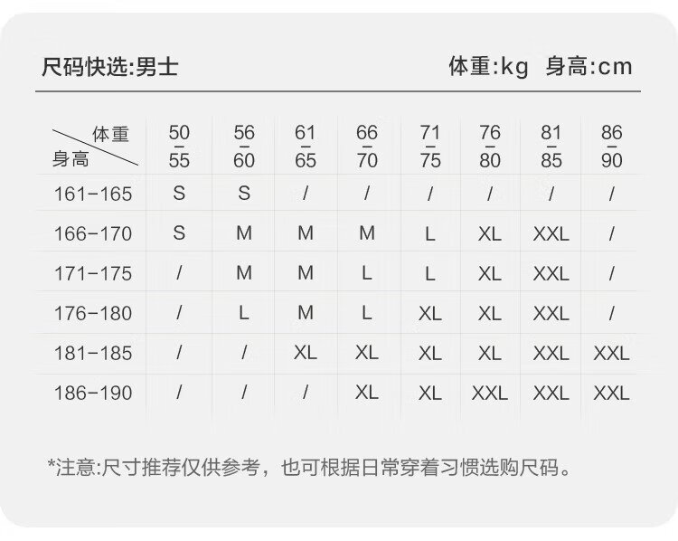 China (cm) 160-165/84-86 165-170 / 88-90 167-172 / 92-96 168-173 / 98-102 170-176 / 106-110