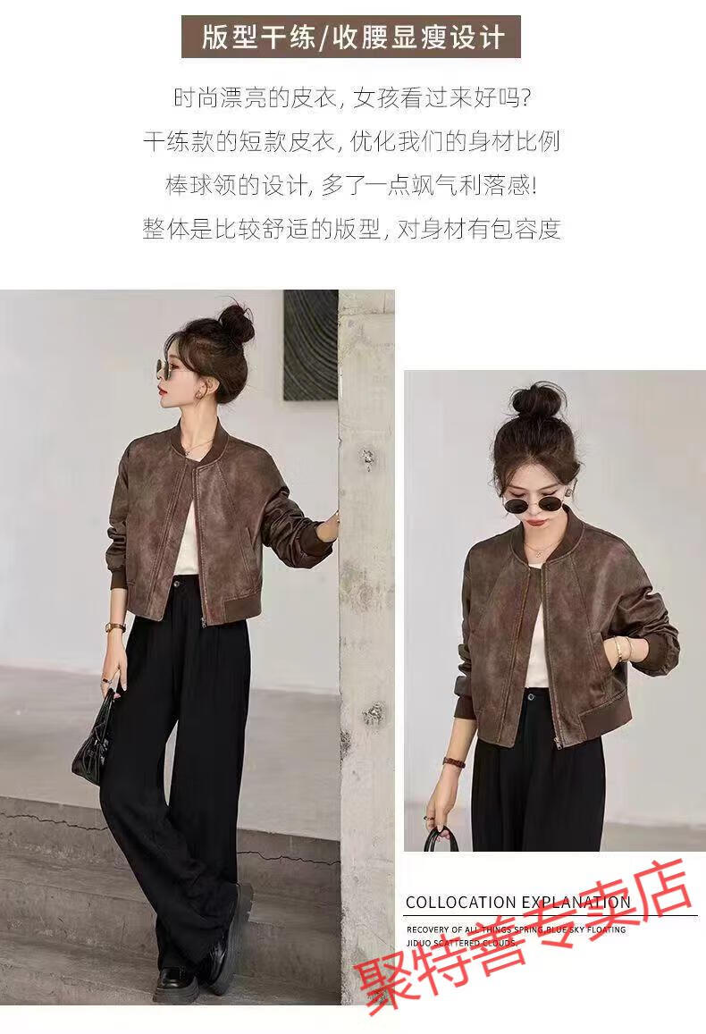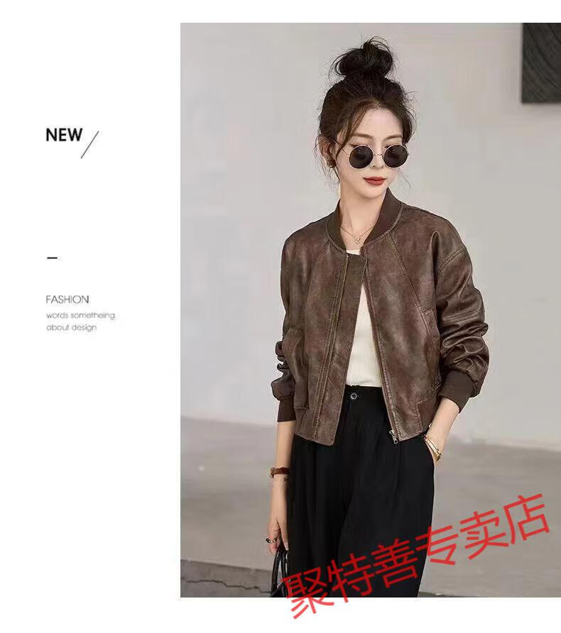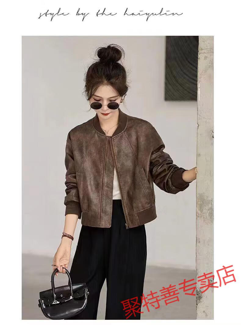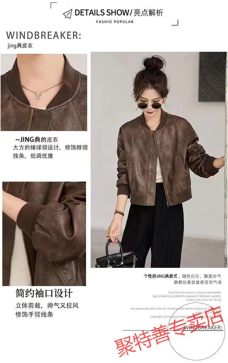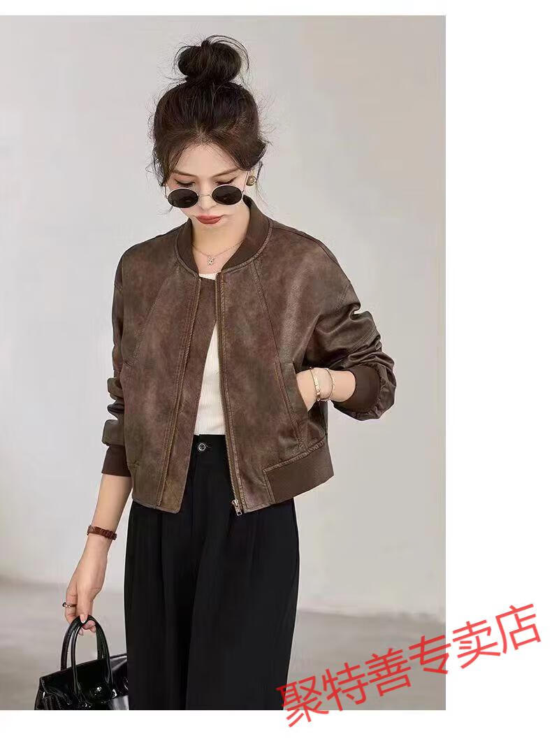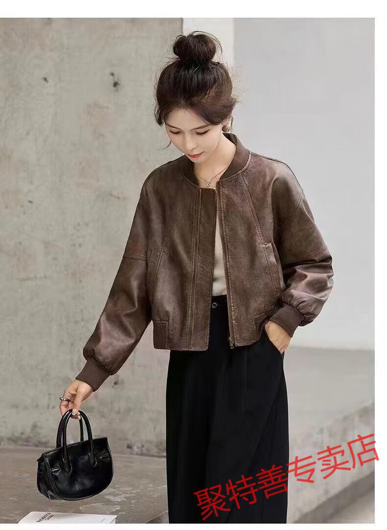 Pierre Cardin Baseball Collar Leather Jacket Women's Short Style Small Spring and Autumn Style Korean Style Motorcycle Leather Jacket Retro Slim Versatile Short Style Brown B (Recommended by the Store Manager) L 90-105Jin Jin equals 0.5 kg