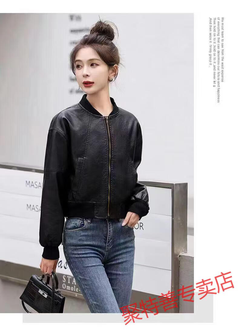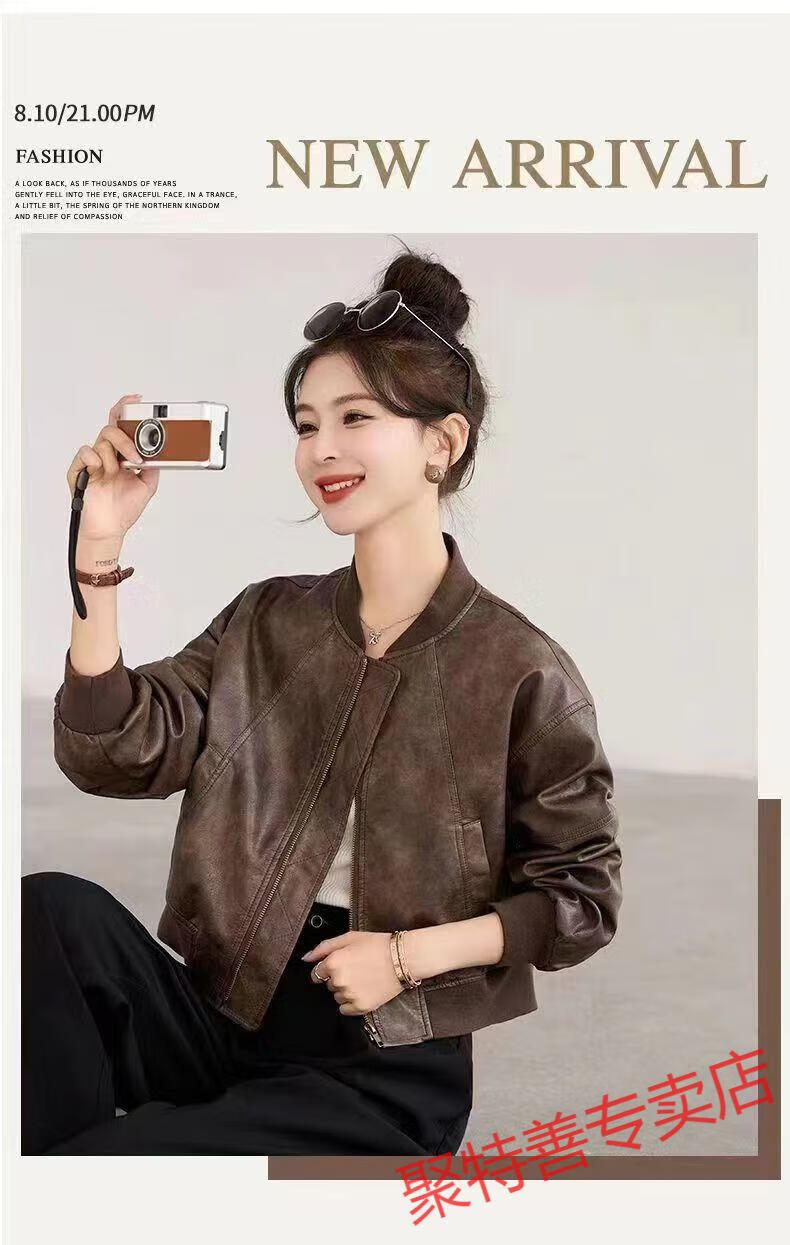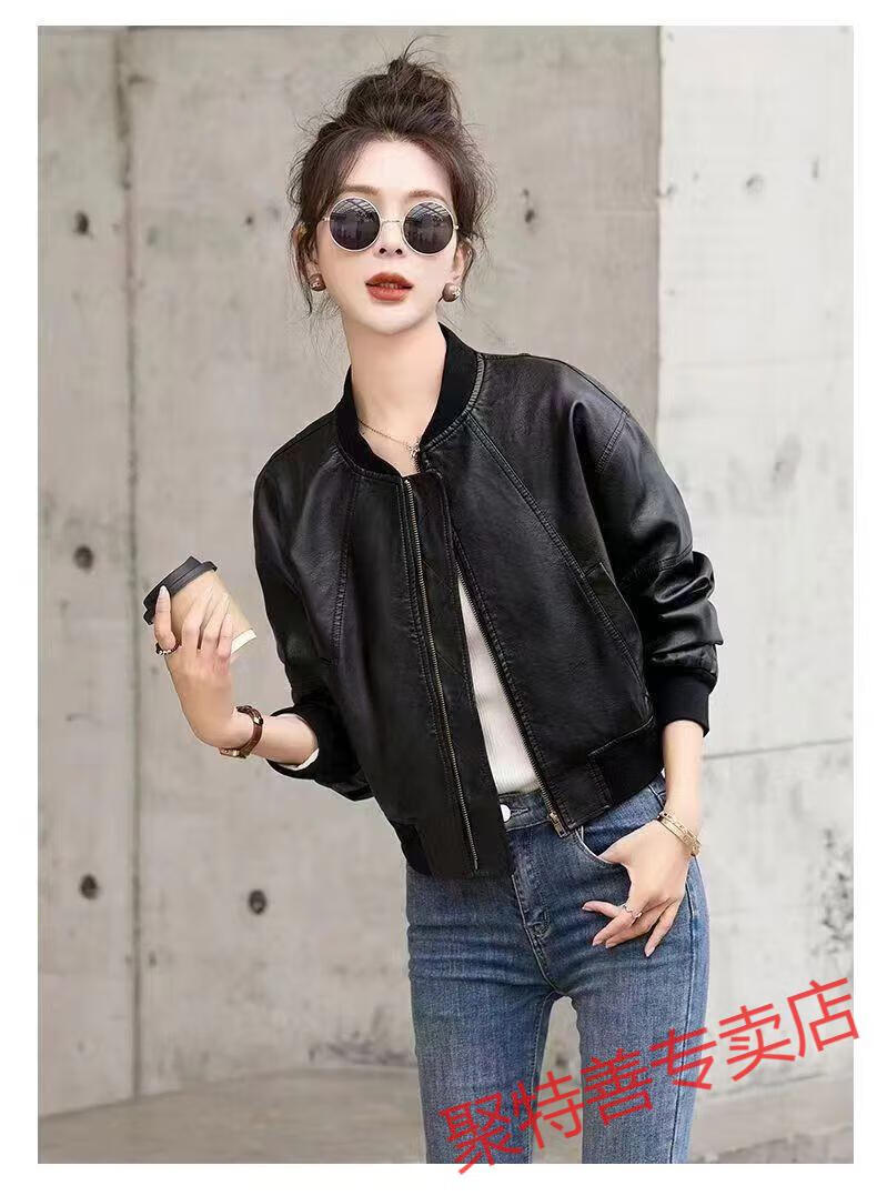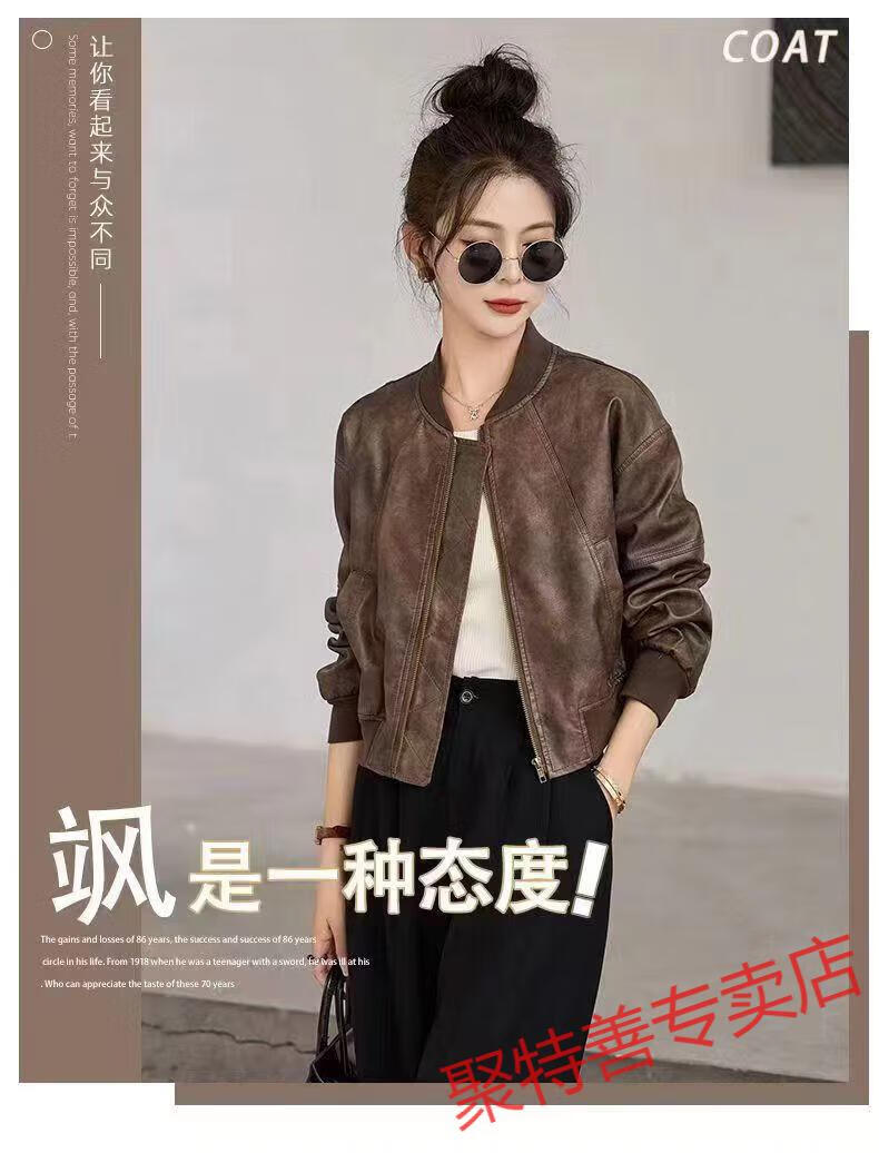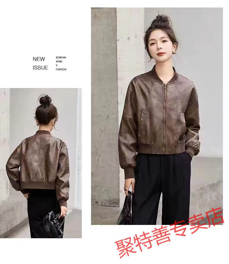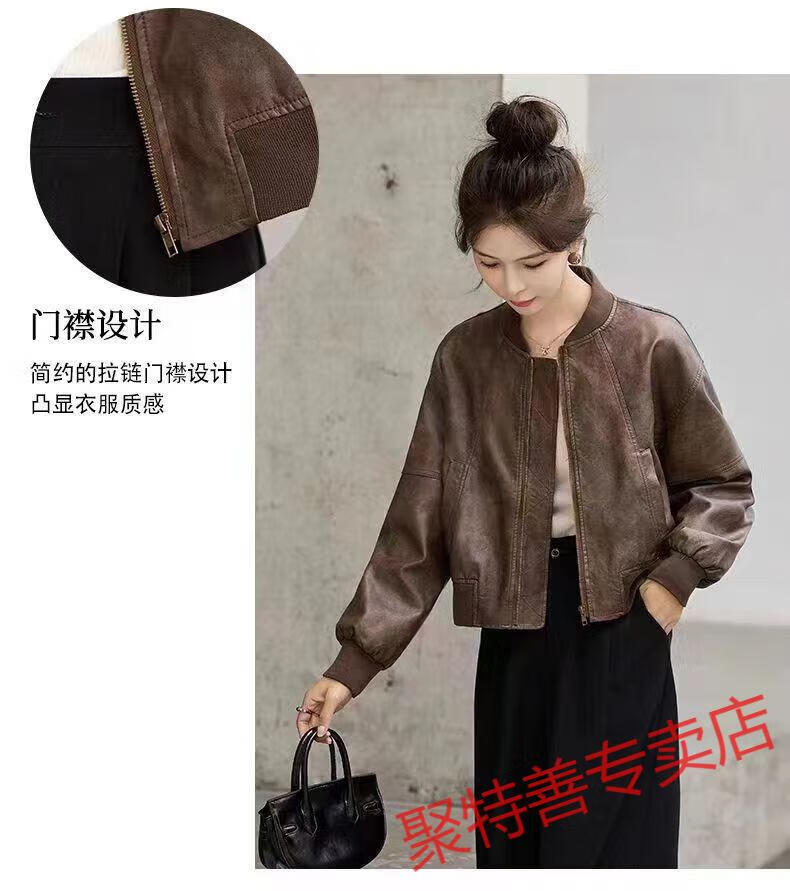 Pierre Cardin Baseball Collar Leather Jacket Women's Short Style Small Spring and Autumn Style Korean Style Motorcycle Leather Jacket Retro Slim Versatile Short Style Brown B (Recommended by the Store Manager) L 90-105Jin Jin equals 0.5 kg