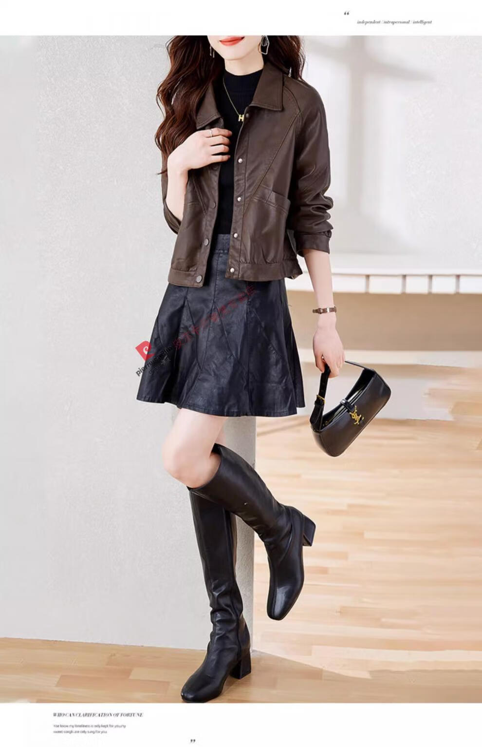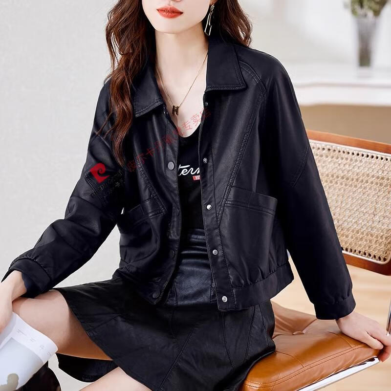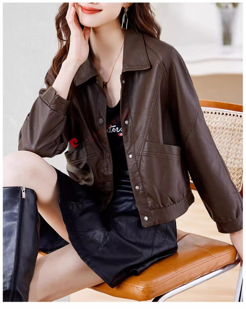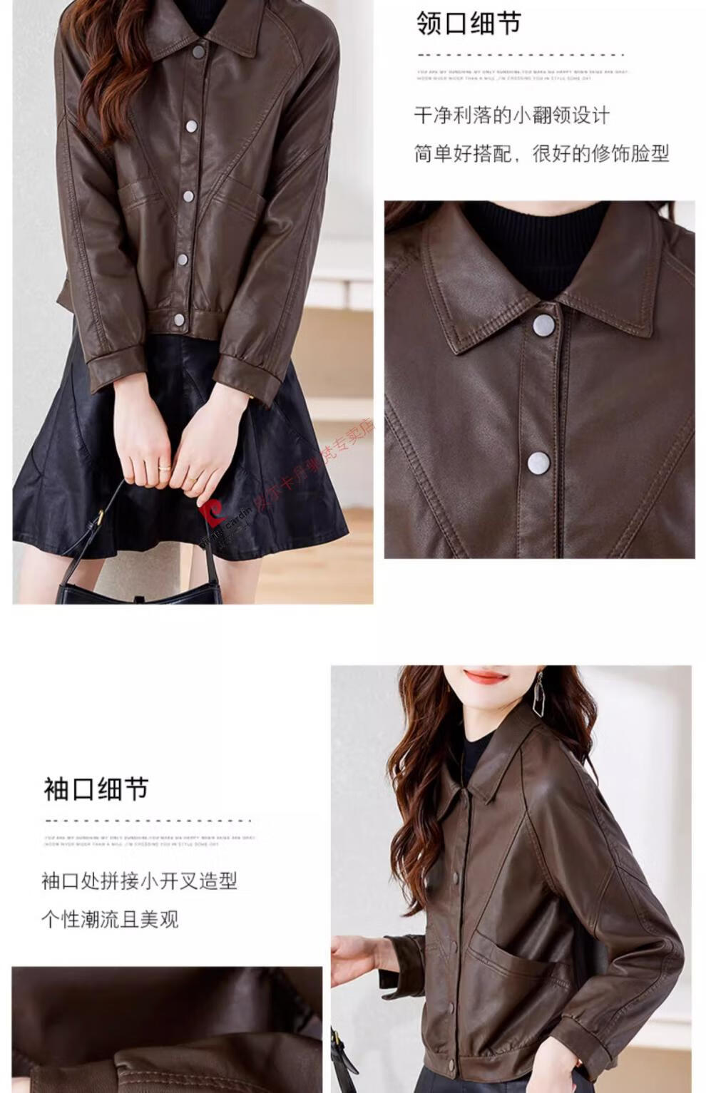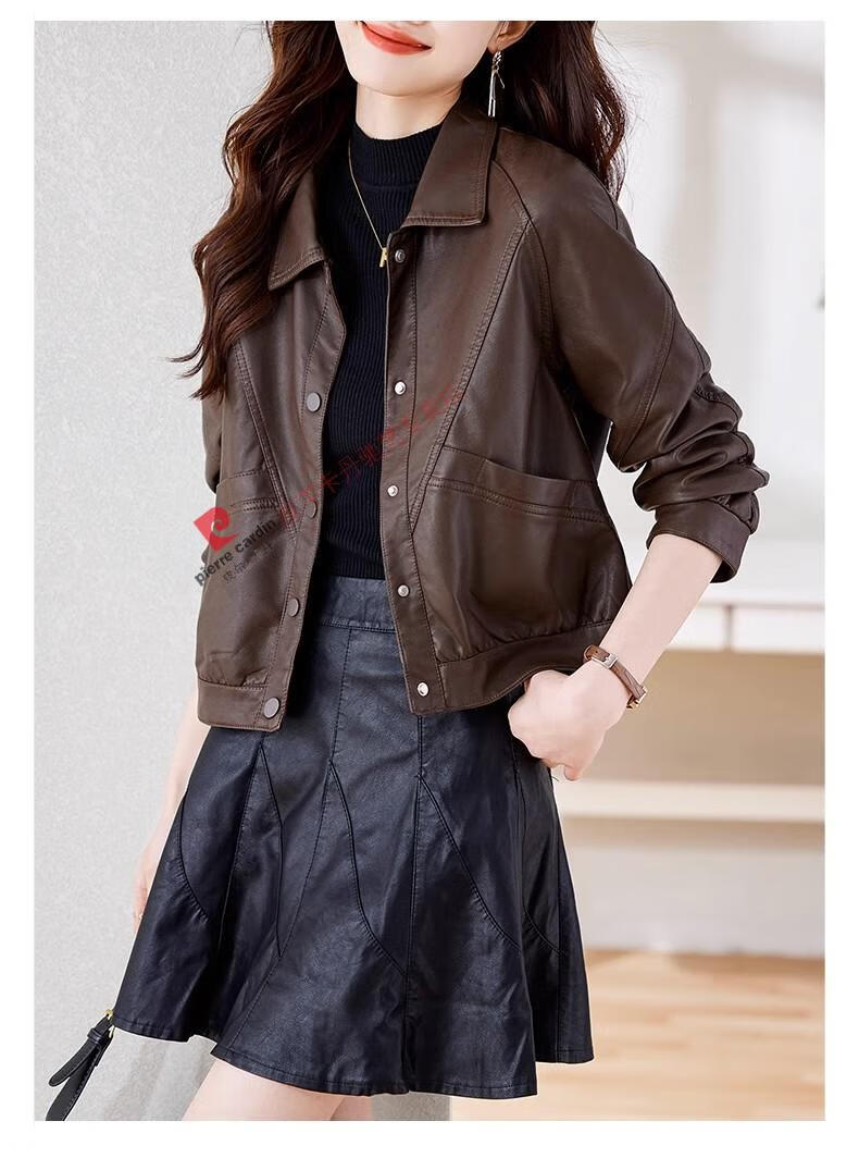 Pierre Cardin Motorcycle Leather Short Jacket Women's 2025 Spring and Autumn New Style Fashionable Small Leather Jacket Top Versatile Classic Brown M