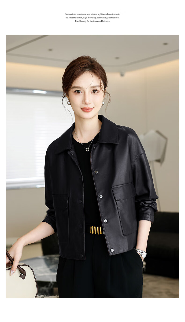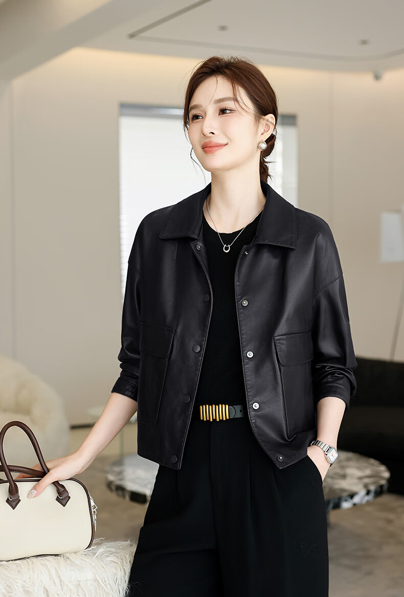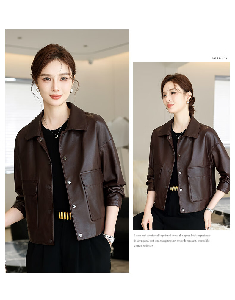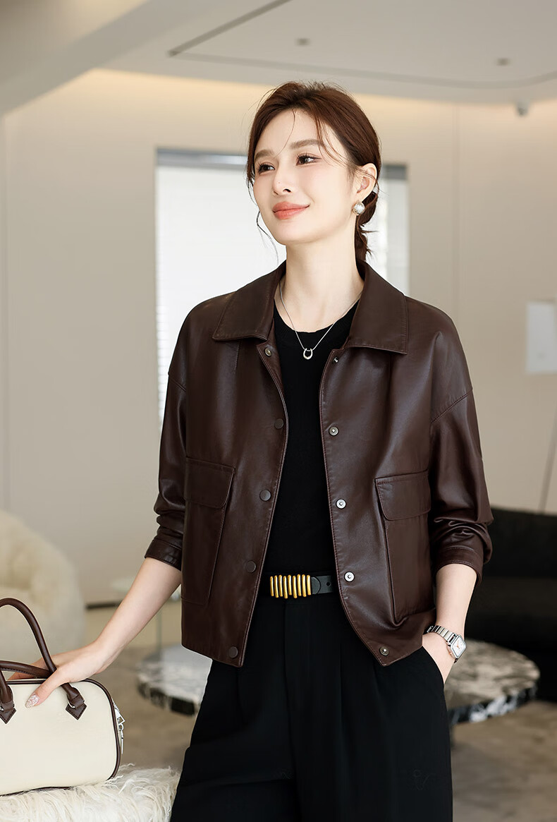 Lingfaner Haining genuine leather small leather jacket for women 2024 new spring and autumn casual first layer sheepskin jacket short style red coffee color 3XL