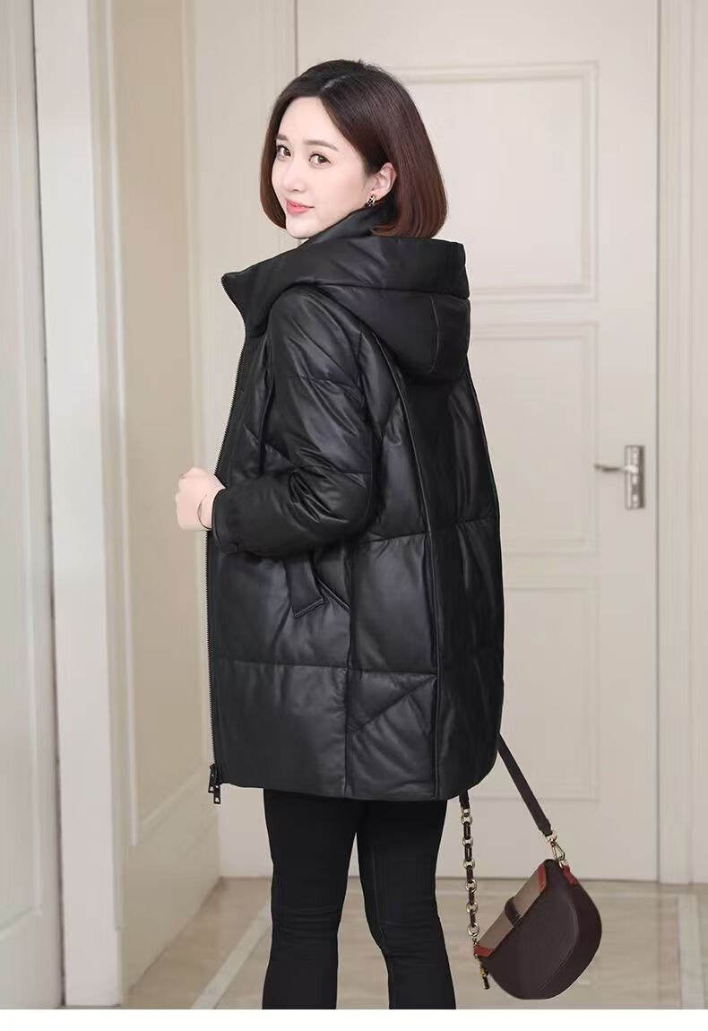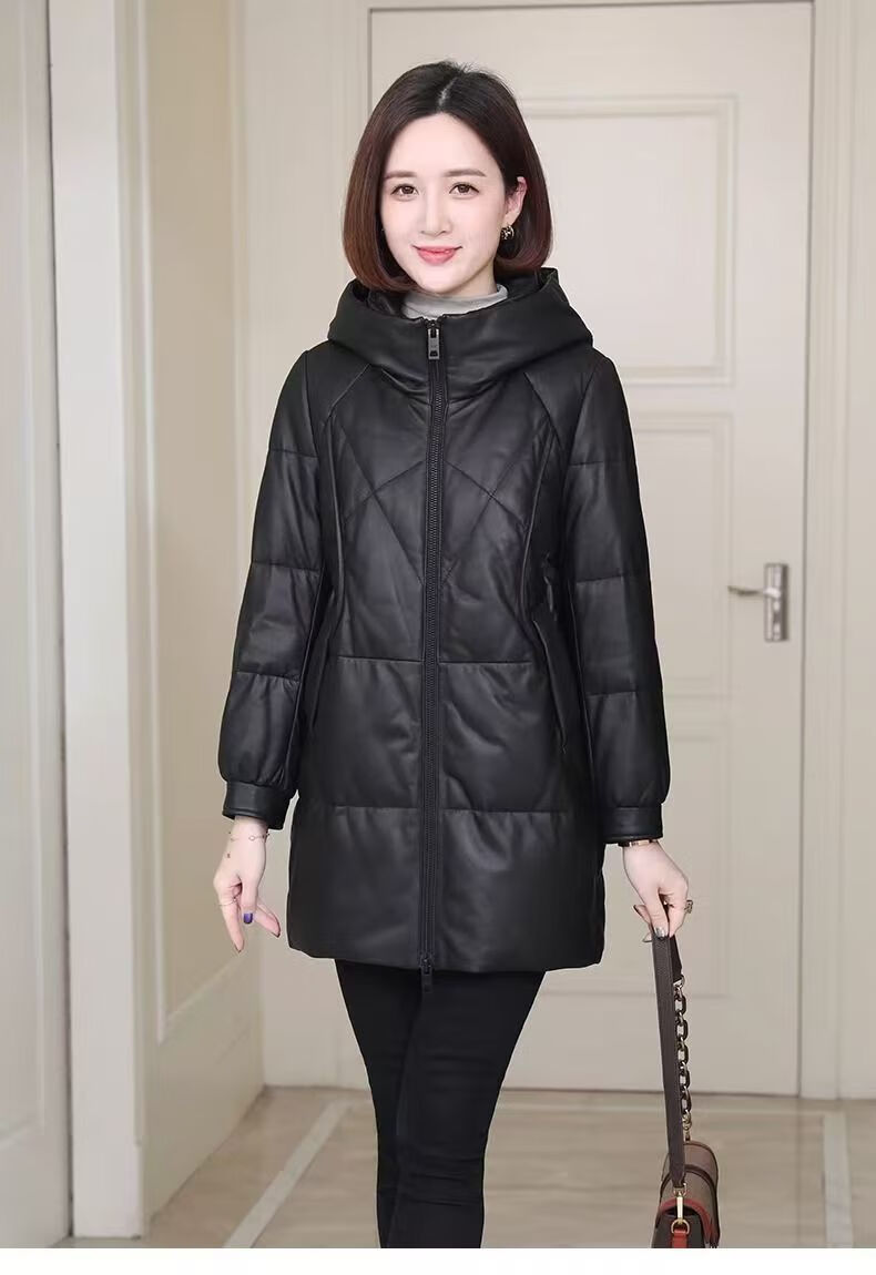 Yunqi Qianqiu Haining genuine leather down jacket women's mid-length 2025 winter new casual hooded sheepskin leather jacket black M recommended 100-115Jin Jin equals 0.5 kg