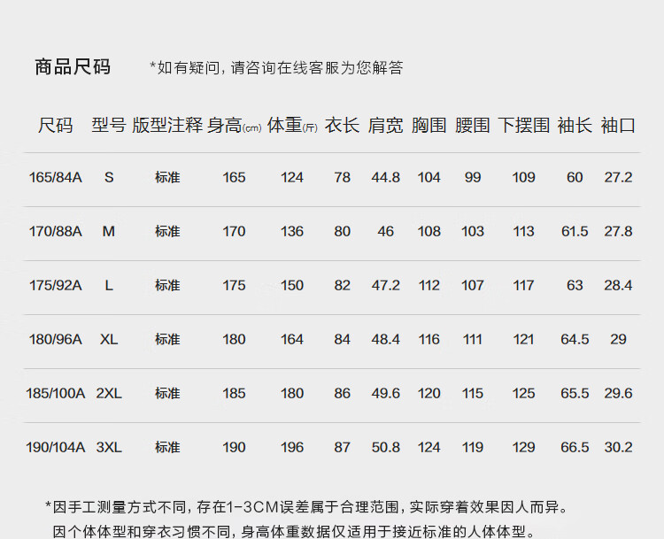 China (cm) 165 / 88-90 170 / 96-98 175 / 108-110 180 / 118-122 185 / 126-130