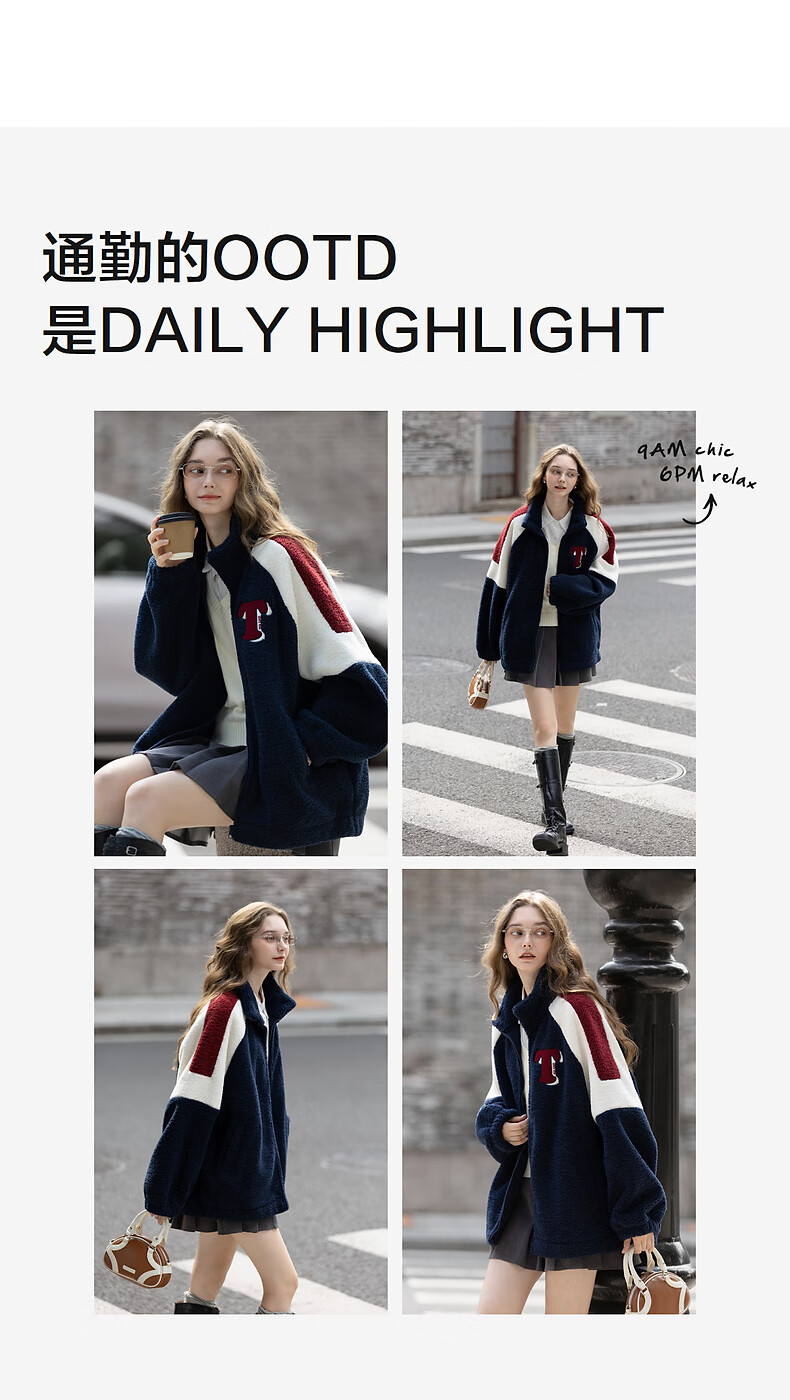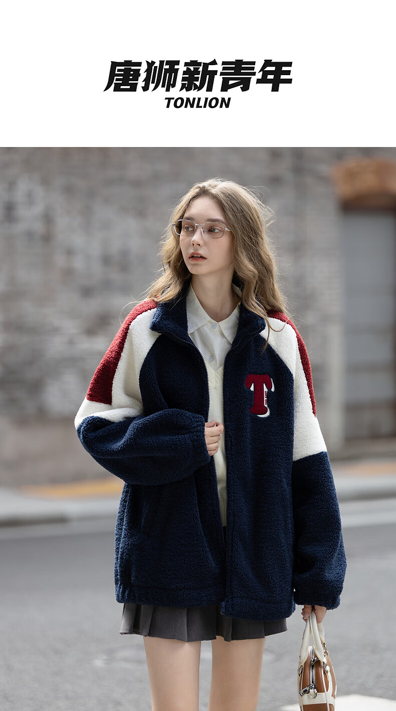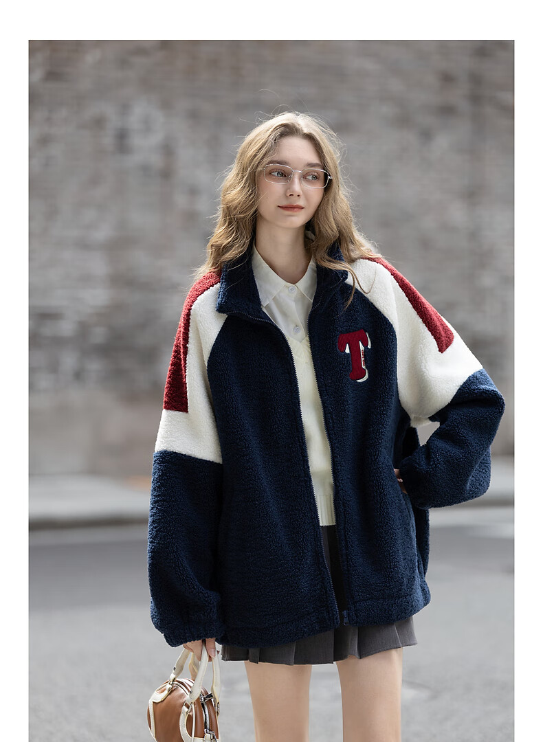 TonLion 2025 Winter Women's Stand Collar Contrast Color Splicing One-Hand-Length Imitation Lamb Hair Jacket