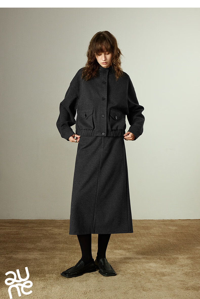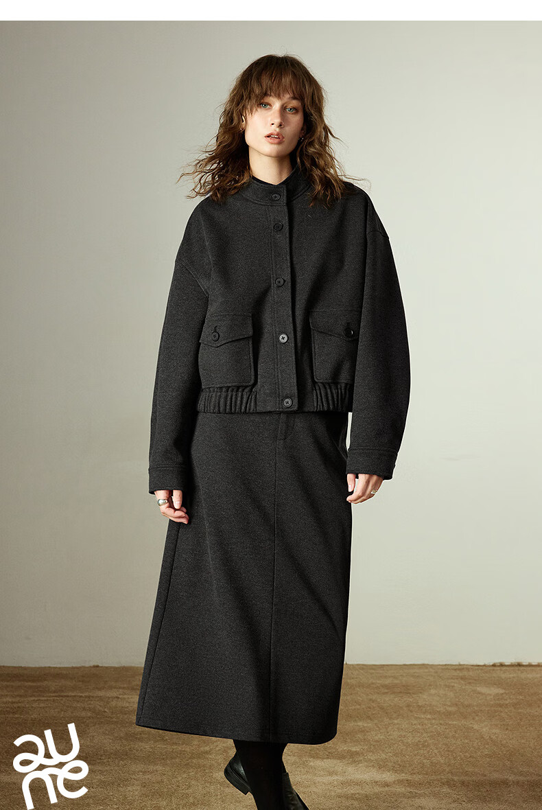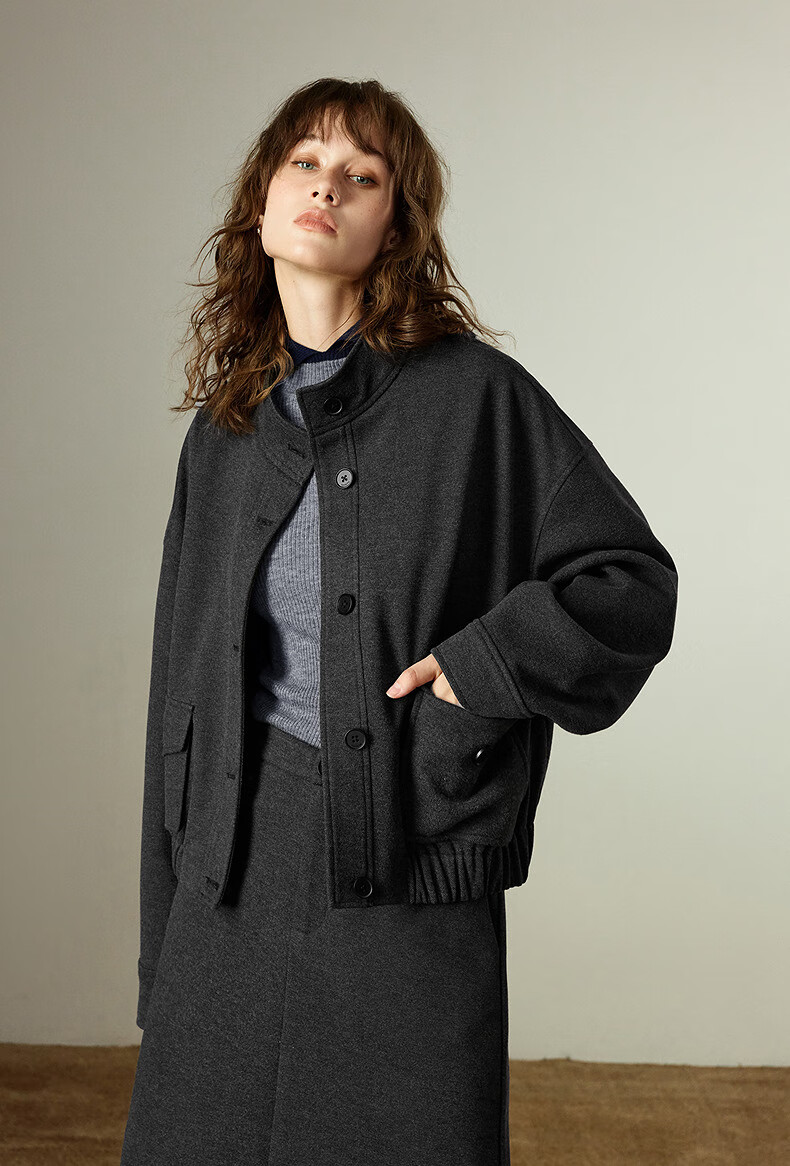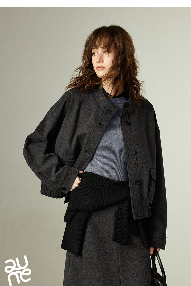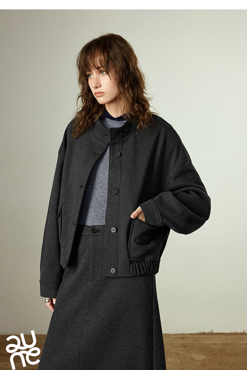 Chuyu Woolen Jacket Women's 2025 Winter New Stand Collar Retro High Intelligence Jacket Loose Top Jacket Black Gray L